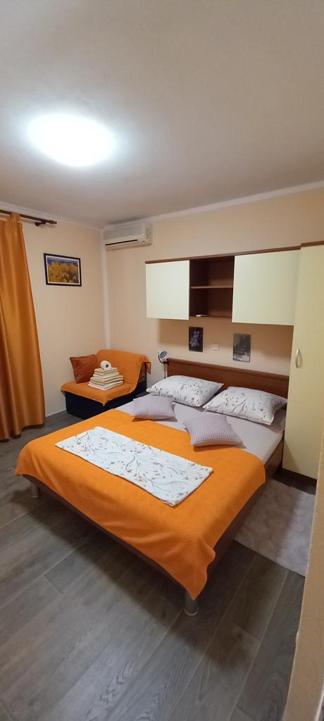 Anlægget er placeret i anden række mod havet, 2 minutters gang til centrum, det samme til den første strand. Studio-app 2 1 har en grundlæggende seng og en lænestol, og Studio 2 2 har en grundlæggende seng og 2 lænestole. Studioapp er plads til 2 personer, studioapp 2 1 plads til 2 voksne og 1 barn, 2 2 to voksne og 1 til 2 børn. Parkering til rådighed, beliggende foran huset. VELKOMMEN!!!