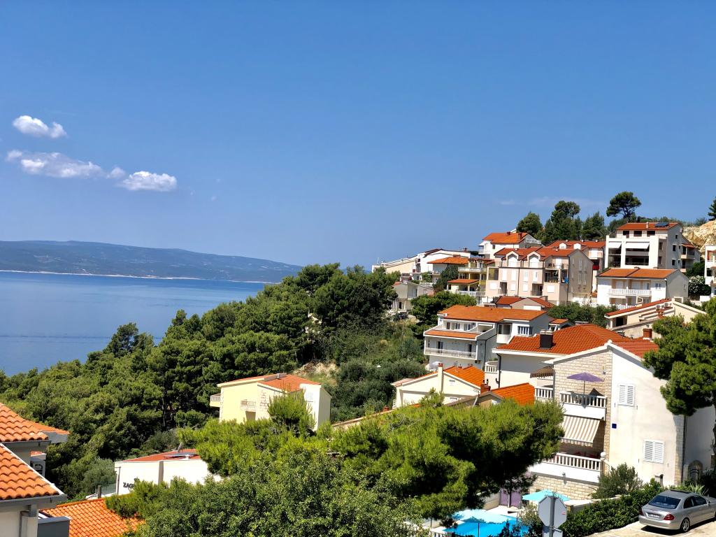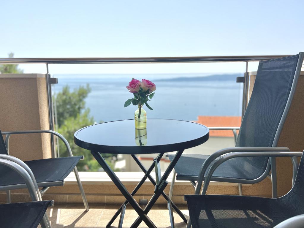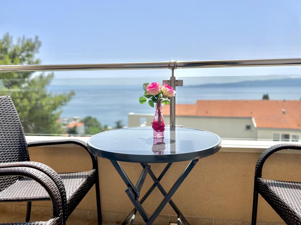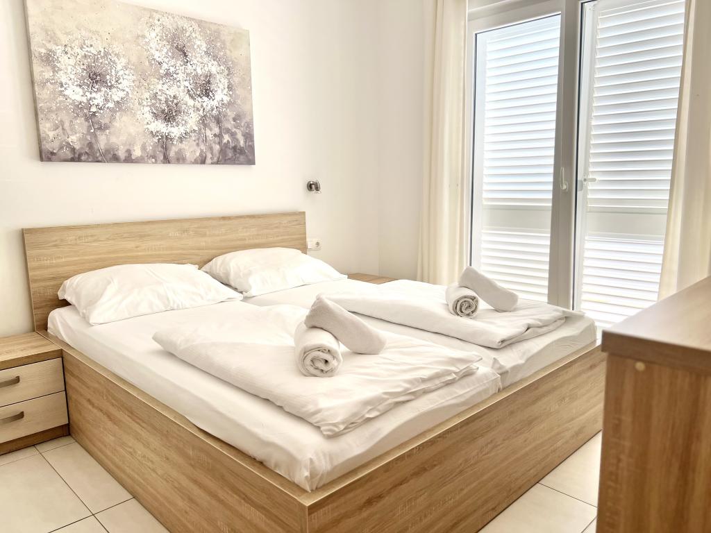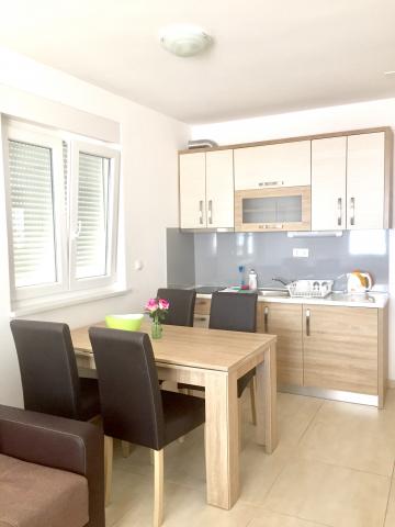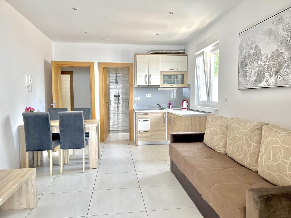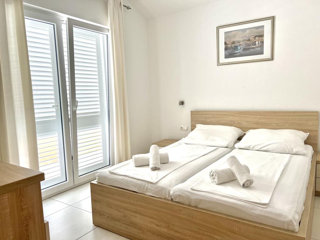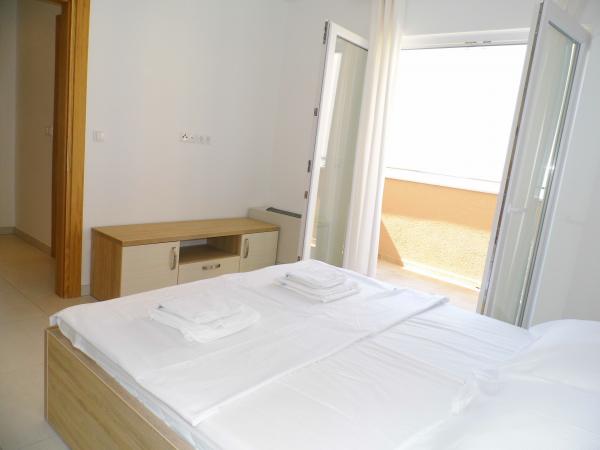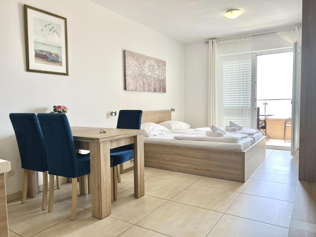 Turistskat er inkluderet i prisen.Den ekstraordinære udsigt fra balkonen er helt sikkert virkeliggørelsen af dine drømme. Gennem glasset på altanens rækværk kan du altid nyde udsigten over Adriaterhavet. Sengene i lejligheden har en behagelig størrelse på 1,60 m bred og 2,00 m lang. Du behøver ikke bekymre dig om sengelinned og håndklæder. Prisen inkluderer en regelmæssig skift af sengelinned og håndklæder. Du kan friske op på badeværelset efter din ferie på havet. Det moderne design af vores badeværelse og badekar vil hjælpe dig med dette. Vi har allerede taget hånd om sengelinned og håndklæder, som vi normalt skifter jævnligt og efter anmodning. I køkkenet kan du vise, at du er en kulinarisk stjerne. Til det tilbyder vi dig tallerkener, gryder og fade. Elkedel, proptrækker, glas, kopper og køleskab med til