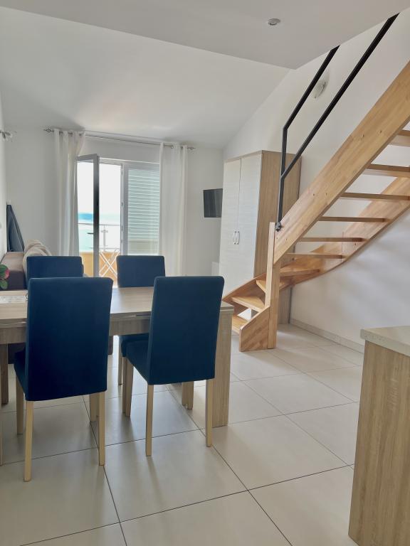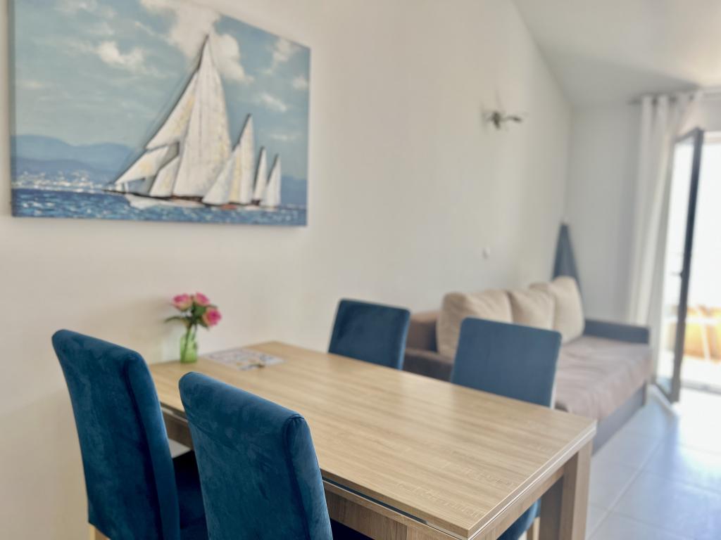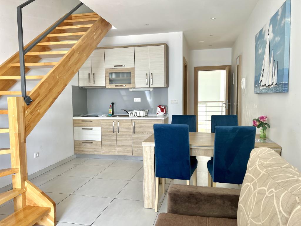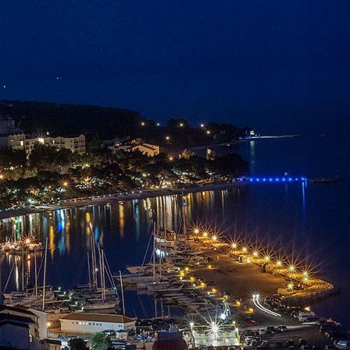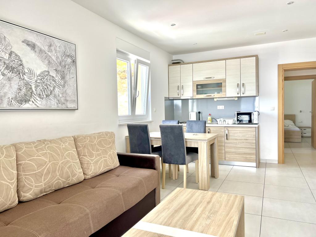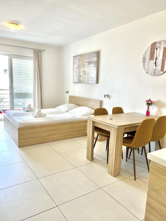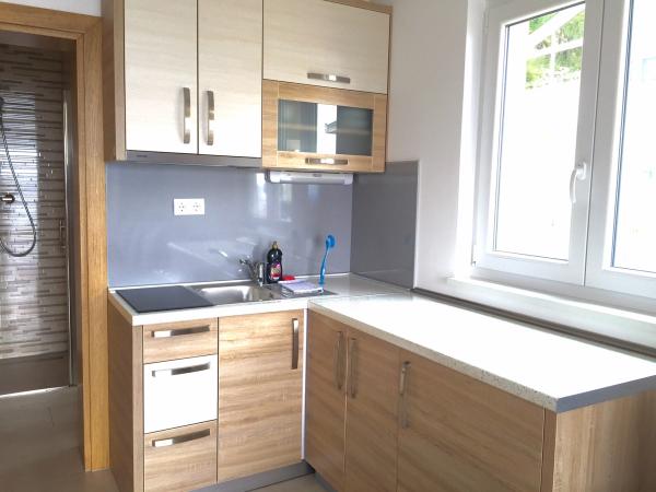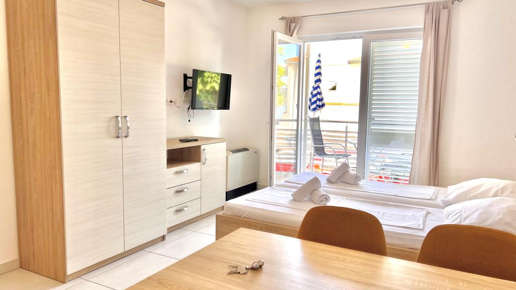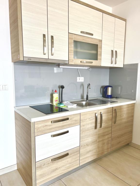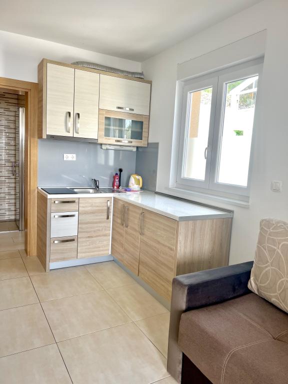 Turistskat er inkluderet i prisen.Den ekstraordinære udsigt fra balkonen er helt sikkert virkeliggørelsen af dine drømme. Gennem glasset på altanens rækværk kan du altid nyde udsigten over Adriaterhavet. Sengene i lejligheden har en behagelig størrelse på 1,60 m bred og 2,00 m lang. Du behøver ikke bekymre dig om sengelinned og håndklæder. Prisen inkluderer en regelmæssig skift af sengelinned og håndklæder. Du kan friske op på badeværelset efter din ferie på havet. Det moderne design af vores badeværelse og badekar vil hjælpe dig med dette. Vi har allerede taget hånd om sengelinned og håndklæder, som vi normalt skifter jævnligt og efter anmodning. I køkkenet kan du vise, at du er en kulinarisk stjerne. Til det tilbyder vi dig tallerkener, gryder og fade. Elkedel, proptrækker, glas, kopper og køleskab med til