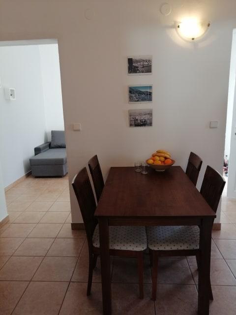 Fremragende beliggenhed. Meget rummelig lejlighed. Meget god kvalitet / prisforhold. 70 euro / dag for 4 personer i løbet af 5 / 11.09.2021. Udstyret køkken. Rene og tilstrækkelige håndklæder. Lejligheden ligger på 1. sal med separat indgang, rummelig terrasse. Afstanden fra havet er cirka 5-7 minutter til fods. Parkering inkluderet i prisen (det er en stor fordel i betragtning af at prisen i området er et sted mellem 5-10 euro pr. Dag)