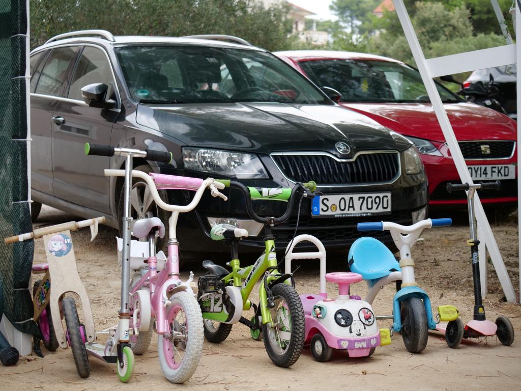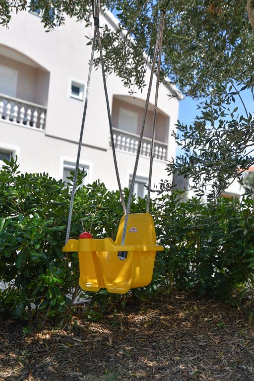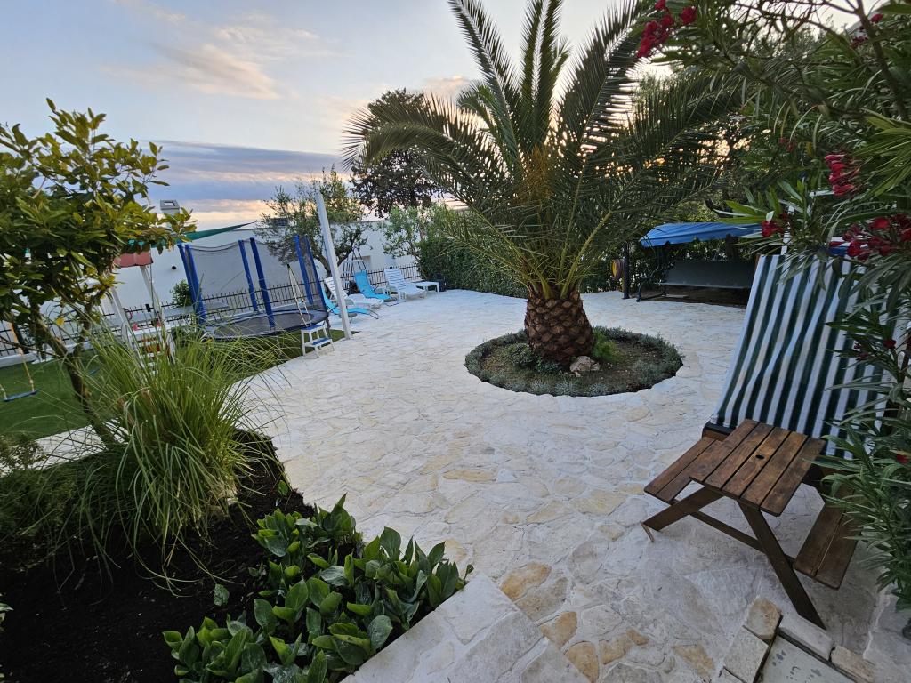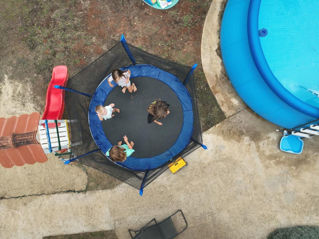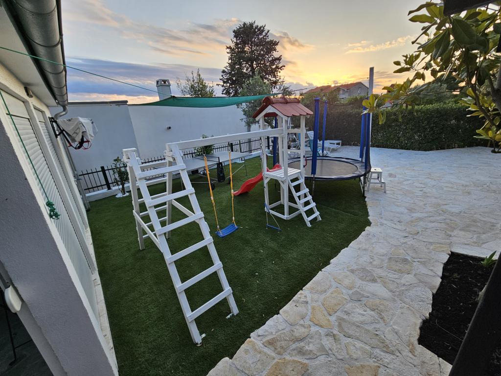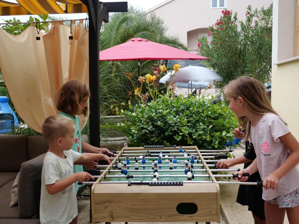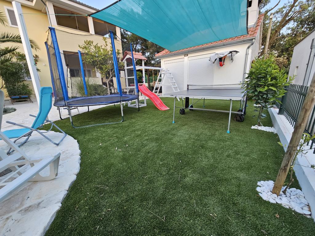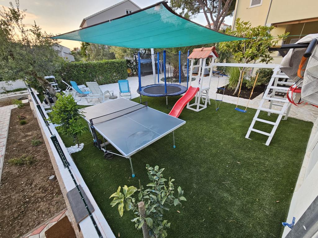 Vores gæster kan frit bruge haven og gårdhaven. Du kan bruge alt, hvad du finder i haven, gratis. Den deles af alle, der bor i vores hus. Du kan finde en swimmingpool, cykler (til børn og voksne, med høje stole), en grill med grill (sac, saće, čripnja), en ismaskine, en frituregryde, 2 køleskabe, en vask, et bærbart elektrisk komfur, træningsudstyr, liggestole med parasoller, et solcellebruser, en havegynge til 4 personer og flere pools (fra den mindste til babyer til den største), børneborde i træ og plastik, et legehus med rutsjebane, stige og gynge, en sandkasse, dart, bordtennis, en trampolin, badminton, en børnegynge og meget andet børnelegetøj.