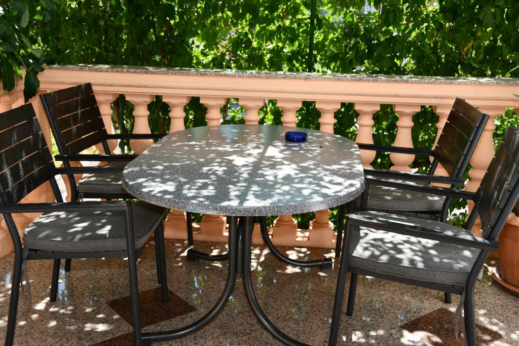 Lejligheden er god, ryddelig, terrassen er fantastisk, der er ingen grund til at bruge aircondition, der er skygge hele dagen. Værten er sød, diskret. En lille klage over badeværelset, det er lille. Stranden er tæt på, og centrum er ikke langt, en let ti minutters gang. Vi var tilfredse. Vi skal dertil igen i år.
