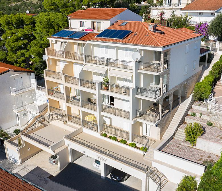 Vores lejligheder ligger skjult fra hovedvejen på en stille gade, men alligevel tæt på centrum af Brela. Kun 200 m adskiller os fra stranden og bymidten, og i umiddelbar nærhed er der alle vigtige faciliteter, hoteller, restauranter, butikker, tennisbaner, alt hvad der vil gøre dit ophold mere behageligt og uforglemmeligt. Vores lejligheder i Brela har en smuk udsigt over havet og de nærliggende øer. Vi tilbyder dig 7 lejligheder, og der er parkering til dine biler. Lejlighederne har: soveværelse, stue, køkken, badeværelse med brusebad eller badekar, WI FI, aircondition, satellit-tv, balkon og parkeringsplads.