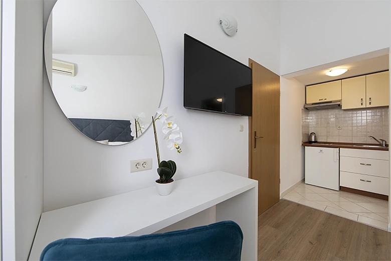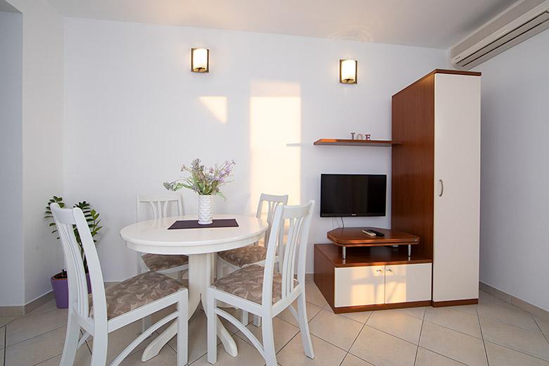 Studiet er meget rent, affald afhentes hver dag, håndklæder skiftes efter behov. Udstyret er smukt, moderne, alt fungerer. Køkkenet er lille, udstyret er også velegnet til dette - kun det væsentlige. Altanen egner sig kun til at sidde om morgenen, da det bliver for varmt i løbet af dagen. Airconditionen fungerer perfekt. Wi-Fi-forbindelsen har en tendens til at blive afbrudt i myldretiden om aftenen. Værterne er meget venlige og hjælpsomme. Stranden er meget smuk og byder på en masse skygge; især Punta Rata. Havet er rent, smukke farver.