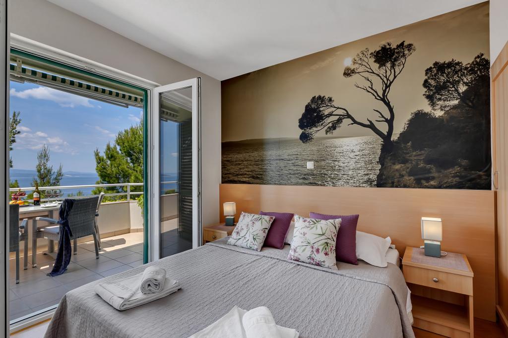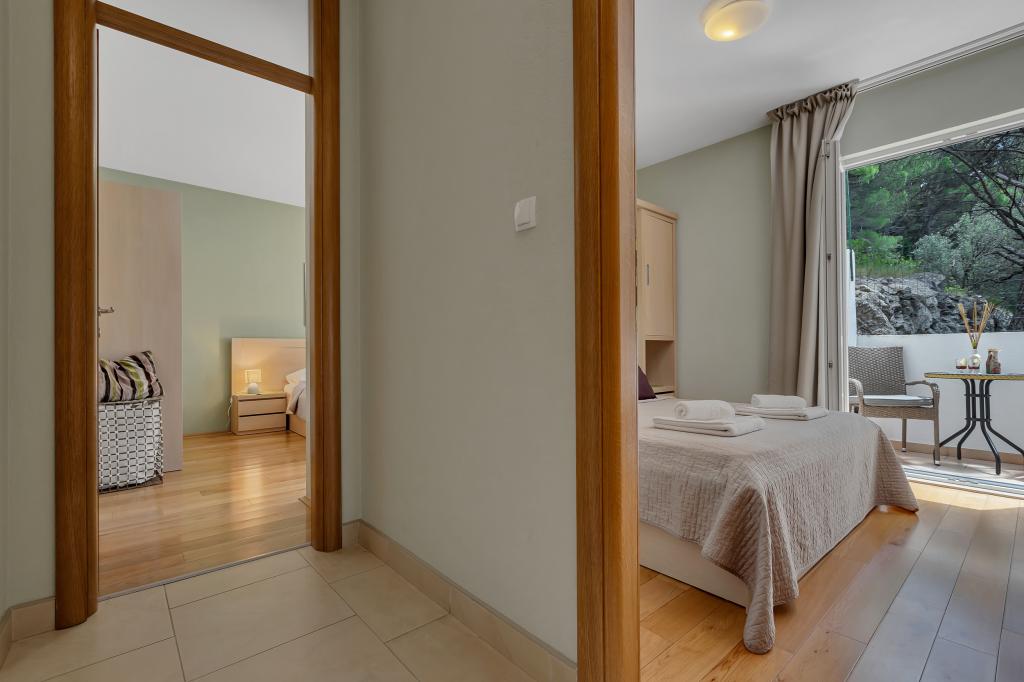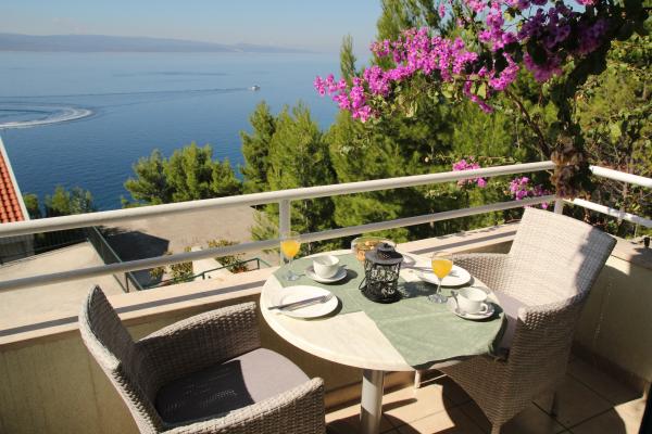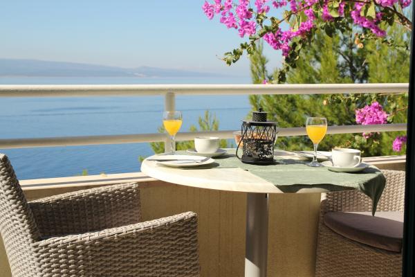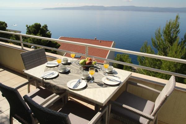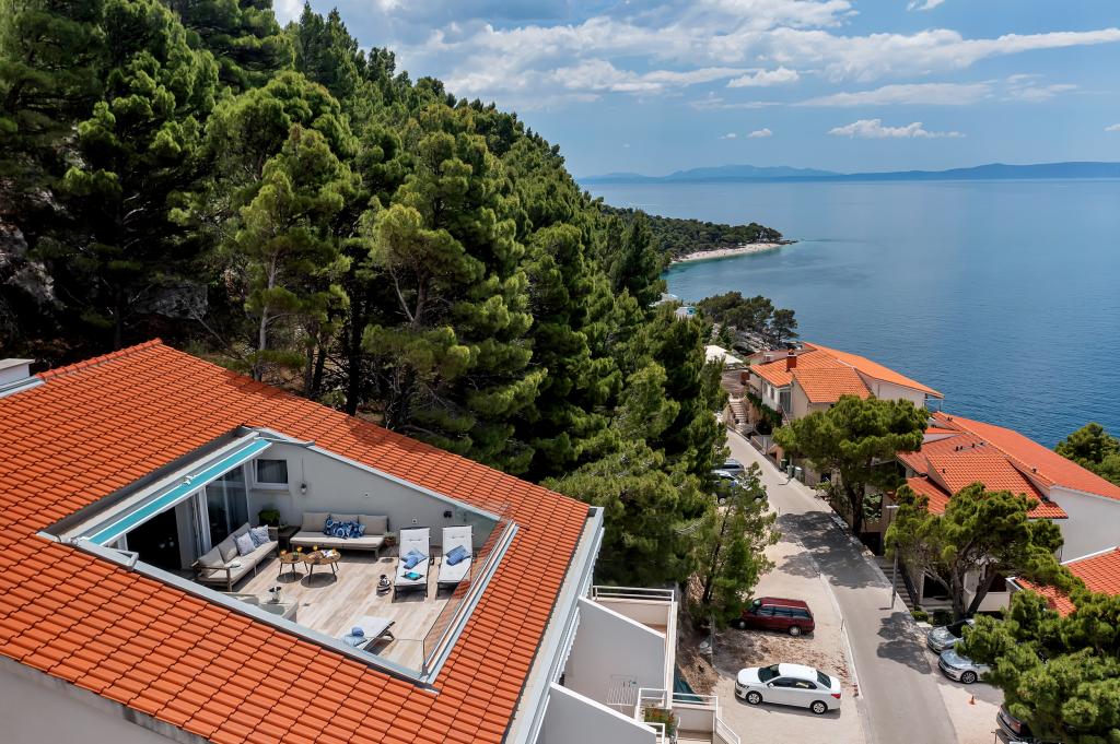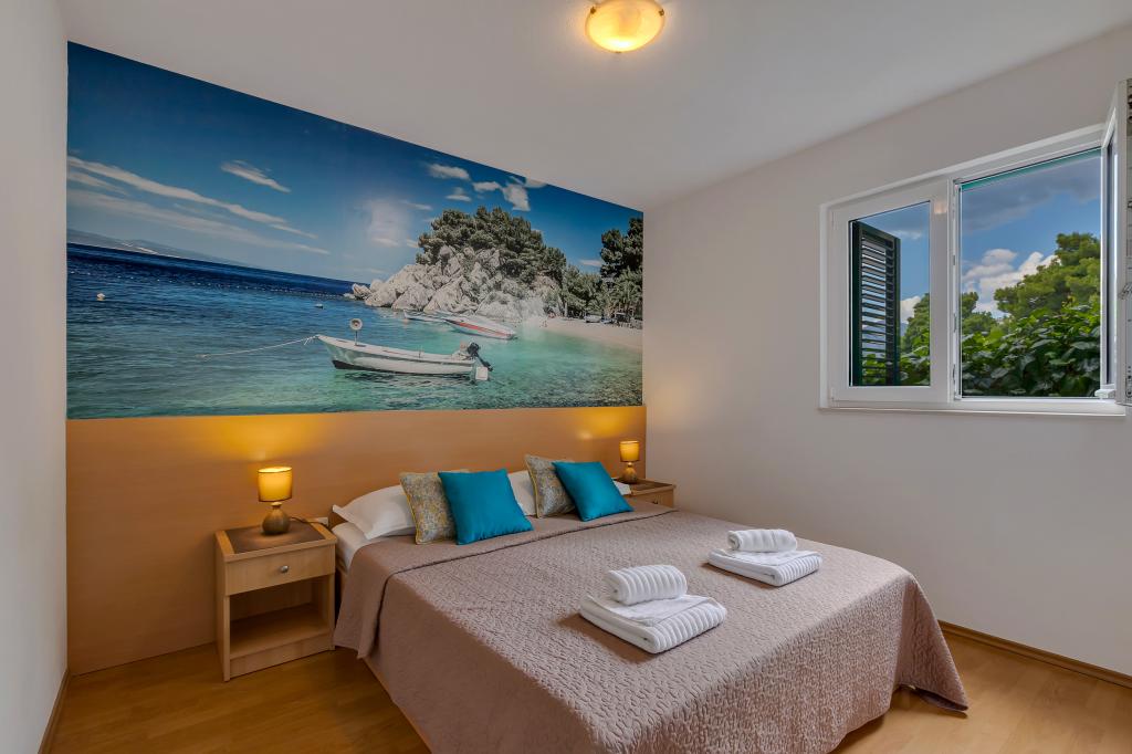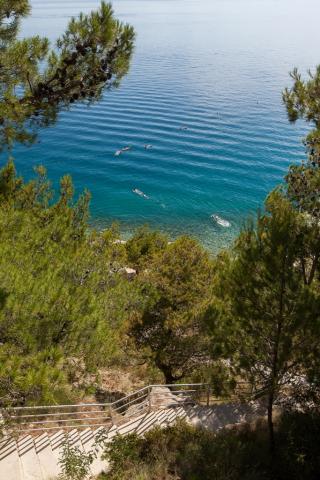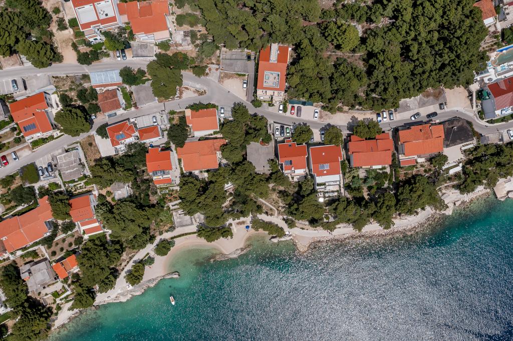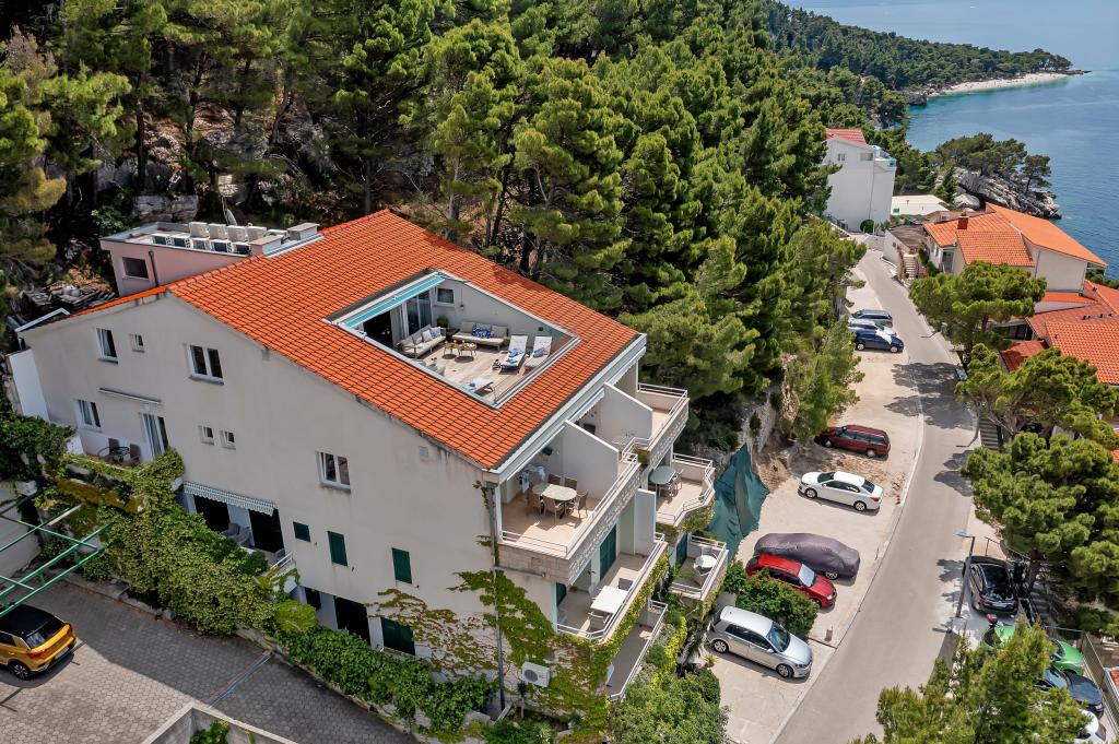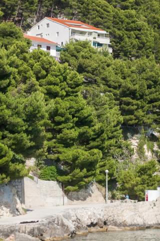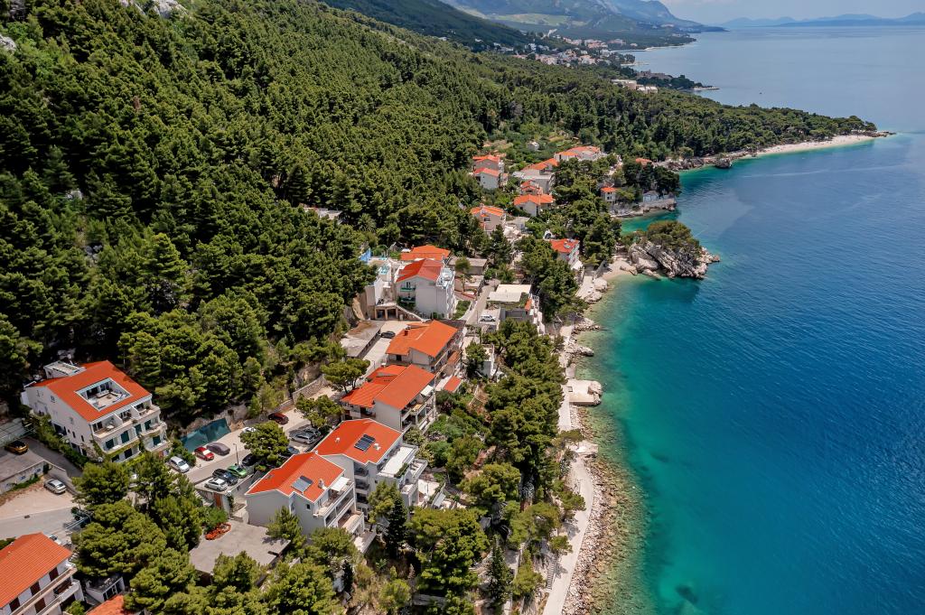 Vores hus ligger i en rolig og grøn del af Brela, beliggende 50 meter fra havet. Stranden, som ligger lige under huset, kan nås via private trapper. Den berømte Punta rata strand ligger cirka 500 meter fra huset, og byens centrum er cirka 10-15 minutters gang gennem det smukke landskab ved havet. Alle lejligheder har aircondition og har satellit-tv og internetadgang.