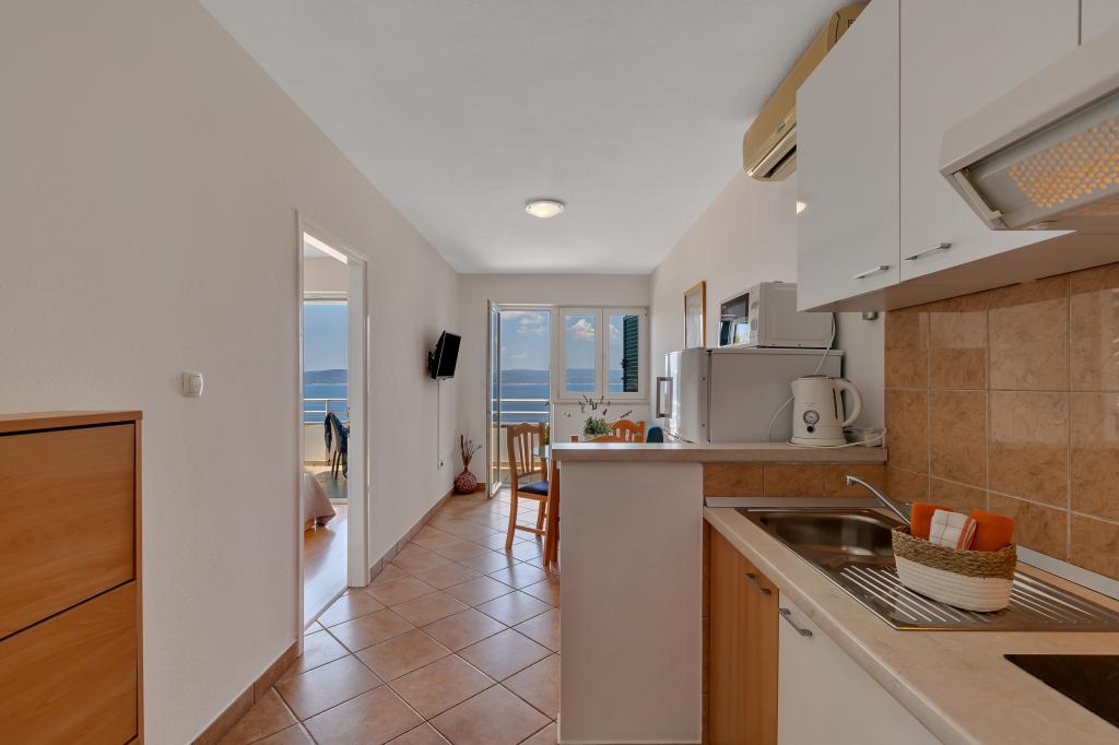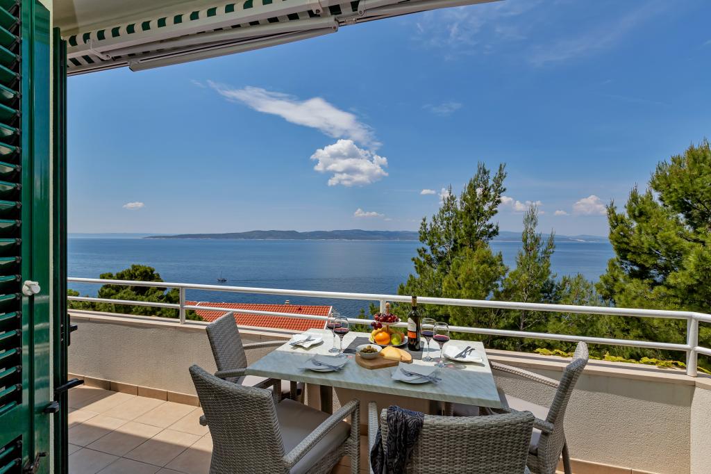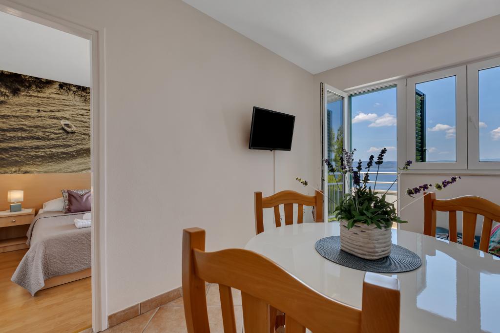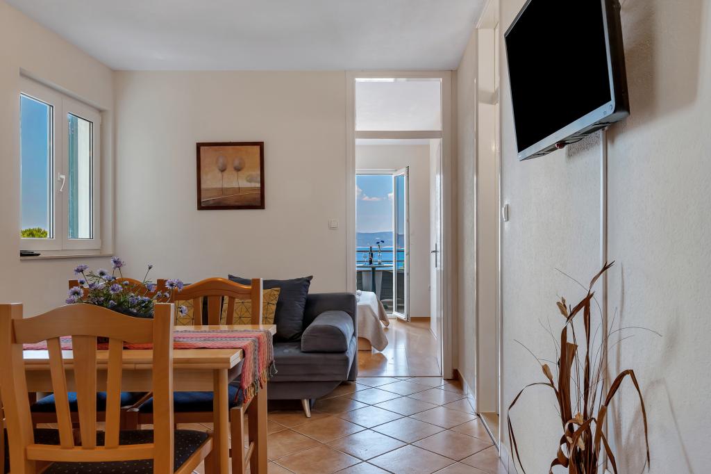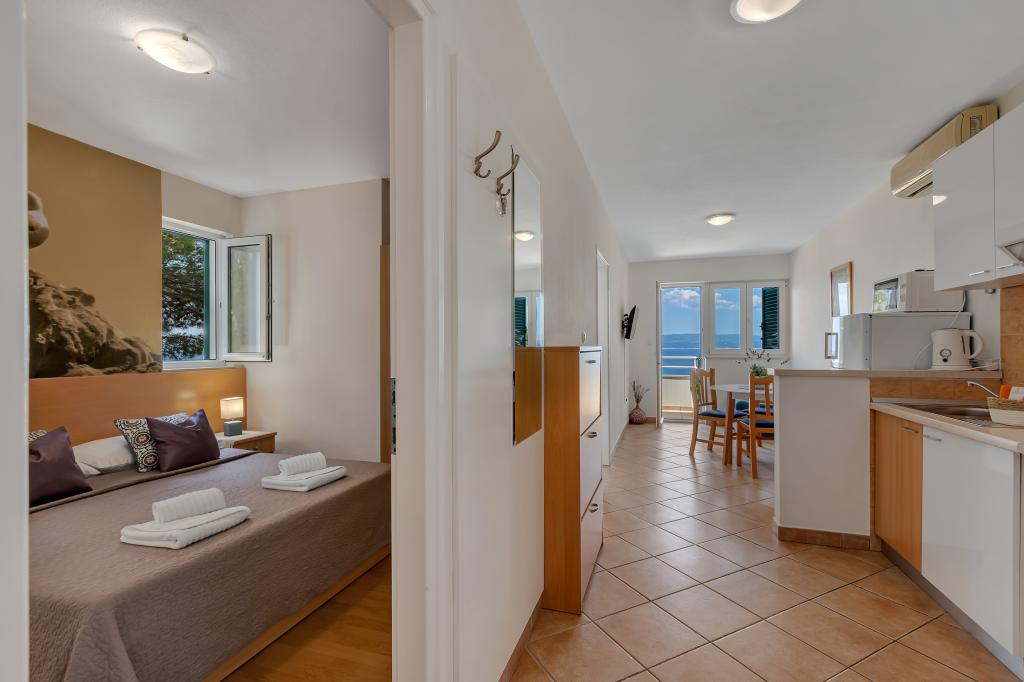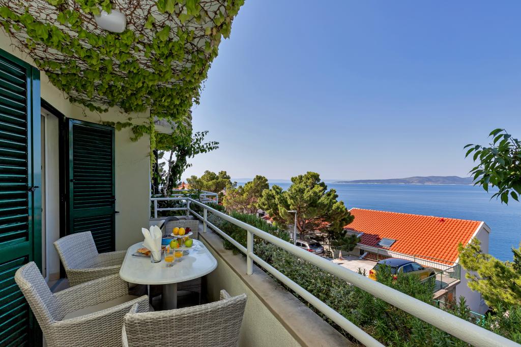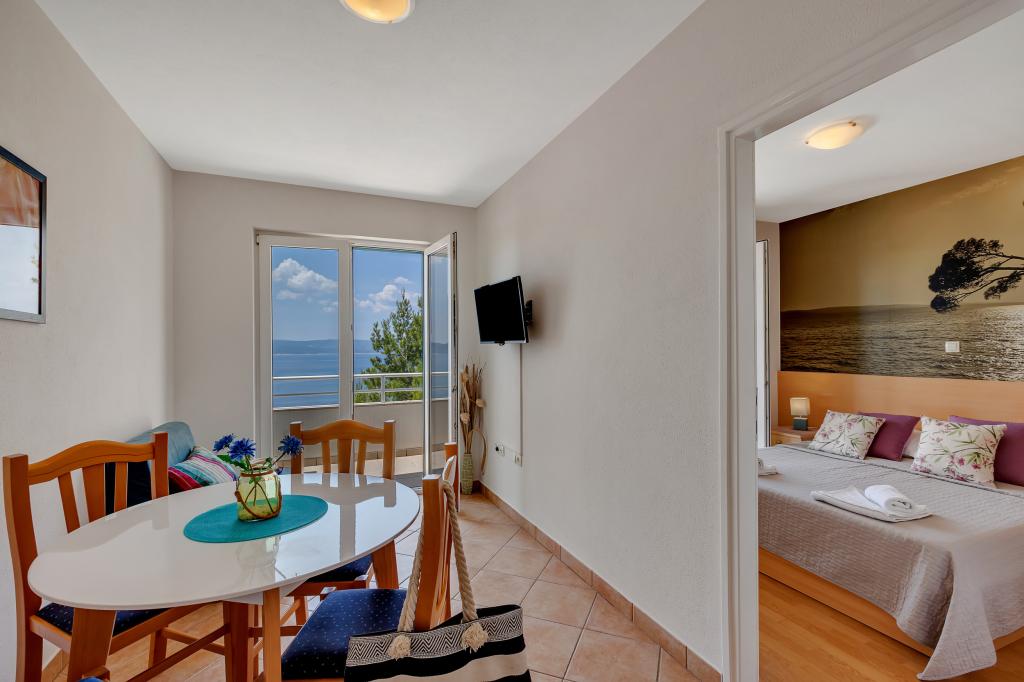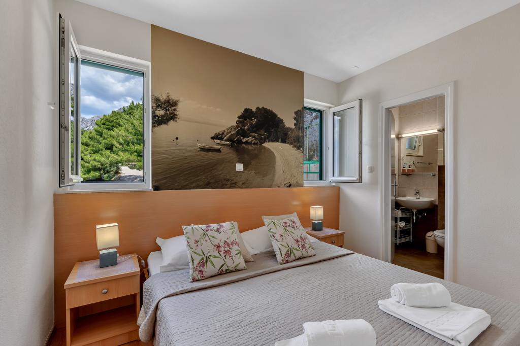 Vores hus ligger i en rolig og grøn del af Brela, beliggende 50 meter fra havet. Stranden, som ligger lige under huset, kan nås via private trapper. Den berømte Punta rata strand ligger cirka 500 meter fra huset, og byens centrum er cirka 10-15 minutters gang gennem det smukke landskab ved havet. Alle lejligheder har aircondition og har satellit-tv og internetadgang.