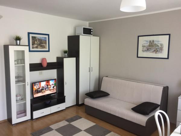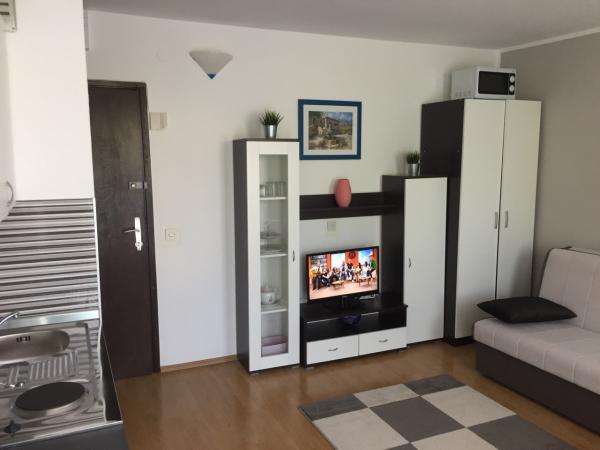 Ferielejligheder Skalinada 1 og 2 er fuldt udstyrede og moderne lejligheder, på størrelse med 30 m2. Lejlighederne kan mageligt rumme tre voksne eller et par med to små børn. Begge lejligheder består af en lille stue med en sovesofa til én person eller højst to små børn, stue med sovesofa - velegnet til to voksne, et køkken, der er udstyret med et køleskab, komfur, kaffemaskine, komfur, nødvendigt service, bestik, spisestue - bord med 4 stole, badeværelse med bruser, vaskemaskine, hårtørrer, håndklæder og terrasse, som er udstyret med bord og stole. Lejlighederne har aircondition. Device Features: TV / Kabel / Internet er tilgængeligt i bygningen. Parkeringsplads. Renoveret. Inkluderet: slutrengøring. Lejligheden er beliggende i centrum, tæt på stranden, barer, restauranter, fastfood, underholdning for børn, sportsbaner og andre faciliteter. Vi glæder os til at se dig!