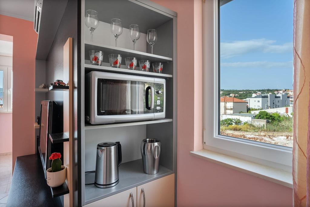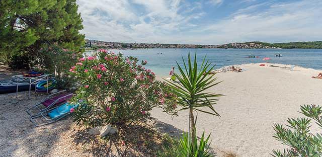 På den nærliggende strand kan du leje en båd, scooter, vandcykel, liggestole og parasoller eller tage på organiserede ture til nærliggende øer. Der er også en bådlinje, der sejler til Trogir hver dag hvert 20. minut.