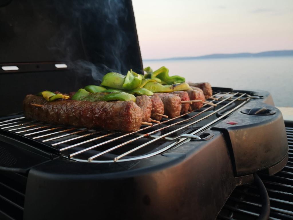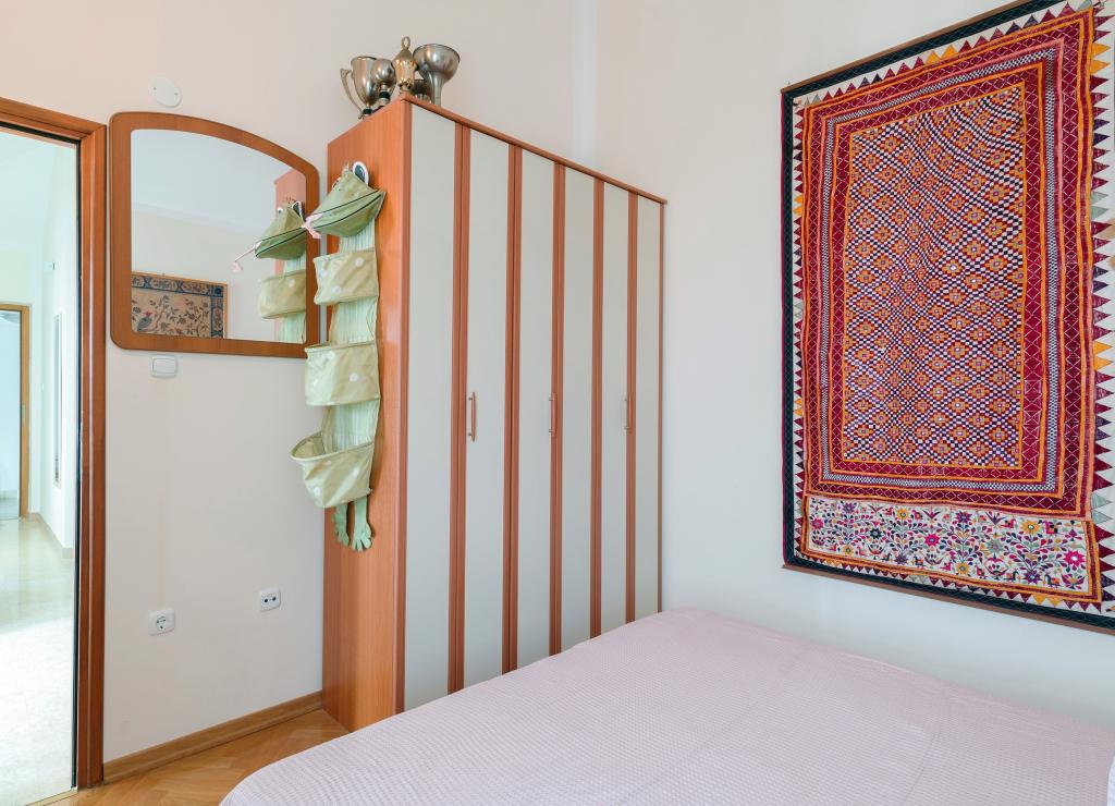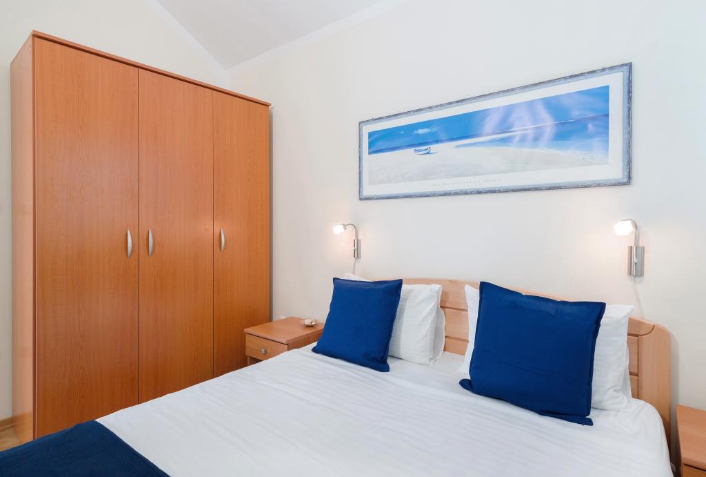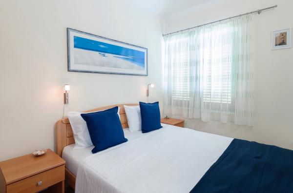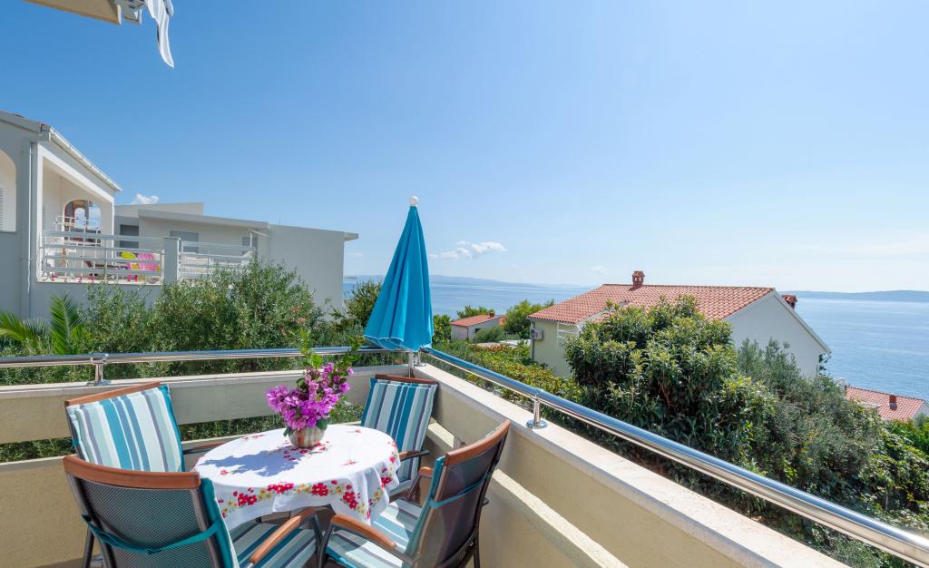 Vi var to i en lejlighed til max mennesker, et soveværelse med en stor seng og en stue med et tekøkken, en sovesofa og adgang til en stor balkon med et bord. Smuk havudsigt, dejlig stor stue. aircondition selvfølgelig. Der ventede kølige drinks på os i køleskabet, i skabene hjemmelavet olivenolie, stegning olie, mel, salt og sukker, vin eddike og peber. Nedenunder en stengrill med et bord ved siden af. Rigelig parkering, tæt på havet og en dejlig familie restaurant (priser lavere end i byen)