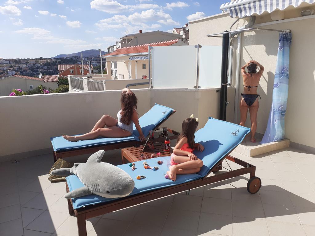 Kære Nina. Tak for din gæstfrihed og den store flair, vi kunne føle i dit hus. Fisken osv. Var også meget god. Hilsen far! Vi kunne virkelig godt lide lejligheden med den store terrasse og udsigten til havet (stjernerne over os om natten), og den var fantastisk smuk. Vi havde alt hvad du behøver. Lejligheden er meget veludstyret. Du kan tage højde for dig selv, og hvis du søger lidt, kan du også finde et par kulinariske og gode restauranter. Det tilrådes også at besøge fiskehallen i Trogir. Du kan grille direkte på terrassen. For at gå ud og spise har du bedre brug for en bil, hvis du vil have noget andet end kun standarderne (pizza osv.). Denne del af okrug er den mere støjsvage. Det var ideelt for os. Vejen til havet er kun kort. Vi gik i svømning hver morgen for at starte dagen og spiste derefter morgenmad på terrassen. Vi lavede flere ture til Trogir / Mlinice Pantan / Salona / Split, i bil og med skib. På Ciovo selv er der også andre naturlige strande til svømning. De nye menneskeskabte strande er ikke vores ting. Samlet set kunne vi virkelig godt lide det. Naturligvis blev hygiejne observeret i huset (Corona-regler). Mange tak, og jeg håber at se dig igen ved godt helbred! Pozdrav Manuel & Tamara