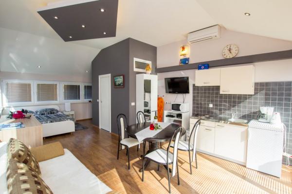 Vi valgte dette studie, fordi en ven anbefalede os det. Og det var en stor beslutning. Værterne var meget søde og hjælpsomme. Studio meget rent og velholdt. Derudover er den udstyret med alt hvad du behøver på ferien. Derudover var der en terrasse med en smuk udsigt, der var fantastisk både dag og nat. Ved ankomsten ventede der en dejlig overraskelse på os i køleskabet, hvilket ikke er en hverdag. Perfekt beliggenhed. 10-15 minutters gang til mange restauranter og hovedstranden, men også tæt på andre smukke strande, der er rigeligt af på øen. 40 minutters gang til smukke Trogir. Vi anbefaler det med god samvittighed og vender gerne tilbage med det samme Knus til hele familien