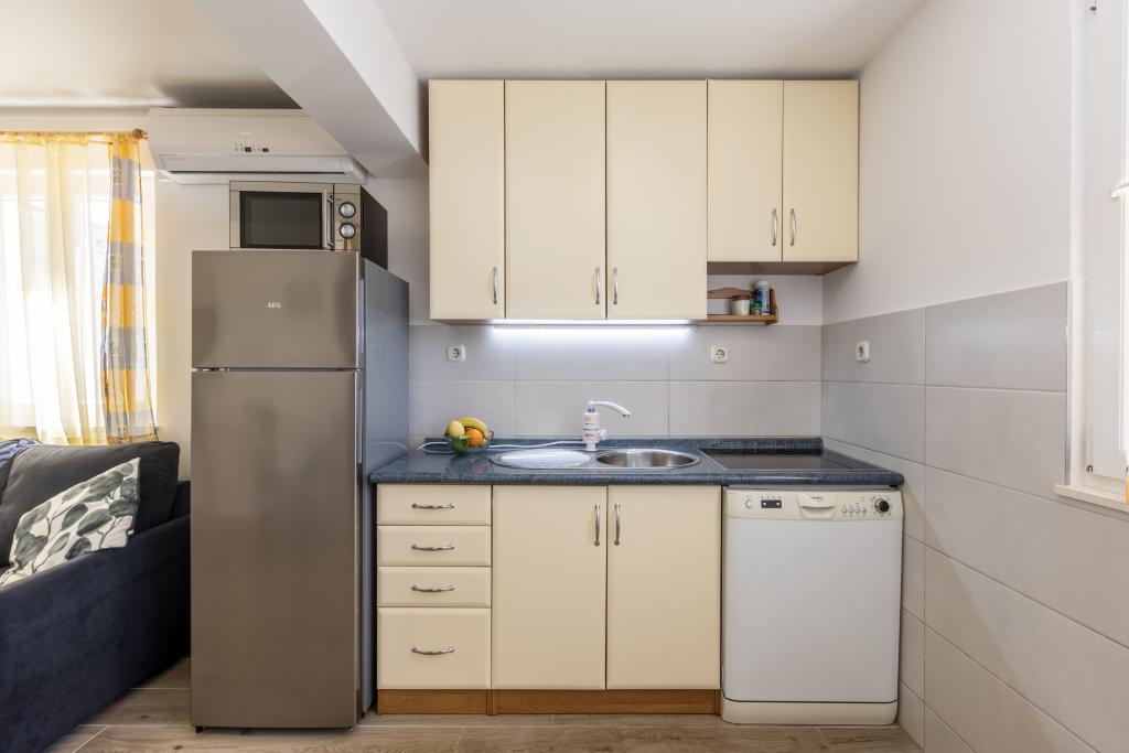 Bygningen ligger i et roligt og fredeligt område. Centrum ligger cirka 1 km væk og er tilgængeligt via en sti langs kysten. I nærheden er der stier, der er egnede til løbe- og gåture. Der ligger en dejlig strand i nærheden. Der er to intime strande i nærheden – en tættere på ejendommen, for naturister, og den anden, vild og mindre tilgængelig. Lejligheden er meget veludstyret med køkkenudstyr og er komfortabel. Der er vaskemaskine og opvaskemaskine. Der er aircondition i stuen, men på grund af lejlighedens beliggenhed i stueetagen behøver den ikke at være tændt. Der er installeret myggenet i vinduerne. Hele gårdhaven foran lejligheden er eksklusiv for lejligheden, inklusive spiseområdet, som har udsigt over havet. Værterne var meget høflige og fuldstændig diskrete.