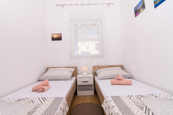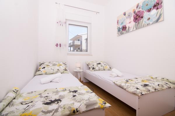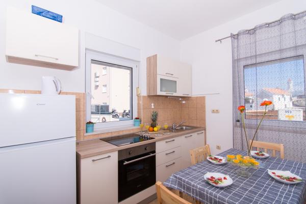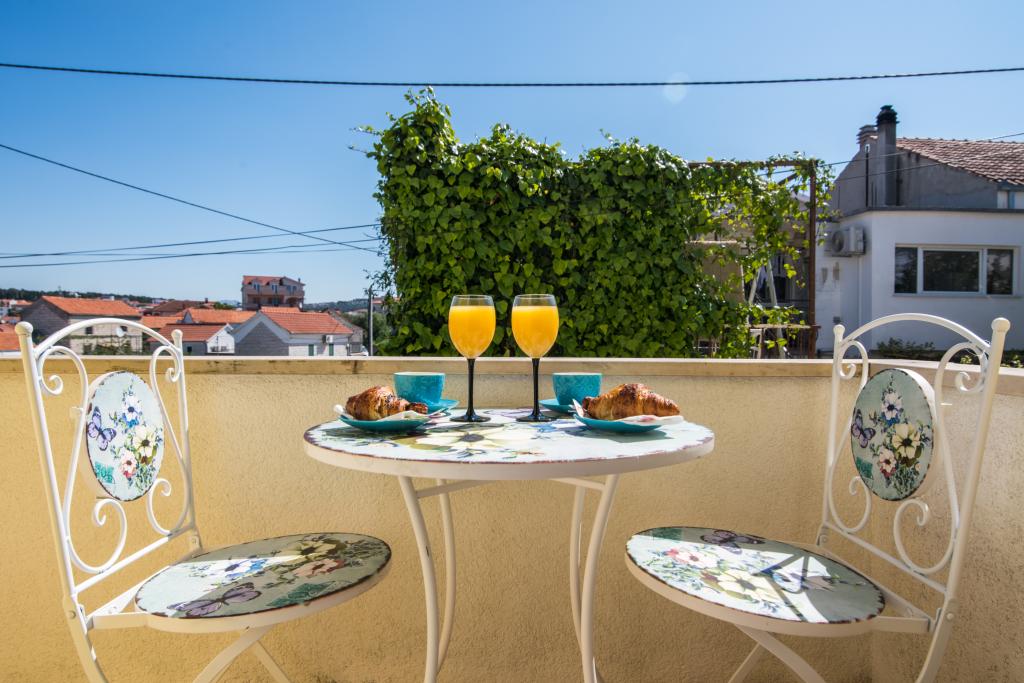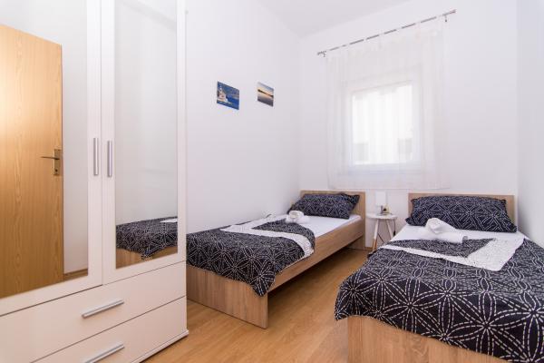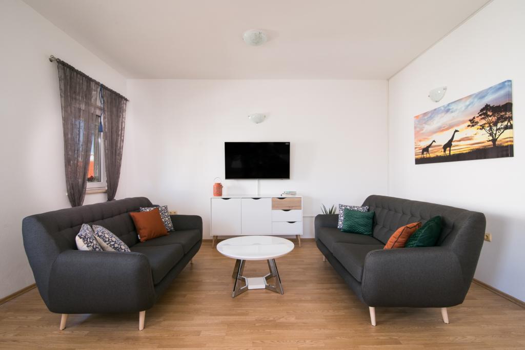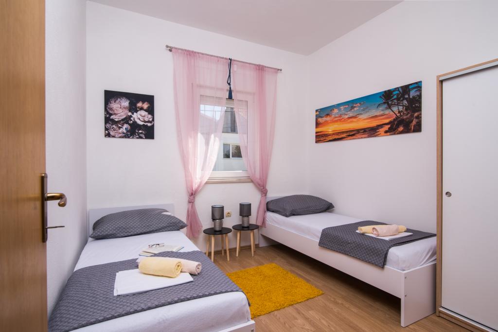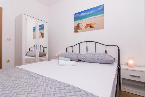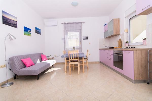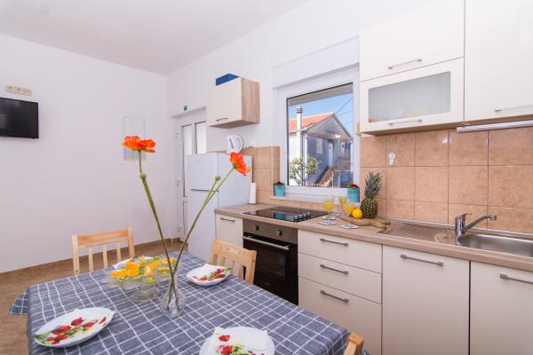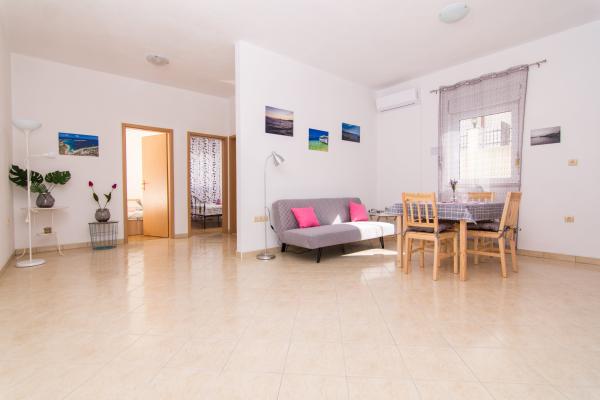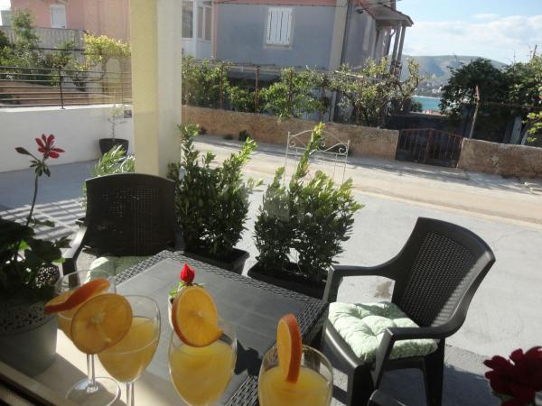Fuldt og moderne udstyrede lejligheder i en rolig del af Okrug Gornji, 150 meter fra byens centrum. Lejlighederne indeholder alt, hvad du behøver, og hvad der skal gøre dit ophold så behageligt som muligt. Byens centrum - 5 minutters gang (nær posthus, marked, butikker, caféer, restauranter, apotek) og nærheden til alle strande gør vores faciliteter endnu mere interessante og attraktive. De rolige omgivelser i faciliteterne giver dig mulighed for at gøre dit ophold så behageligt som muligt, samt at nyde din morgenkaffe i ro og mag på terrassen foran lejligheden.