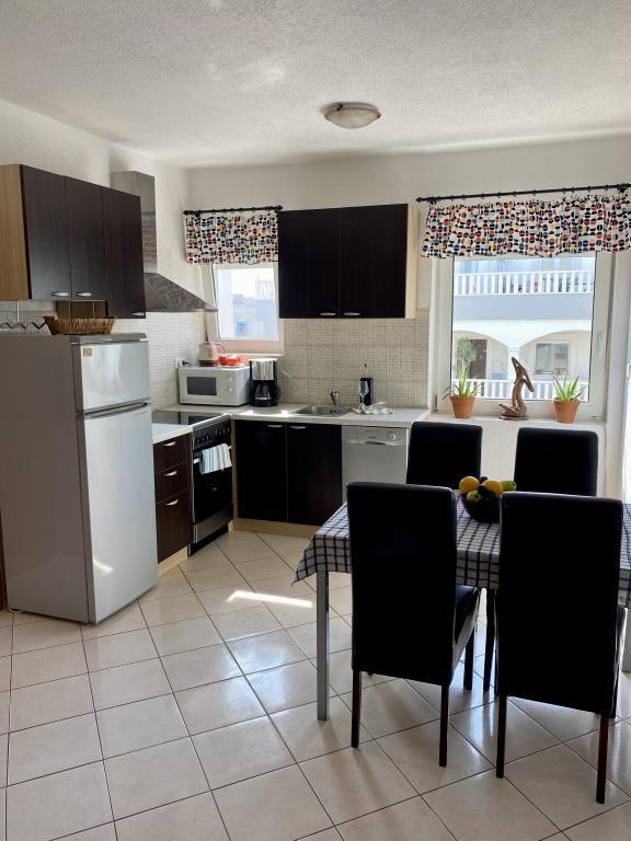 Meget komfortabel lejlighed udstyret med forskellige hjælpemidler. Lejligheden har en stor terrasse med åben udsigt til himlen og en anden balkon, der er fantastisk til morgenkaffe og udsigt over havet. Rolige omgivelser, velegnet til familier med børn. Fordelen ved to stenede strande og en strand med småsten. Det er anden gang, vi har boet her, og vi vil vende tilbage igen.
