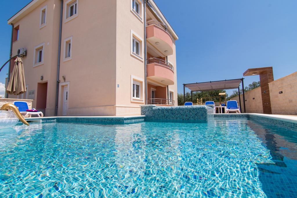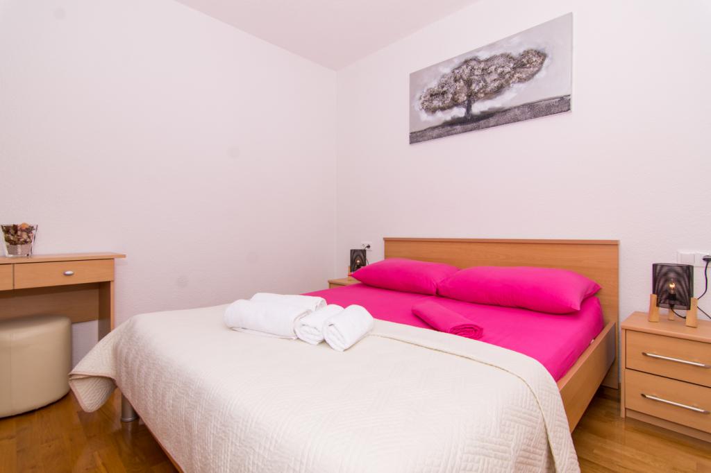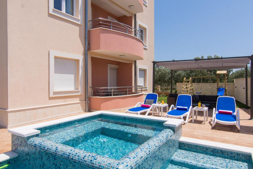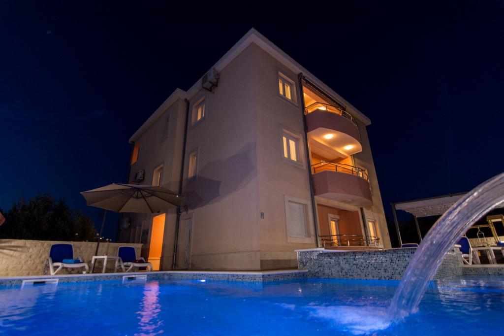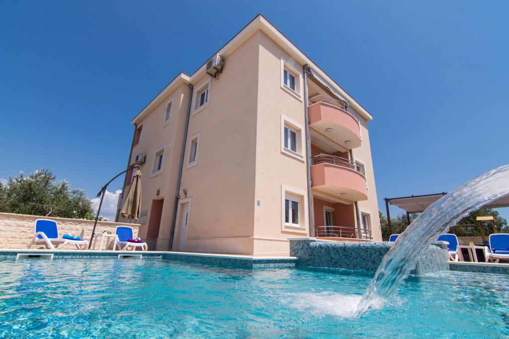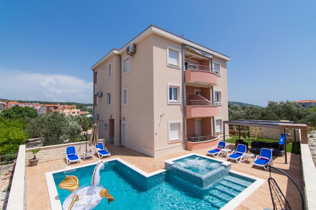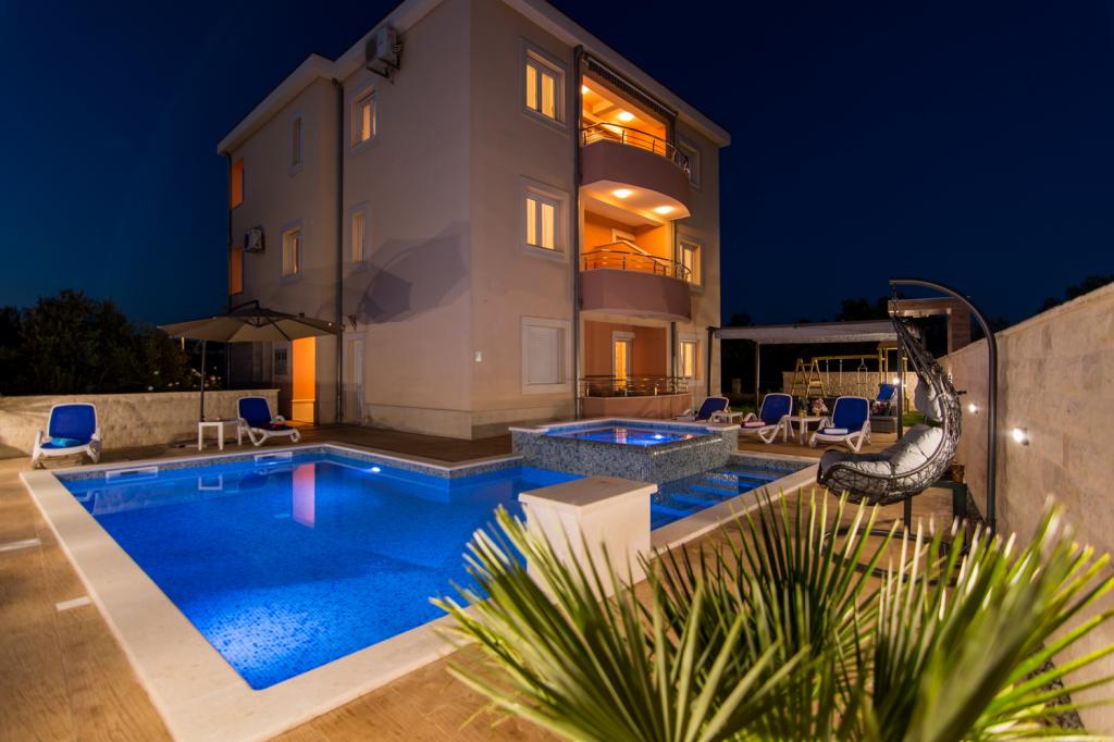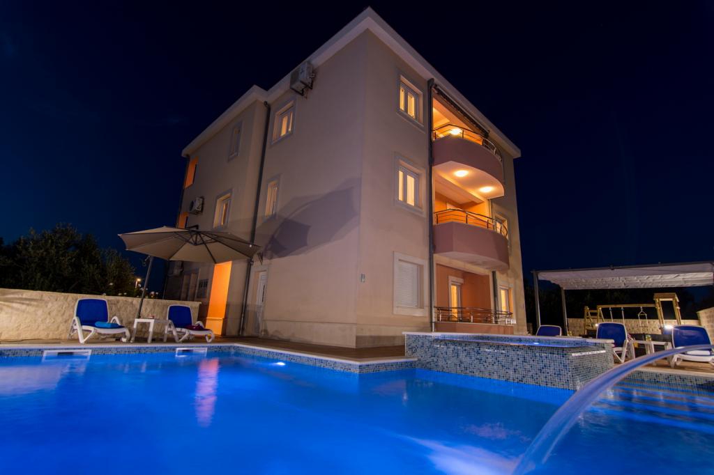 Apartments Villa Peky er moderne udstyret og har aircondition og ligger i et familiehus på øen Čiovo i Okrug Gornji. To A2 2 lejligheder og en 4 2 lejlighed kan huse op til 14 personer. Der er en parkeringsplads til gæster foran huset. På bagsiden af huset er der en opvarmet swimmingpool med jacuzzi, en legeplads og en overdækket udendørs grill med et stort bord. Den mest populære destination i Trogir-regionen er Okrug Gornji på øen Čiovo med dens smukke strand. Den gamle landsby Okrug ligger på toppen af en lille bakke, i bunden af hvilken er en fiskerihavn, omkring 4 km fra centrum af Trogir eller 8 km fra Split lufthavn. På stranden i Okrug Gornji kan du leje en scooter, jetski, du kan nyde parasailing og andre aktiviteter på havet. Om sommeren i Okrug kan du også nyde skyggen af caféer eller restauranter, der tilbyder dalmatiske specialiteter ud over andre retter. Dykkerskolen Trogir Diving Center i Mavarčica vil introducere dig til skønhederne i undersøen i det centrale Dalmatien.