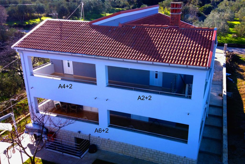 Bygningen har 3 lejligheder. Den største A6+1 dækker hele stueetagen, ca. 90m2, med en 30m2 terrasse. På første sal er der lejlighederne A4+1 og A2+1, hver ca. 45m2 store og en fælles terrasse på 30m2. Terrasserne har havudsigt. Lejlighederne er fuldt udstyrede og har aircondition. Bygningen ligger 50m fra havet. Bygningen ligger i et afsidesliggende område. Stranden foran lejligheden er af beton, 50% i skyggen. Der er en parkeringsplads foran bygningen. Der er også en stor grill/bage/stegeplads til fri afbenyttelse for gæsterne. Samt et stort bord og bænke foran grillen. Byen Dobropoljana ligger 200m væk. Bymidten ligger 5 minutters gang væk. I centrum er der 2 butikker, en stor, velholdt sandstrand, en førsteklasses restaurant og en lille bådhavn. Der er også plads foran bygningen til fortøjning af en båd, og i Dobropoljana kan båden sættes i eller tages op af havet på en trailer.
