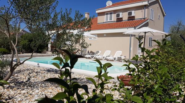 Villa med 3 lejligheder Karla. Rolig, solrige beliggenhed, 100 m fra havet, 100 m fra stranden. Delt: swimming pool kantet (4 x 8 m, dybde 135 cm, 15. 04. -14 10..) Med indentrappe. Grill. I huset: adgang til internet. Rigelig og sikker parkering nær villaen på grunden. Butik, restaurant 700 m, café 100 m, sandstrand 800 m, stenstrand, sand, klippestrand 100 m. Lejlighederne er nyrenoverede, aircondition og fuldt udstyret til en perfekt ferie. Lejlighed 1, i stueetagen med plateau og møbler til friluftsliv, havudsigt. Lejlighed 2, på gulvet, overdækket terrasse med siddepladser, med udsigt over havet.