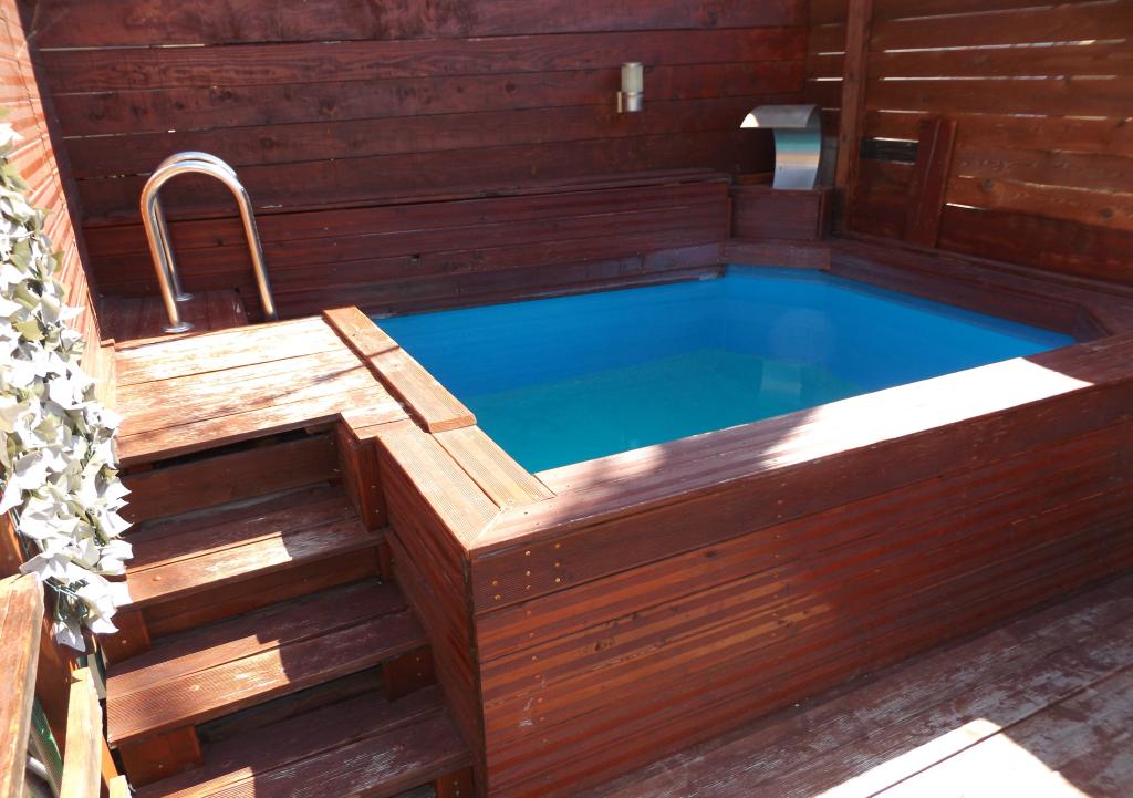 Lille pool, liggestole, overdækket parkering, hver lejlighed har sin egen balkon, terrasse til at sidde, grill, overdækket siddeområde.
