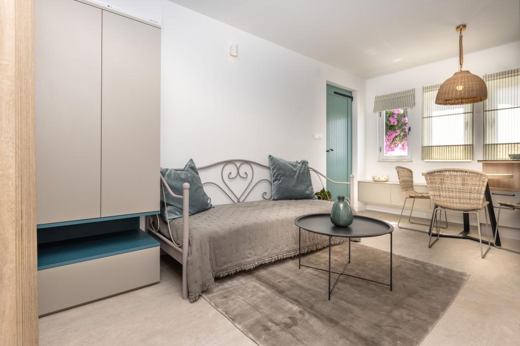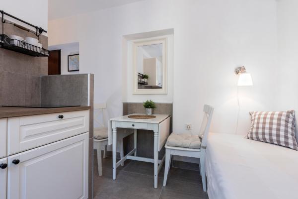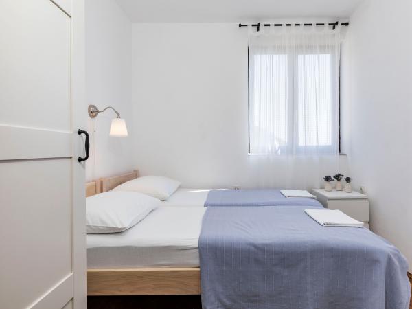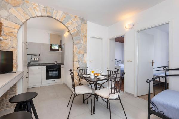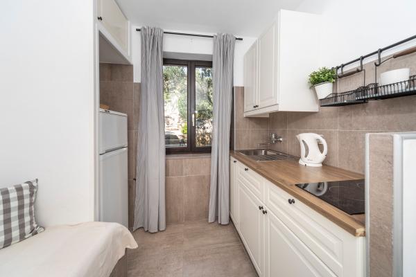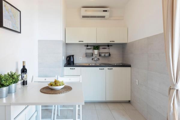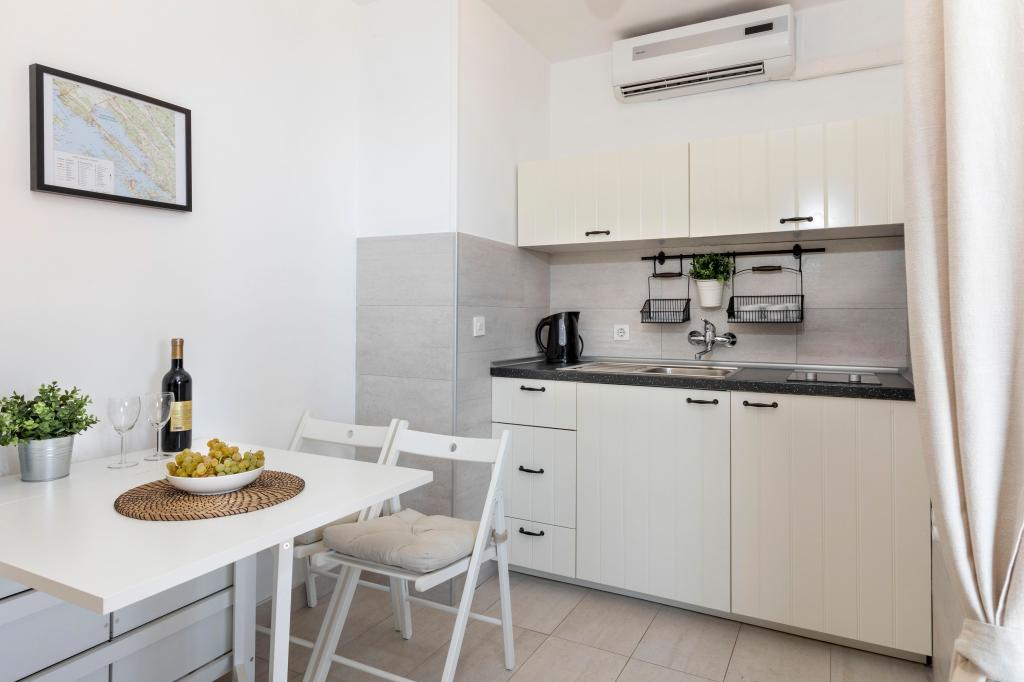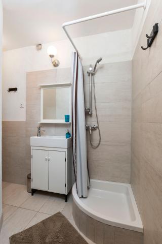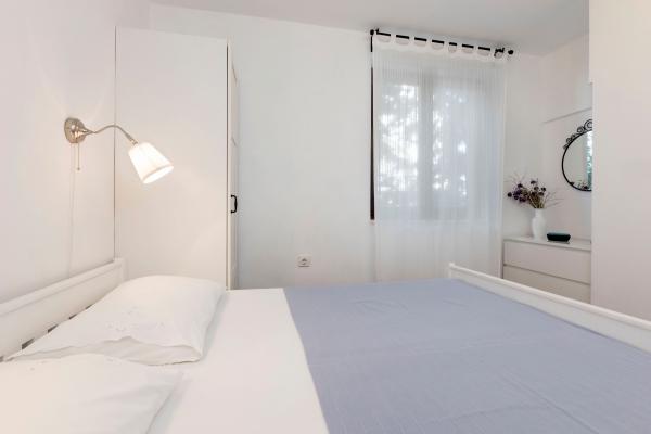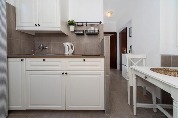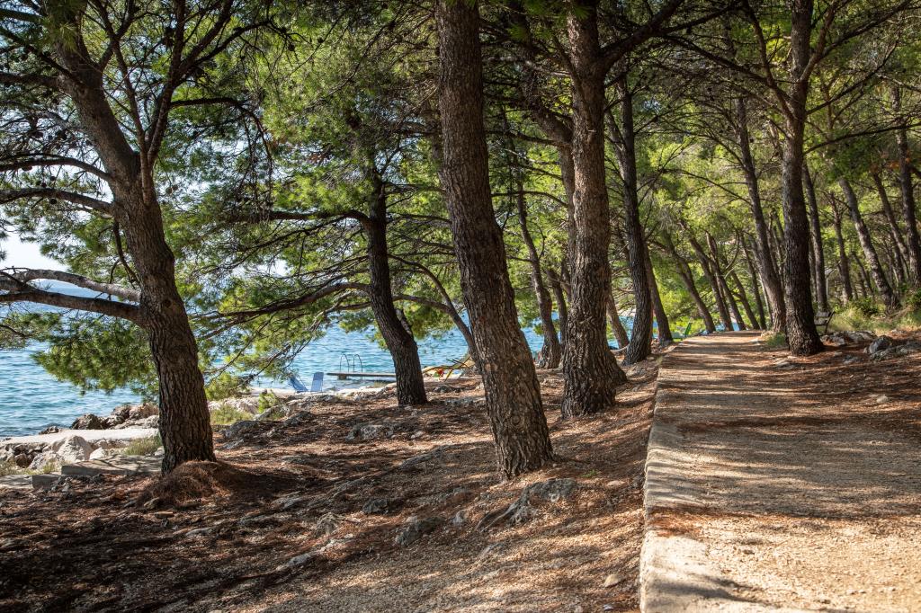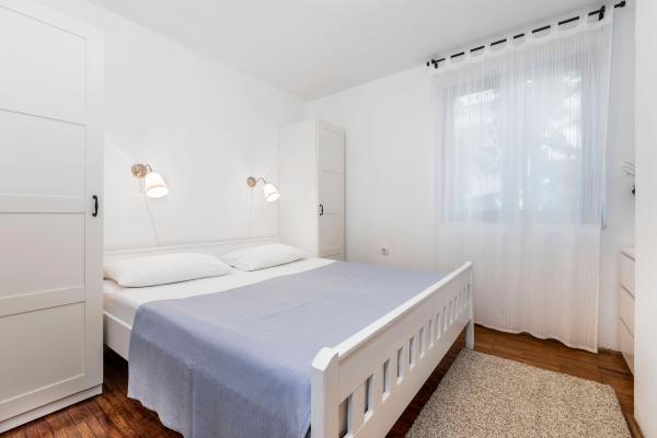 Fuldt udstyrede lejligheder i en vidunderlig beliggenhed med udsigt over havet i et hus omgivet af grønne områder. Anlægget ligger 150 m fra havet og stranden, ved siden af er der en tæt fyrreskov. En oplyst promenade strækker sig gennem fyrreskoven langs selve havet. Hver lejlighed har eget køkken og badeværelse samt 1-2 soveværelser, alt efter lejlighed. Køkkenet har alle de nødvendige apparater og service. Lejligheden har en ovn eller en mikrobølgeovn (afhængigt af lejligheden). Værelserne har komfortable senge, sengelinned og håndklæder leveres på badeværelset. Lejlighed A4 har en rummelig terrasse med smuk udsigt over havet og terrassen er en integreret del af lejligheden Lejlighed A4+1 har en overdækket privat terrasse ved siden af lejligheden, omgivet af grønne områder. Studielejligheden har sin egen private terrasse ved siden af lejligheden, adskilt fra passagen, med en smuk udsigt over havet. Grundplanen for hver boligenhed er knyttet til billederne, så du kan se størrelsen og indretningen af værelserne . Hver lejlighed har sin egen parkeringsplads.
