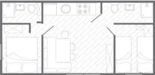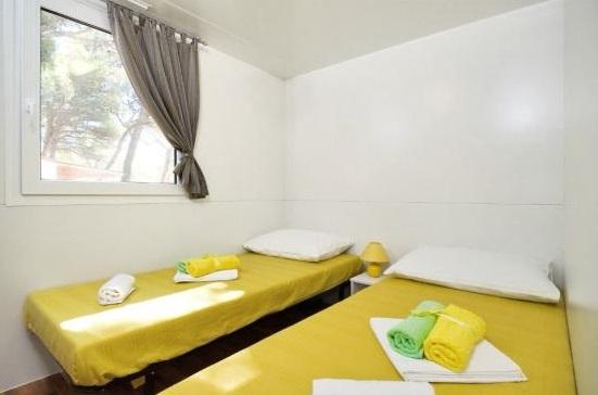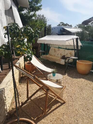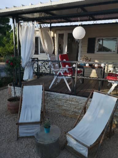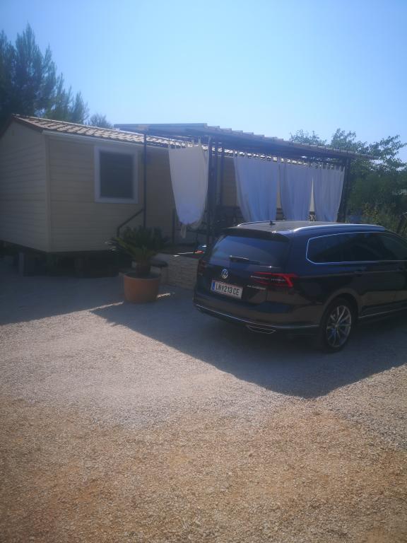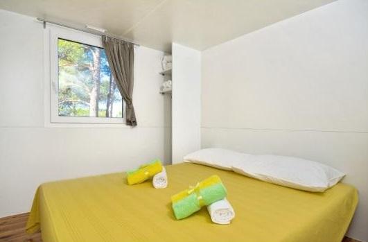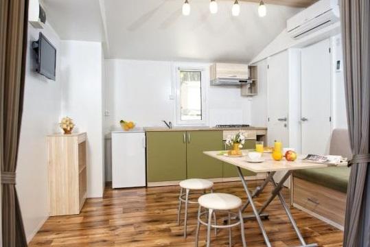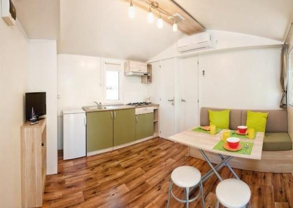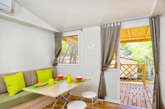 Mobilhome med aircondition 30 m fra havet med 2 soveværelser, køkken, 2 badeværelser, stue, terrasse, parkering, udendørs bruser, grill, liggestole og privat parkering. Husdyr er tilladt.