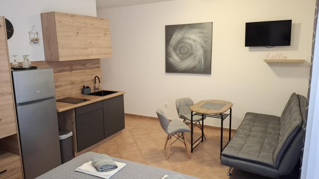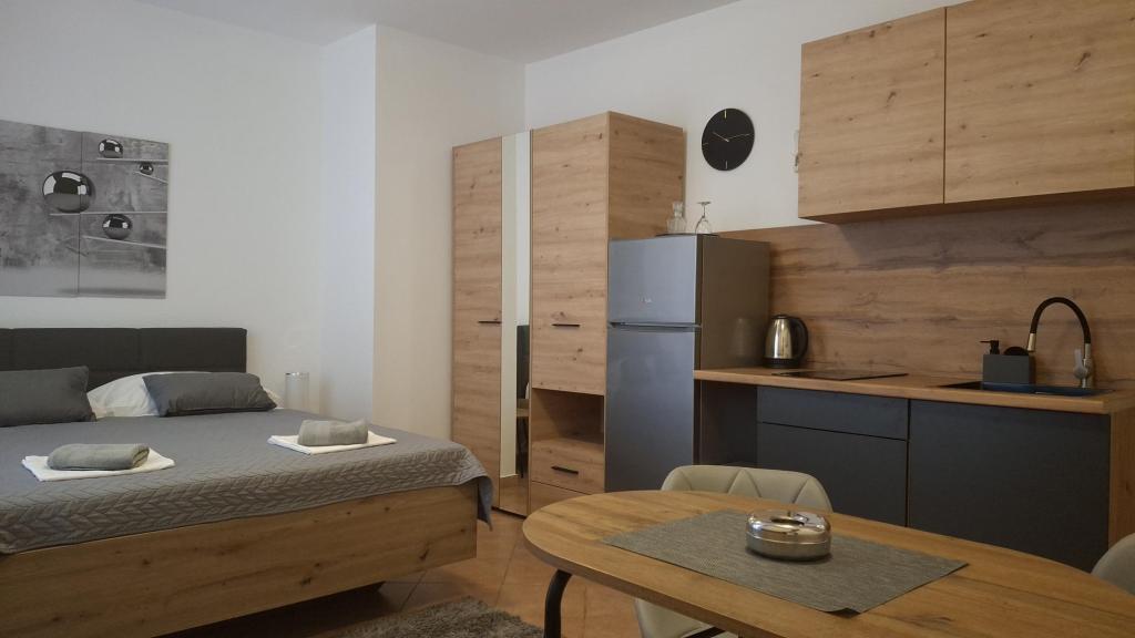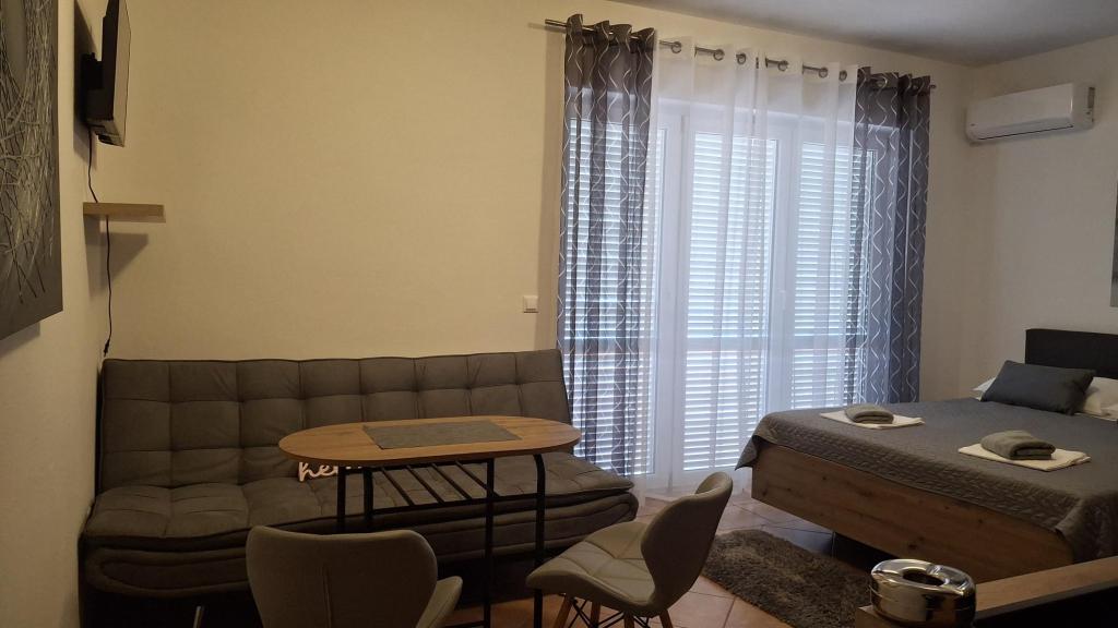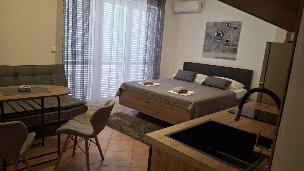 Til en pause fra hverdagen og det hektiske liv tilbyder vi studielejligheder eller værelser efter eget valg i en ny familiebygning, med udsigt over havet. Din bolig ligger 4-5 minutters kørsel til byen, og stranden 3-4 minutter. Lejlighederne har mulighed for at benytte udendørs grill, og ligger tæt på indkøbscentret Duga Mall og Lidl. Hos os har du til enhver tid sikret parkering, hvilket er det største problem for enhver turistdestination. Muligheden for at bruge klimaanlægget mod et ekstra gebyr på 5 EUR pr. dag. Din behagelige ferie i vores anlæg er vores største opgave.