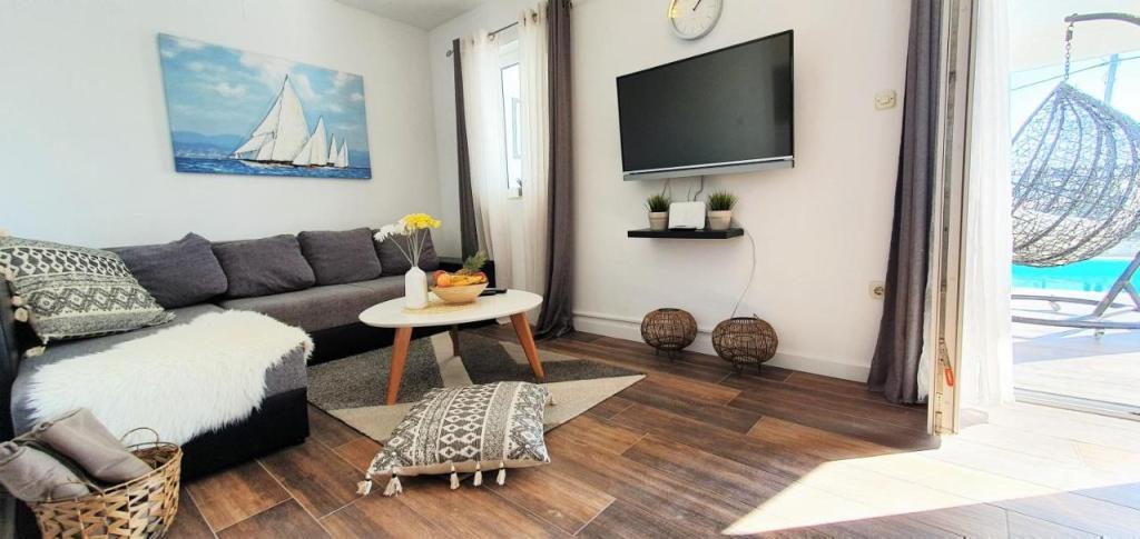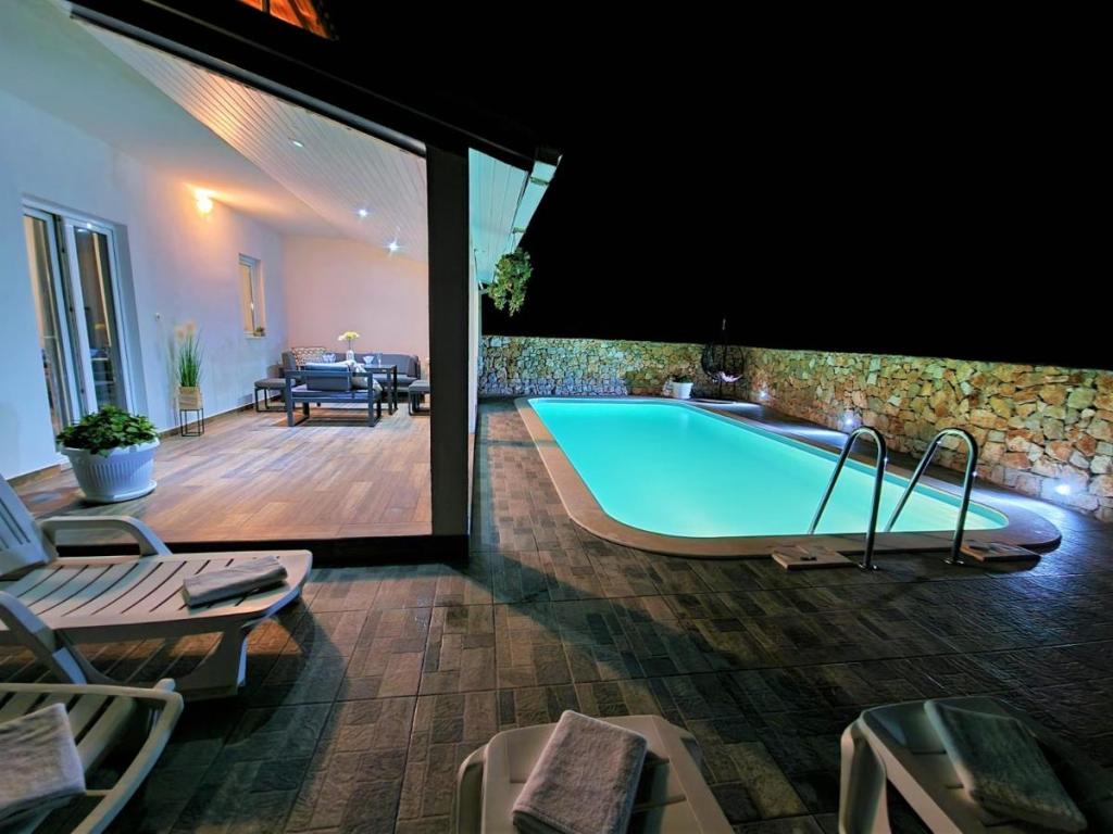Holiday house Ana Laguna ligger på øen Drvenik Mali nær Trogir og tilbyder indkvartering med aircondition og egen pool. Det ligger 200 meter fra Vela Rina-stranden. Huset har 3 soveværelser, 2 badeværelser, sengetøj, håndklæder, fladskærms-tv med kabelkanaler, spisestue, fuldt udstyret køkken og balkon med udsigt over poolen. Gæsterne kan nyde deres måltid i den udendørs spiseplads med udsigt over haven.
