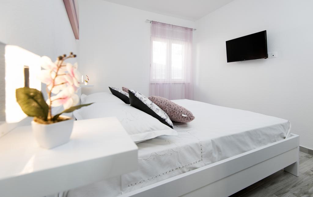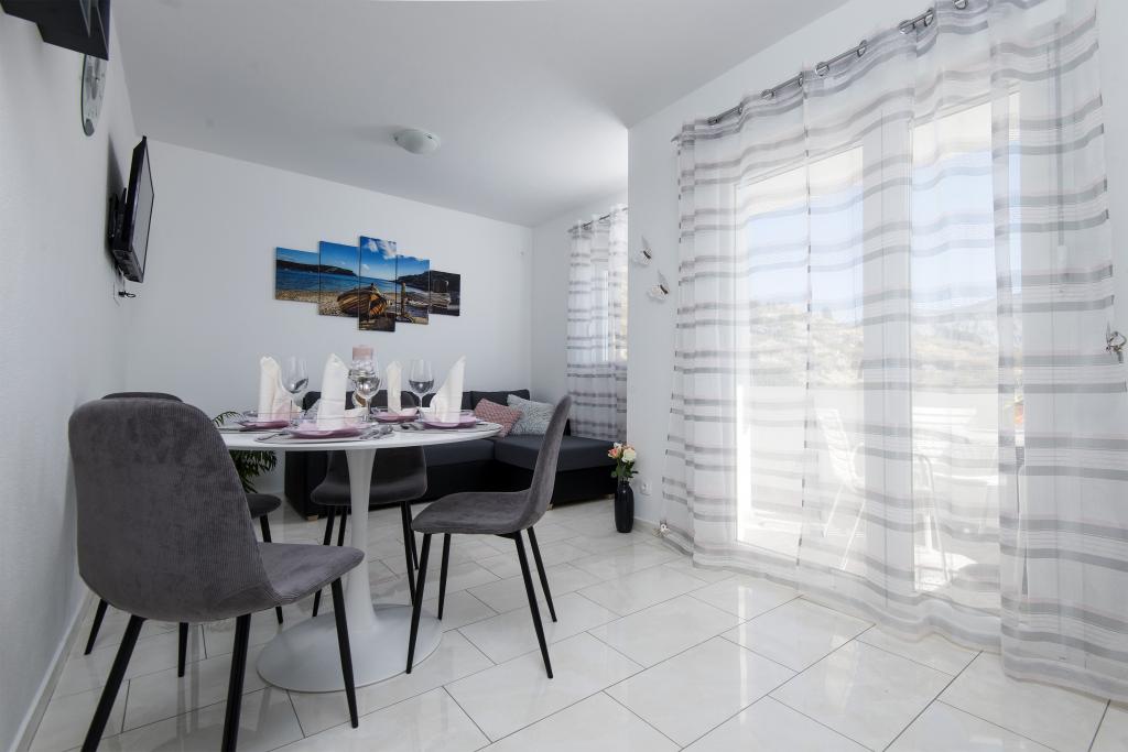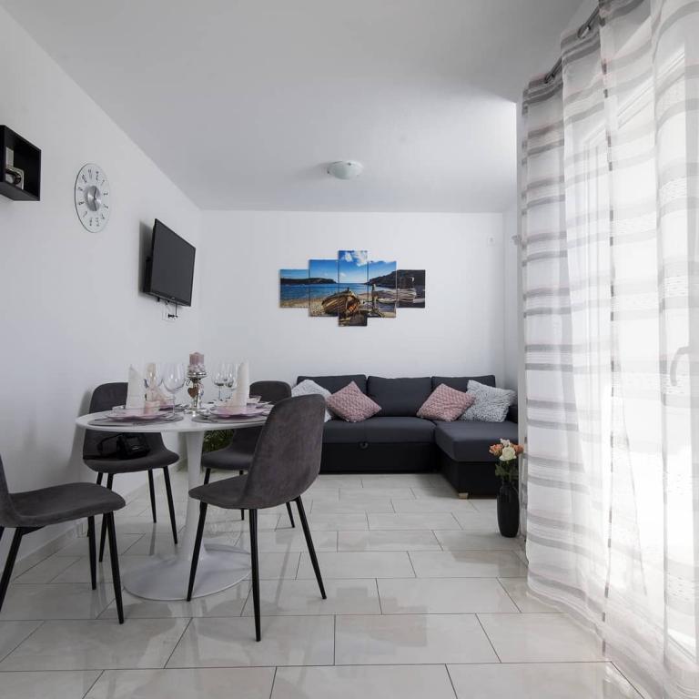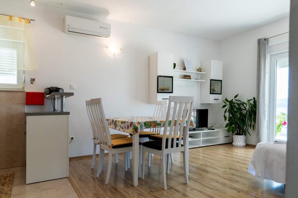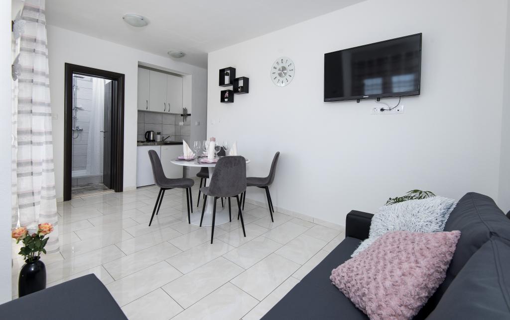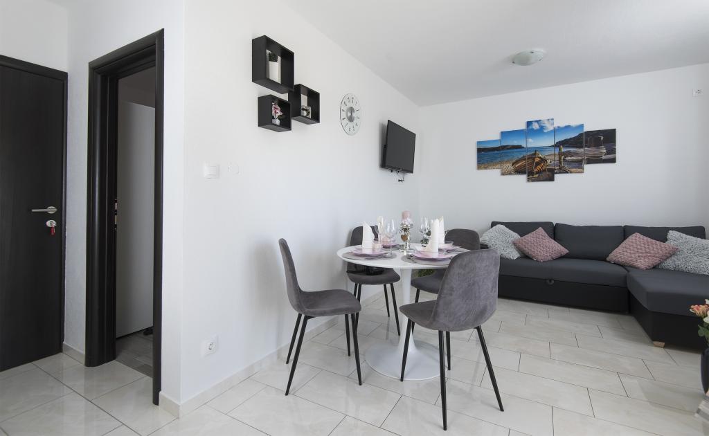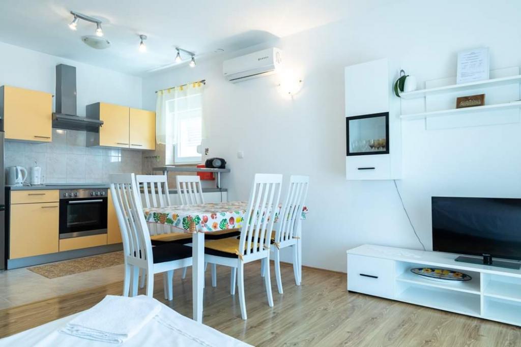 Helt renoverede lejligheder med aircondition og havudsigt i et roligt turiststed. Tæt på forskellige servicefaciliteter, butikker, barer, restauranter. På sandstranden sammen med det klare hav tilbydes forskellige sports- og rekreationsfaciliteter. Vores gæster har også rabatter på visse restauranter, rafting, sejlture gennem floden Cetina, bådture til øen Brac, jetski, rent-a-boat og banan- og tube-forlystelser for de yngste. Prisen inkluderer internet, SAT, privat parkering og brug af udendørs grill.