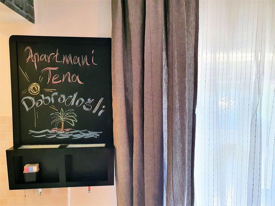Lejligheder Tena er beliggende langs kanten af promenaden, første række til havet. Den anlagte gård fører direkte til stranden, havet er 10m væk. Afstand til butikker eller restauranter 20m. En rummelig gårdhave, grill og parkering er til rådighed for gæsterne på anlægget. Hvert anlæg har passende havemøbler, der sikrer hvile og nydelse på den varmeste del af dagen. Bygningens kapacitet består af 2 lejligheder, den første beliggende i stueetagen af bygningen, størrelse 22 m2, egnet til højst 2 personer pr. lejlighed, og den anden på etagen egnet til maksimalt 6 personer pr lejlighed. Hver lejlighed har komfortable dobbeltsenge, et køkken og en klassisk tre-personers sofa, der nemt kan laves om til en komfortabel ekstra seng, hvis det er nødvendigt. Hver lejlighed er udstyret med aircondition, WI-FI internet, TV. Hver lejlighed har et badeværelse med bruser. Crna Punta ligger i Karin-bugten, 5 minutter fra Karin, 40 km fra Zadar.