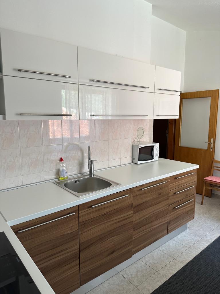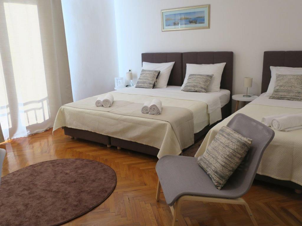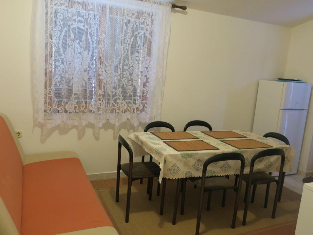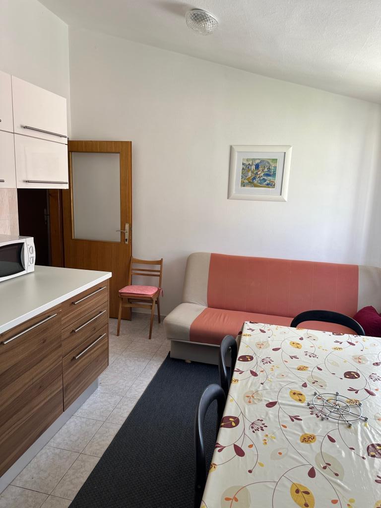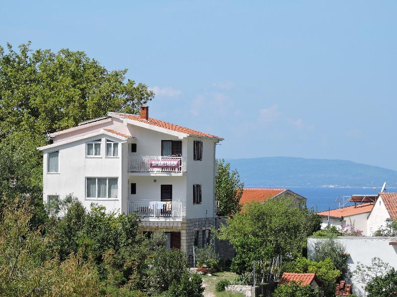 Lejlighed 100 m2 til 8 1 personer. Lejligheden har tre separate soveværelser (et dobbeltværelse og to tredobbelt), to badeværelser, et køkken med spisestue og to balkoner med en smuk udsigt over havet og det omkringliggende område. Alle værelser har aircondition. Gæsterne kan også bruge en grill med bord og bænke til spisning. Parkering for gæster er gratis.