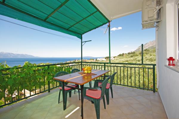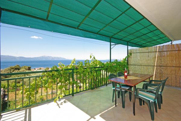 Huset har en smuk udsigt over havet og bjergskråningen.