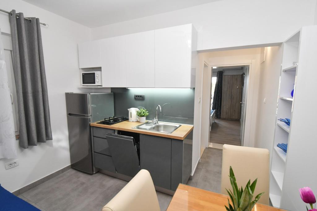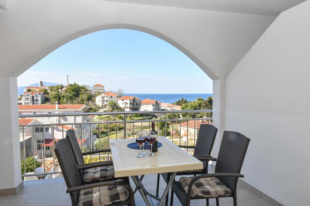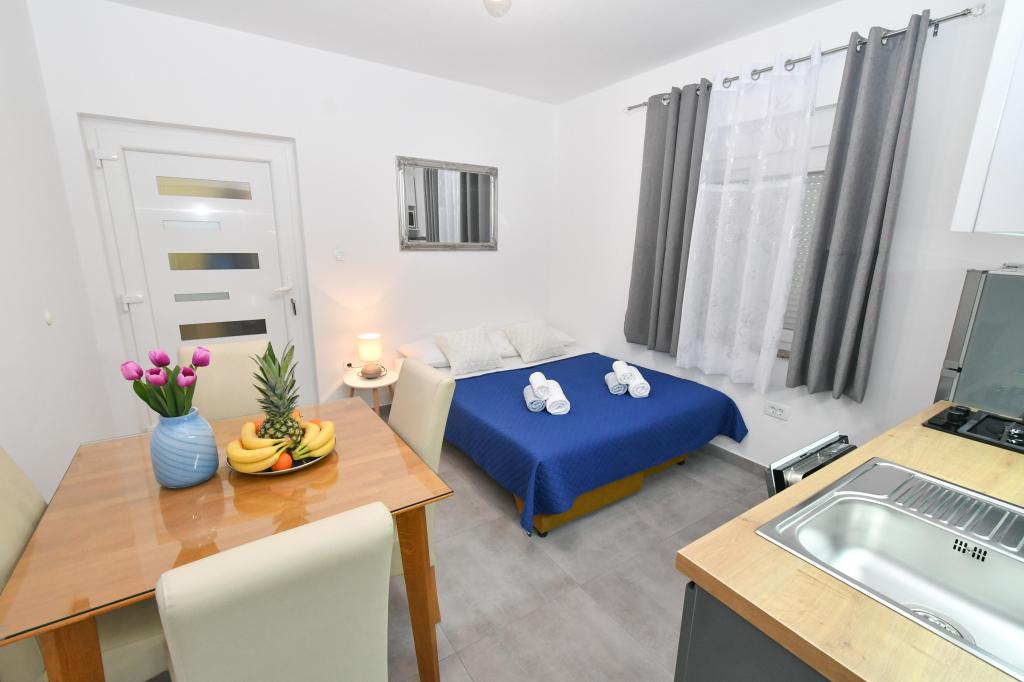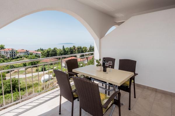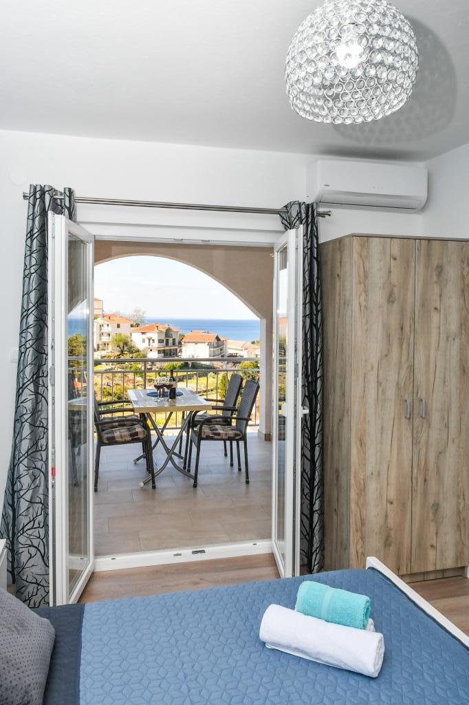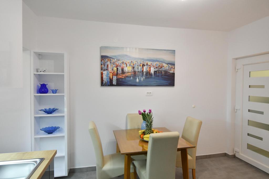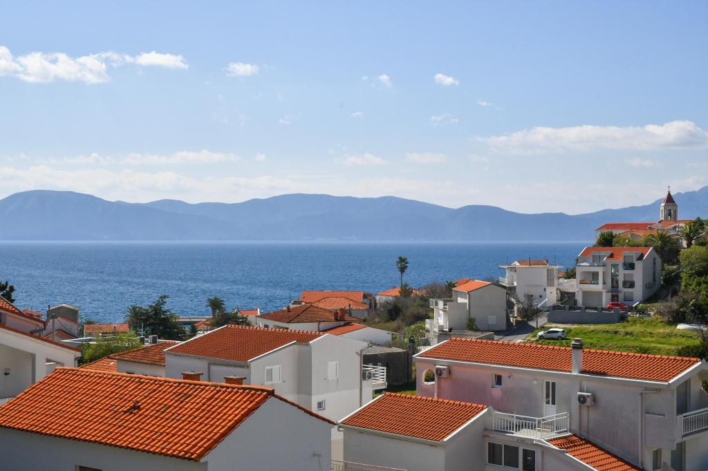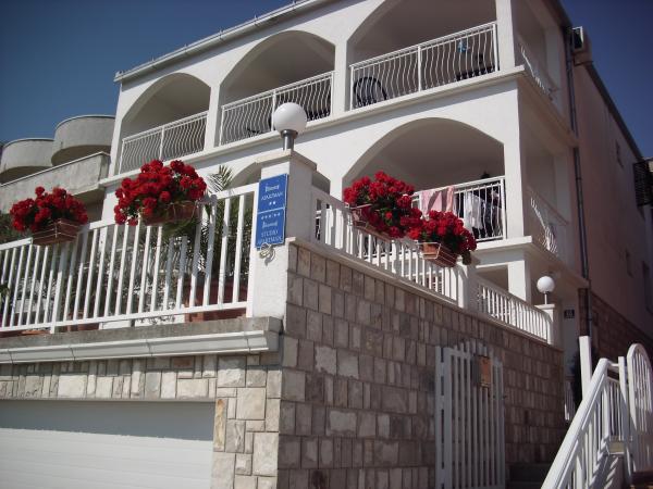 Lejlighederne er beliggende i den centrale del af byen, som er kun 200 m fra stranden og centrum og andre faciliteter der er nødvendige for en attraktiv ferie. Langs kysten strækker en fem kilometer lang vandresti for dem, der nyder at gå og cykle. Ikke langt fra bygningen er der tre lertennisbaner til alle tennisfans. Huset har fem lejligheder, hver med en privat terrasse (10m2) med udsigt over havet. Lejlighed 3, 4 og 5 har to soveværelser og en parkeringsplads i garagen som er inkluderet i prisen. Du vil blive mødt af venlige værter.
