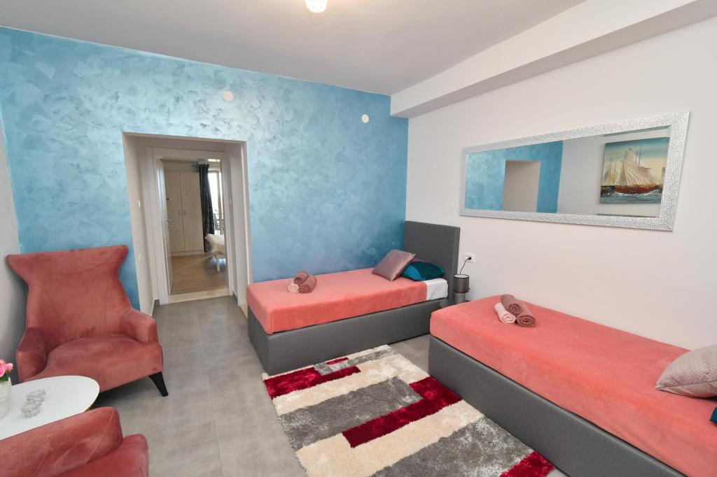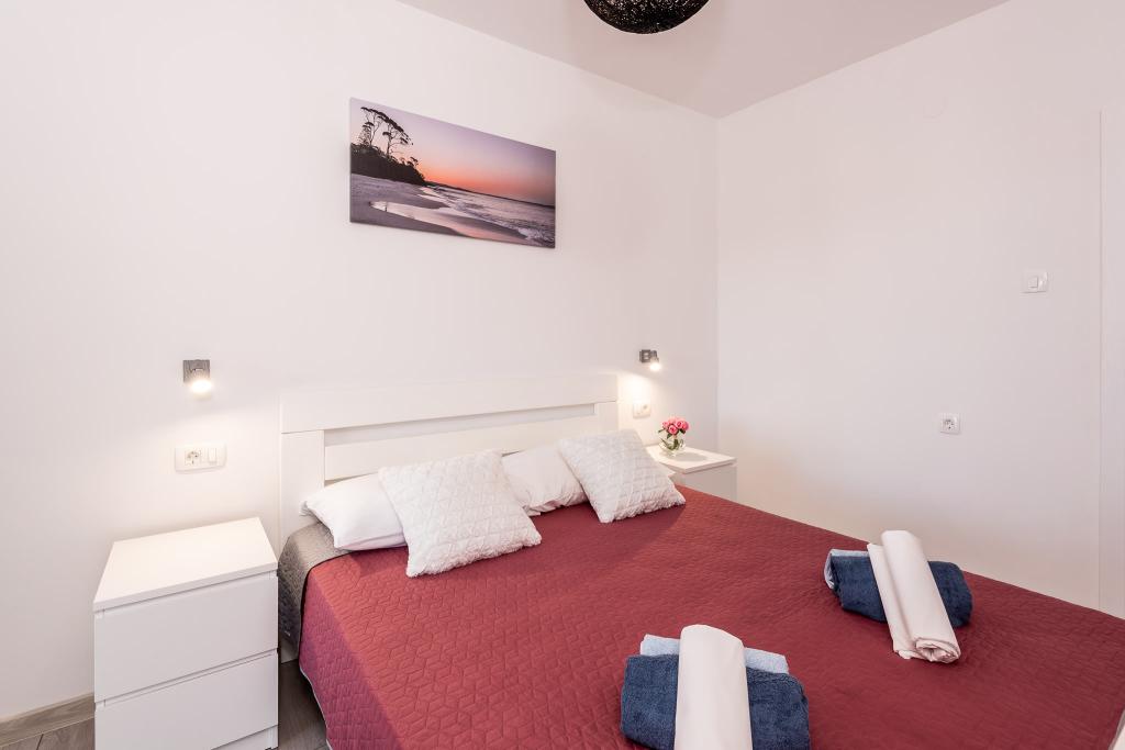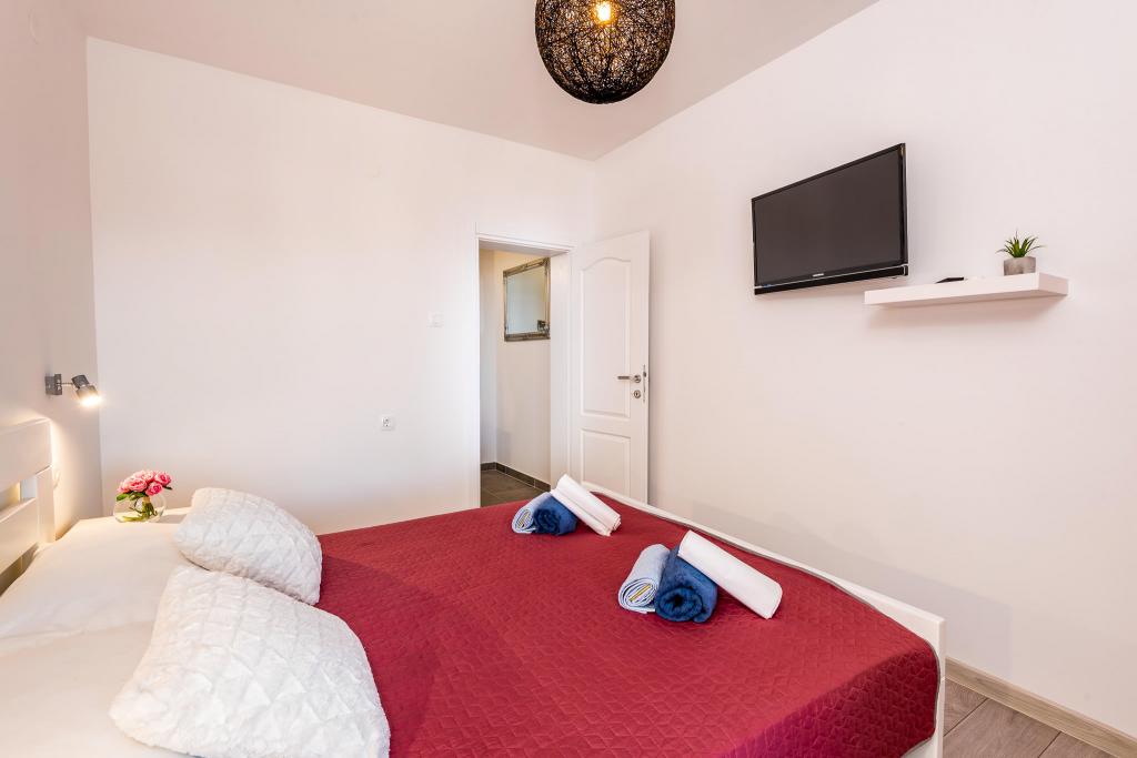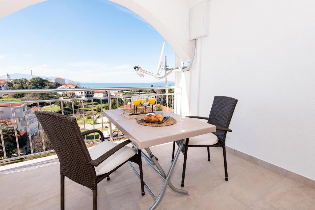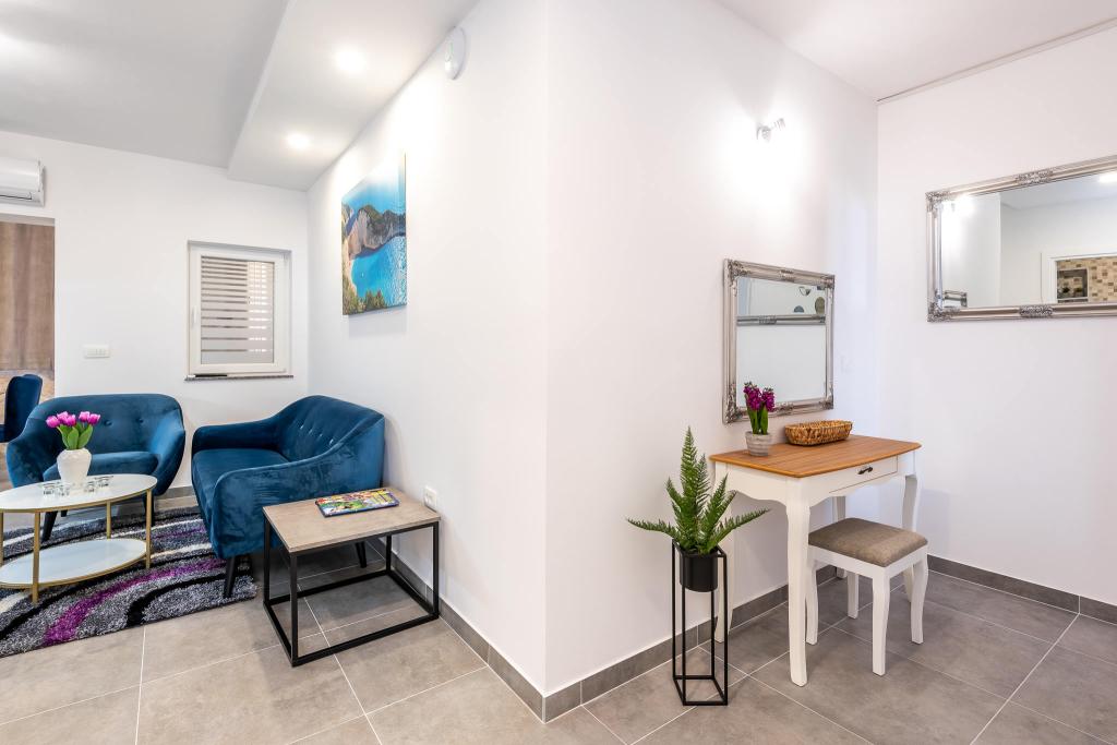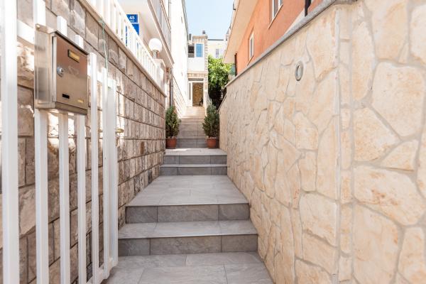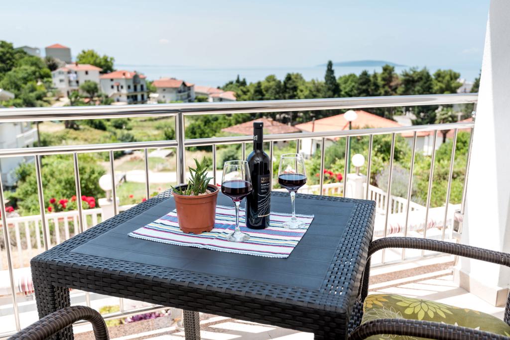 Lejlighederne er beliggende i den centrale del af byen, som er kun 200 m fra stranden og centrum og andre faciliteter der er nødvendige for en attraktiv ferie. Langs kysten strækker en fem kilometer lang vandresti for dem, der nyder at gå og cykle. Ikke langt fra bygningen er der tre lertennisbaner til alle tennisfans. Huset har fem lejligheder, hver med en privat terrasse (10m2) med udsigt over havet. Lejlighed 3, 4 og 5 har to soveværelser og en parkeringsplads i garagen som er inkluderet i prisen. Du vil blive mødt af venlige værter.