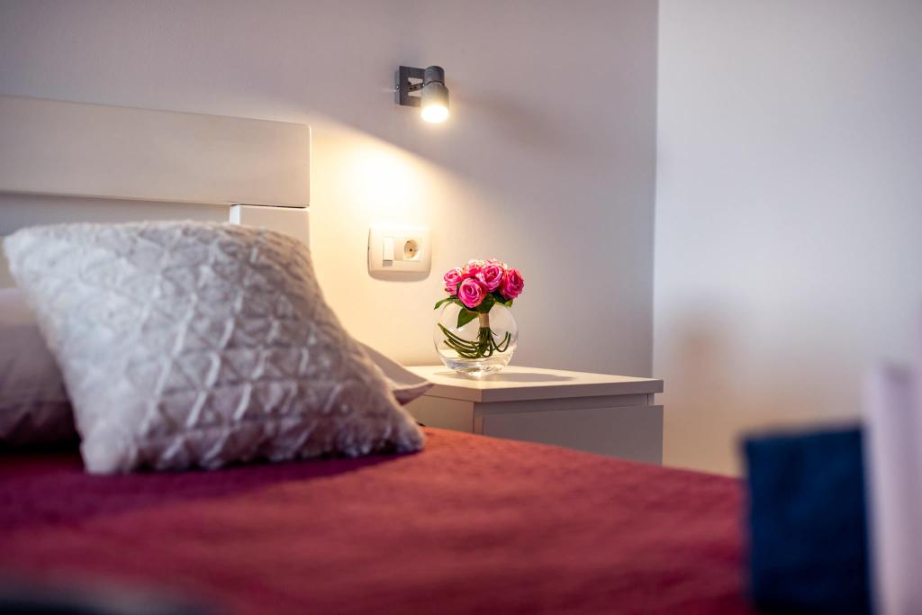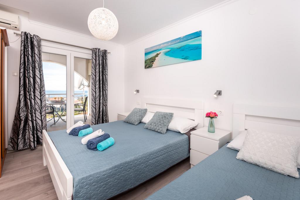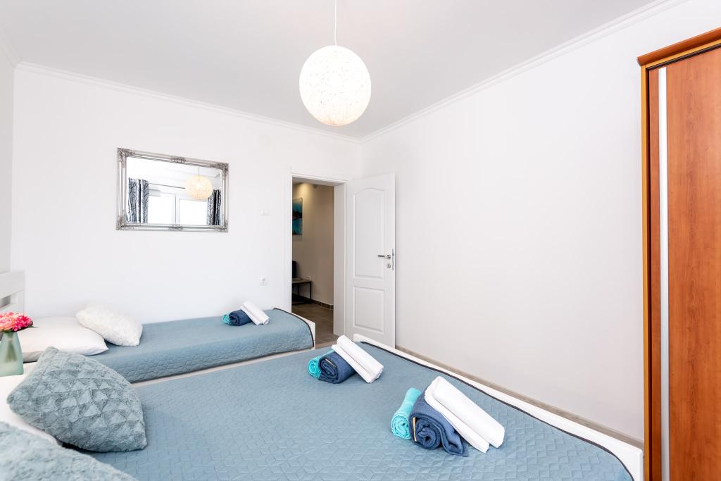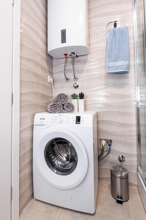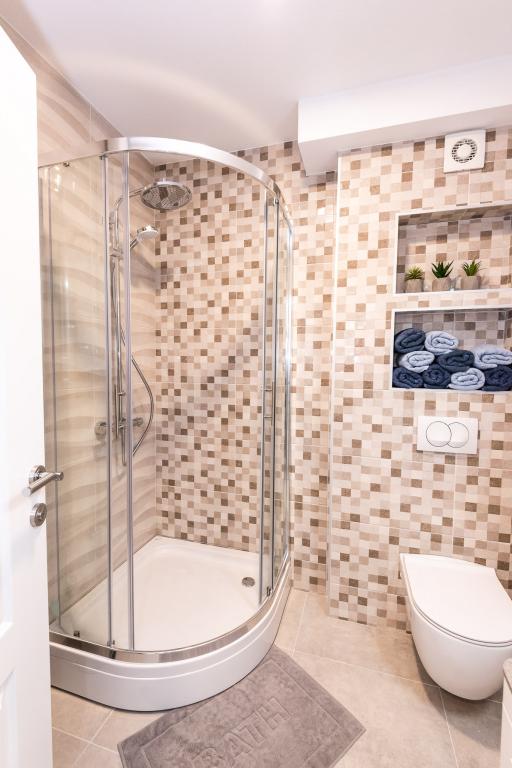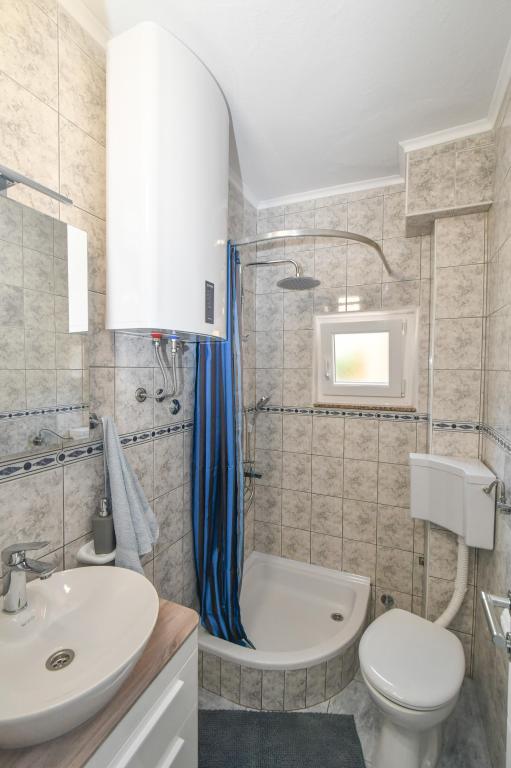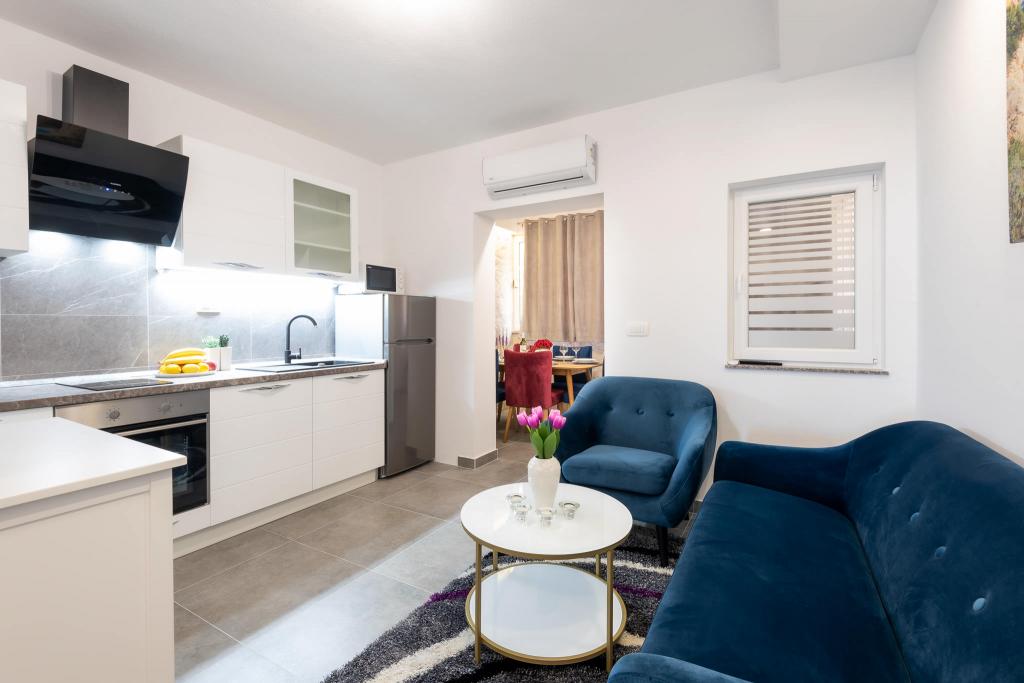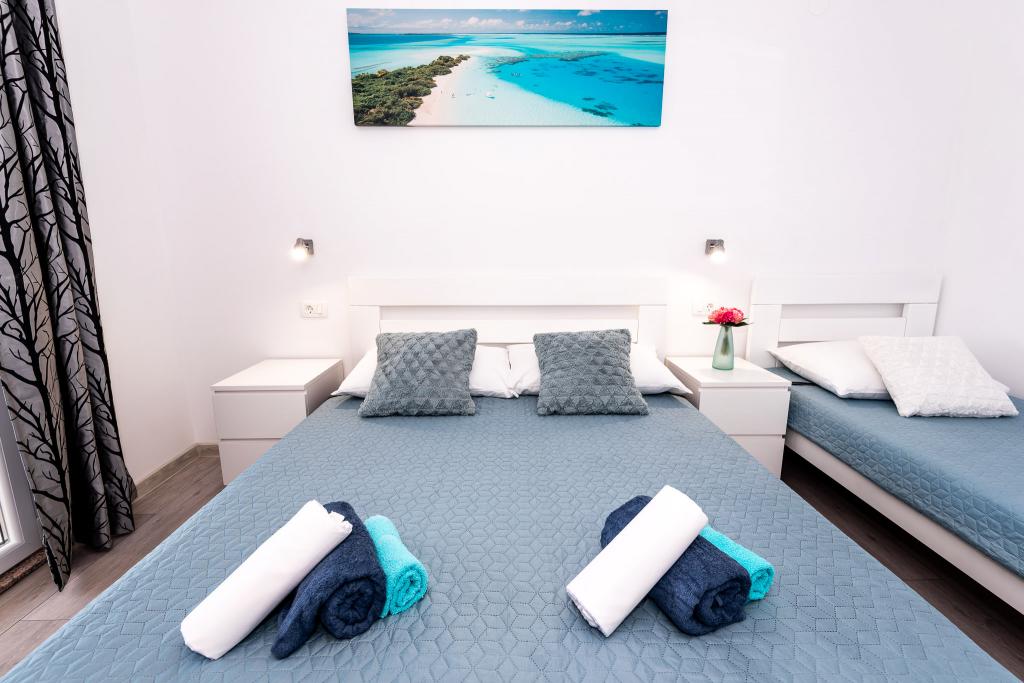 Lejlighederne er beliggende i den centrale del af byen, som er kun 200 m fra stranden og centrum og andre faciliteter der er nødvendige for en attraktiv ferie. Langs kysten strækker en fem kilometer lang vandresti for dem, der nyder at gå og cykle. Ikke langt fra bygningen er der tre lertennisbaner til alle tennisfans. Huset har fem lejligheder, hver med en privat terrasse (10m2) med udsigt over havet. Lejlighed 3, 4 og 5 har to soveværelser og en parkeringsplads i garagen som er inkluderet i prisen. Du vil blive mødt af venlige værter.