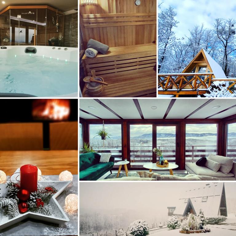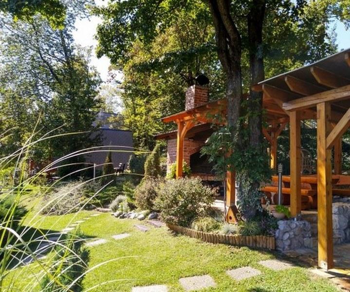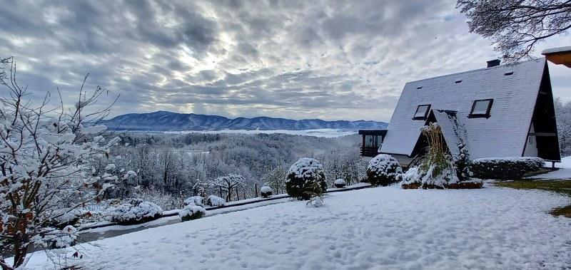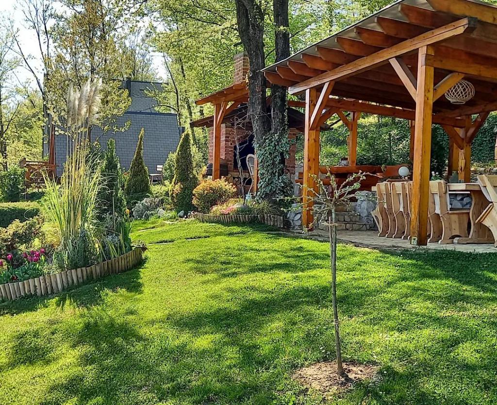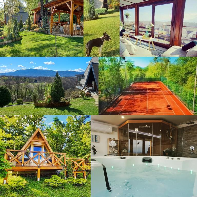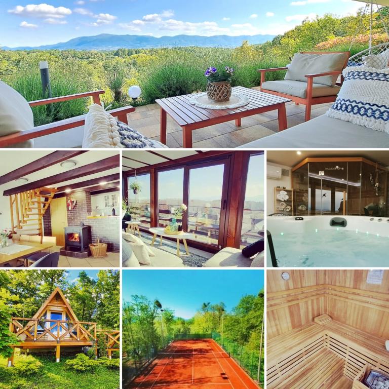 Nyd og hvil i feriehuset () og lige ved siden af \glamping\ huset, alt omgivet af en skov, i 305 meter over havets overflade. Gården med en smuk udsigt over Ivanščica-bjerget indeholder en stor overdækket terrasse med stor grill/ovn og egen ler-tennisbane med belysning til rådighed for prisen. Huset har to soveværelser, en stue med brændeovn og et bord til 12 personer, et badeværelse og et fuldt udstyret køkken, og det smukke glampinghus har et soveværelse og eget badeværelse! Et bord til bordtennis, komplet grilludstyr, cykler og meget mere er også til rådighed. Hunde og faste kæledyr er velkomne :)