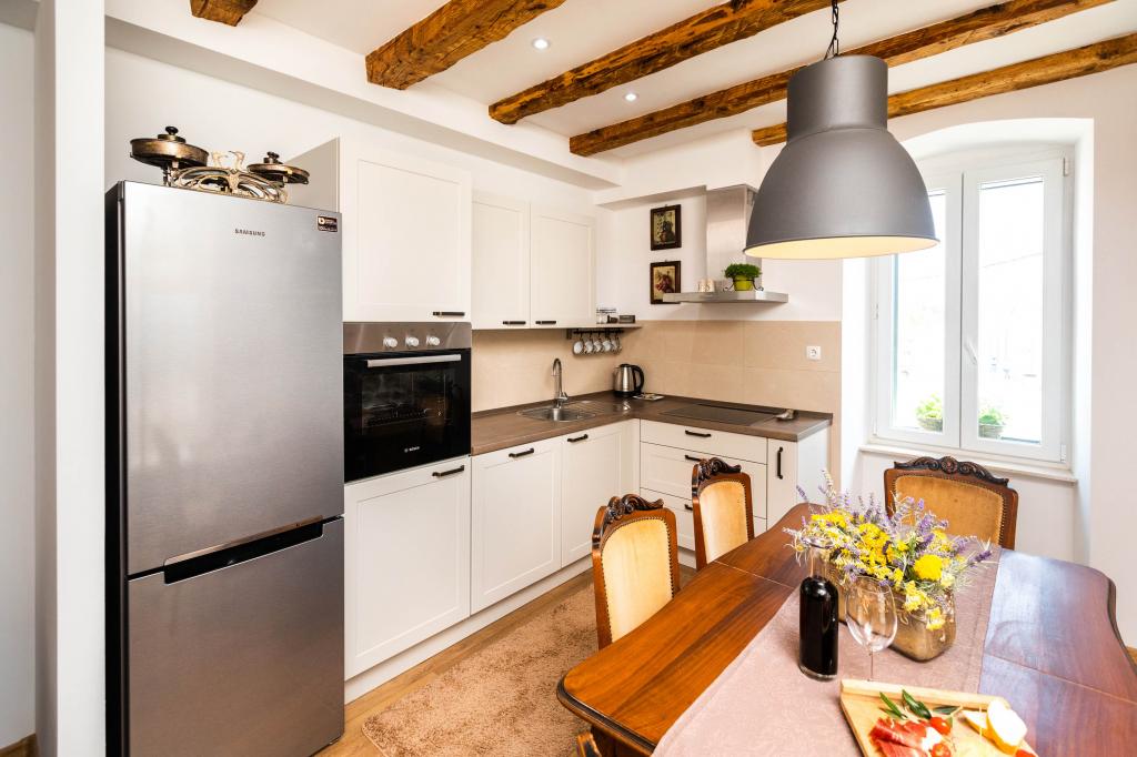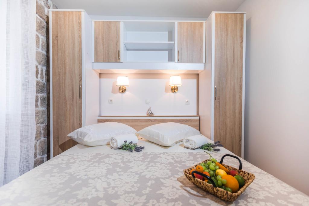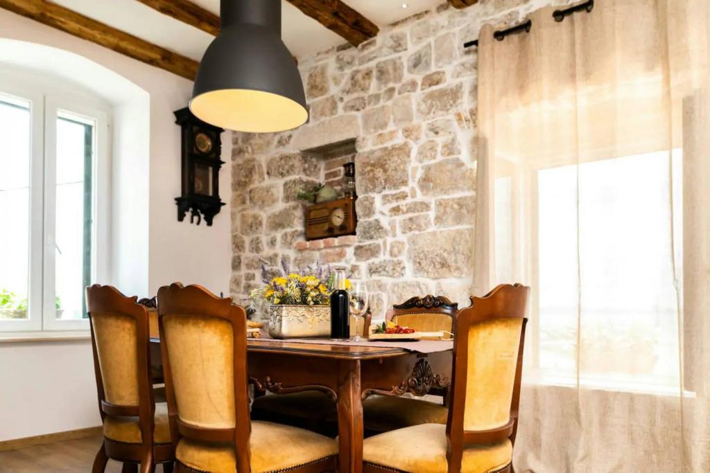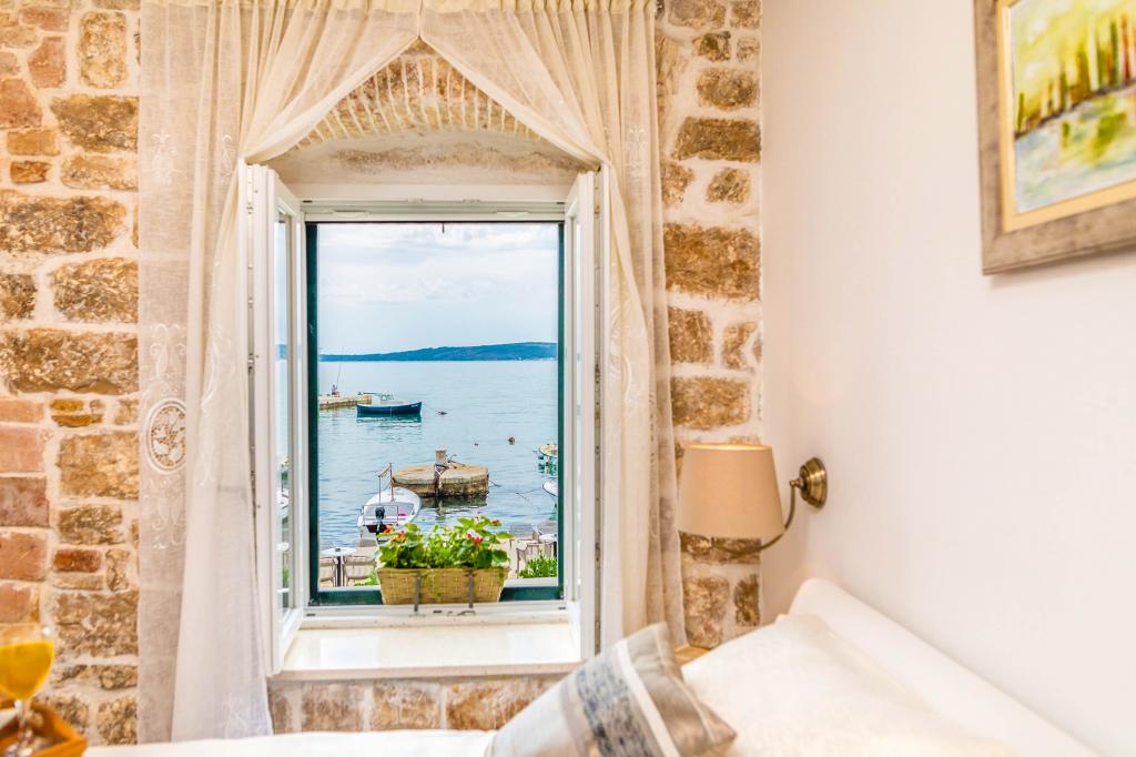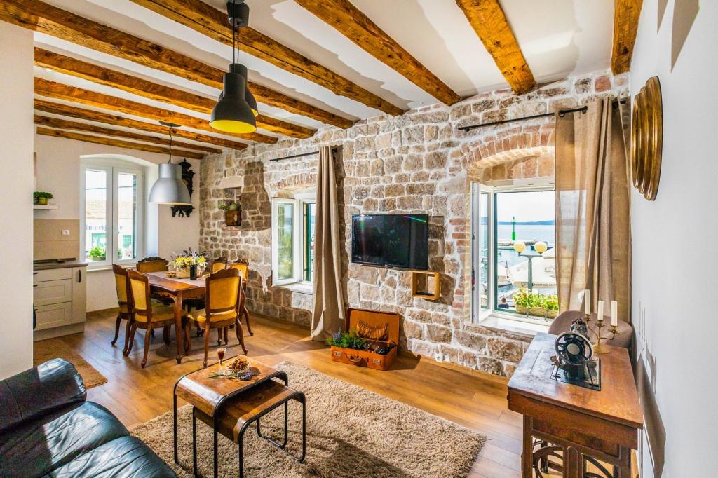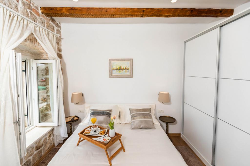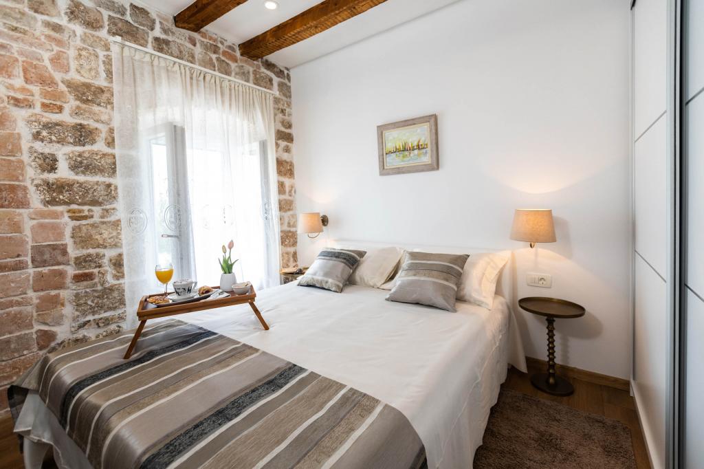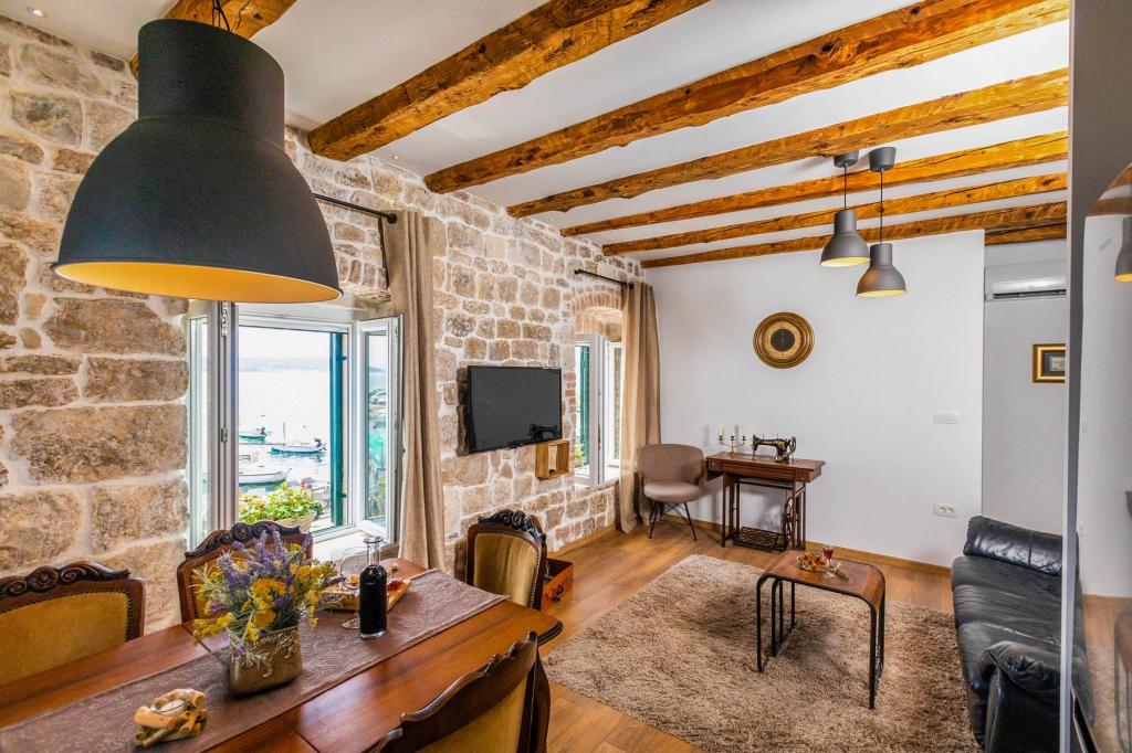 En to værelses, betagende lejlighed, fuldstændig renoveret, dekoreret og udstyret, lige ved havet og en lang promenade. Kombinationen af moderne og antik suppleres med stenvægge, originale træbjælker og originale detaljer fra fortiden. Det er placeret på 1. sal i bygningen, som trætrapper fører til. Takket være dens beliggenhed er denne renæssance-borg-fæstning fra det 15. århundrede fuld af lys og havudsigt fra alle værelser, så du får indtryk af, at du er på en stor balkon, hvorfra du kan følge og føle temperamentet for de lokale, der kan lide at socialisere, tale, skænke, joke, syng og muntre. Vores lejlighed har: placering, stil, elegance, komfort og ægthed.
