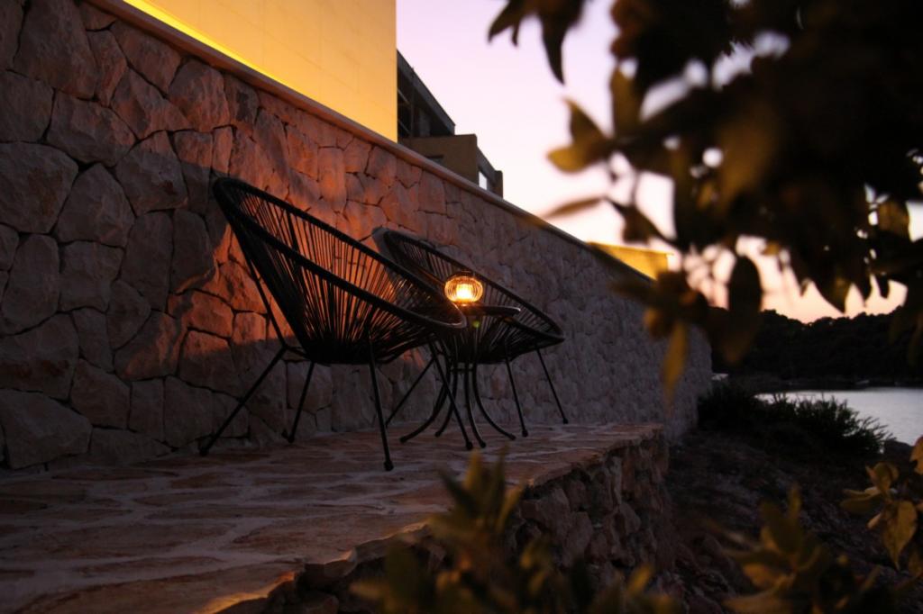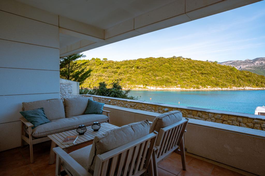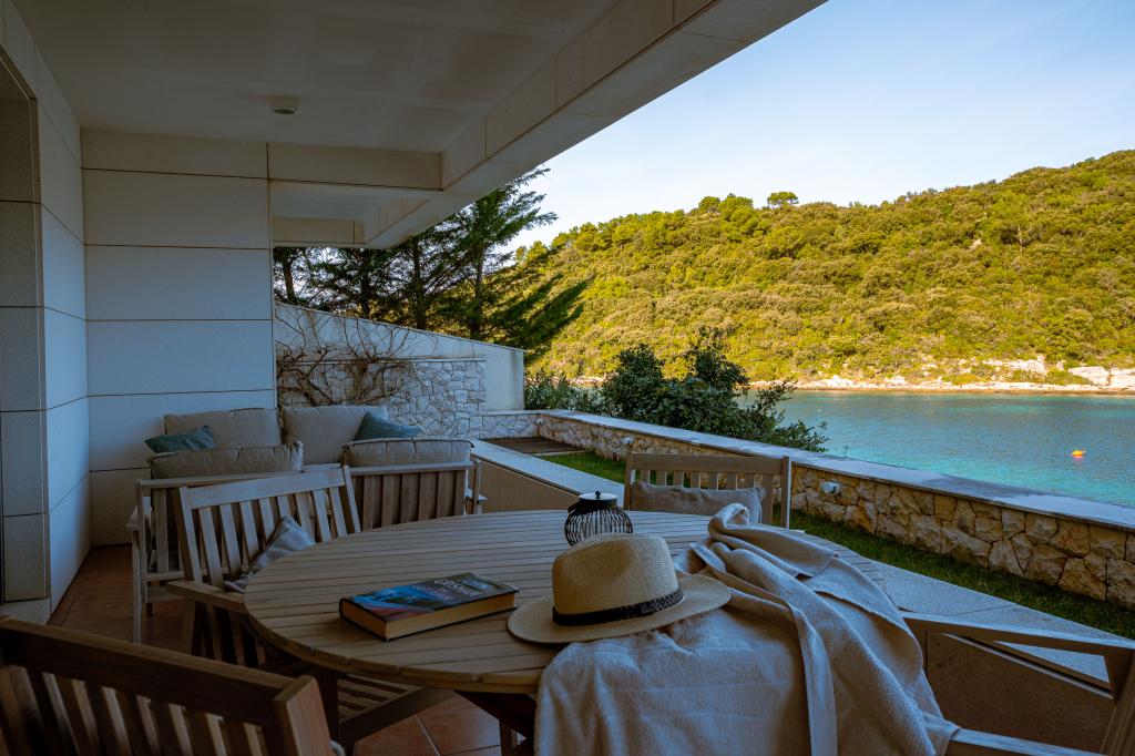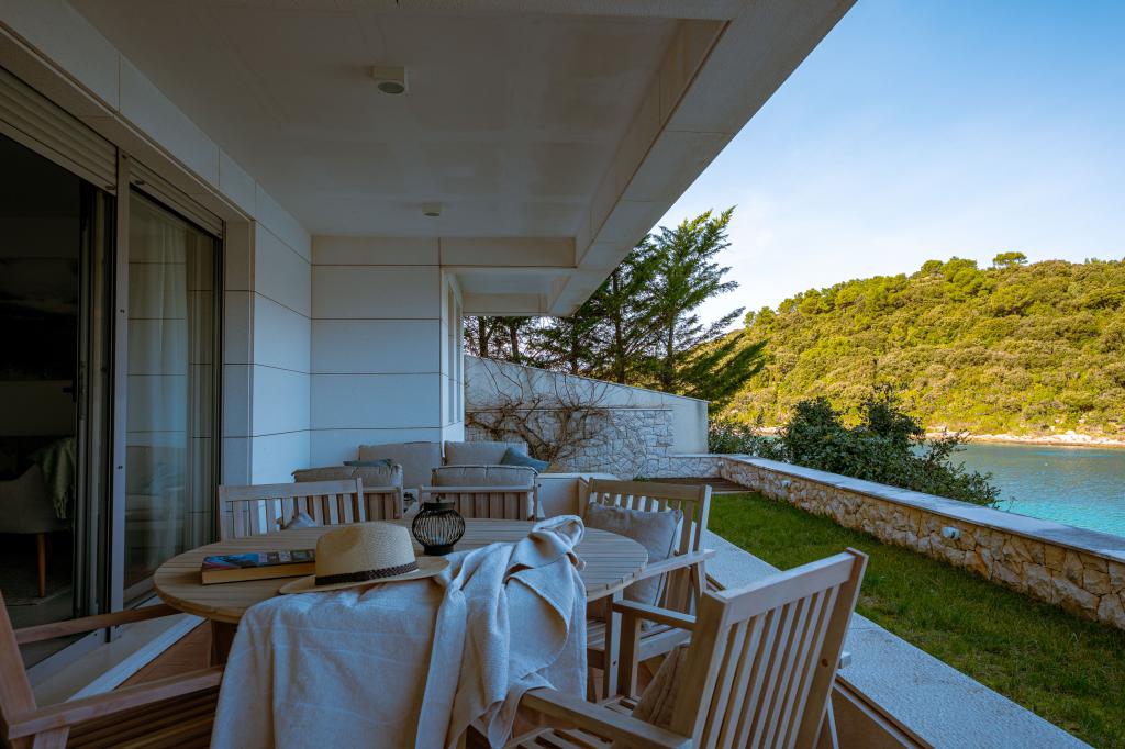 Villa Avantgarde - lejlighed direkte ved havet til 4 personer - meget stille bugt - øen Korčula - Kroatien Det er værket af en berømt kroatisk og verdenskendt arkitekt. Det ligger i en rolig bugt, ca. 4 km fra byens centrum. I villaen råder du over en komfortabel lejlighed på ca. 100 m2, som består af 2 soveværelser, badeværelse, samt stue med veludstyret køkken, spisestue og stue, hvorfra der er udgang til rummelig terrasse med direkte udgang til privat strand. Stranden ligger 9 m fra lejligheden. Der er kun én lejlighed til leje i Villaen. Det er omgivet af velplejede græsplæner, grønne områder, fuglesang og havet. Lukket privat parkering er tilgængelig for gæster. Soveværelset, stuen, spisestuen og terrassen vender direkte mod havet. Den kan bruges hele året, da den er udstyret med centralvarme.
