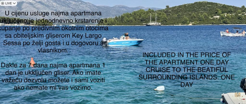 Følgende er inkluderet i prisen for overnatningen: Prisen for leje af lejligheder inkluderer en en-dags krydstogt og svømning på de smukke omkringliggende øer med Key Largo Sessa familie speedbåd efter anmodning fra gæsten og efter aftale med ejeren . Så for 7 dages leje af lejlighed inkluderer 1 dag en speedbåd. Hvis du har et gyldigt kørekort, kan du køre selv, hvis du ikke har det, kører vi dig Vand El SUP board Brug af aircondition Brug af cykler Brug af børnehjørne med rutsjebane og hus Bordtennis Wi-fi Gratis parkering Sengelinned og håndklæder Rengøring af lejlighed Turistskat 1 flaske ekstra jomfru olivenolie Moderne liggestole med parasol Ingen ekstra omkostninger...