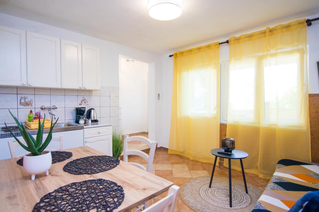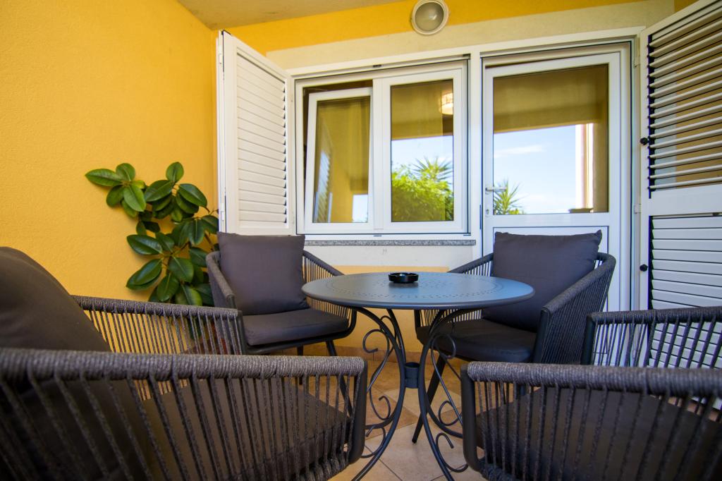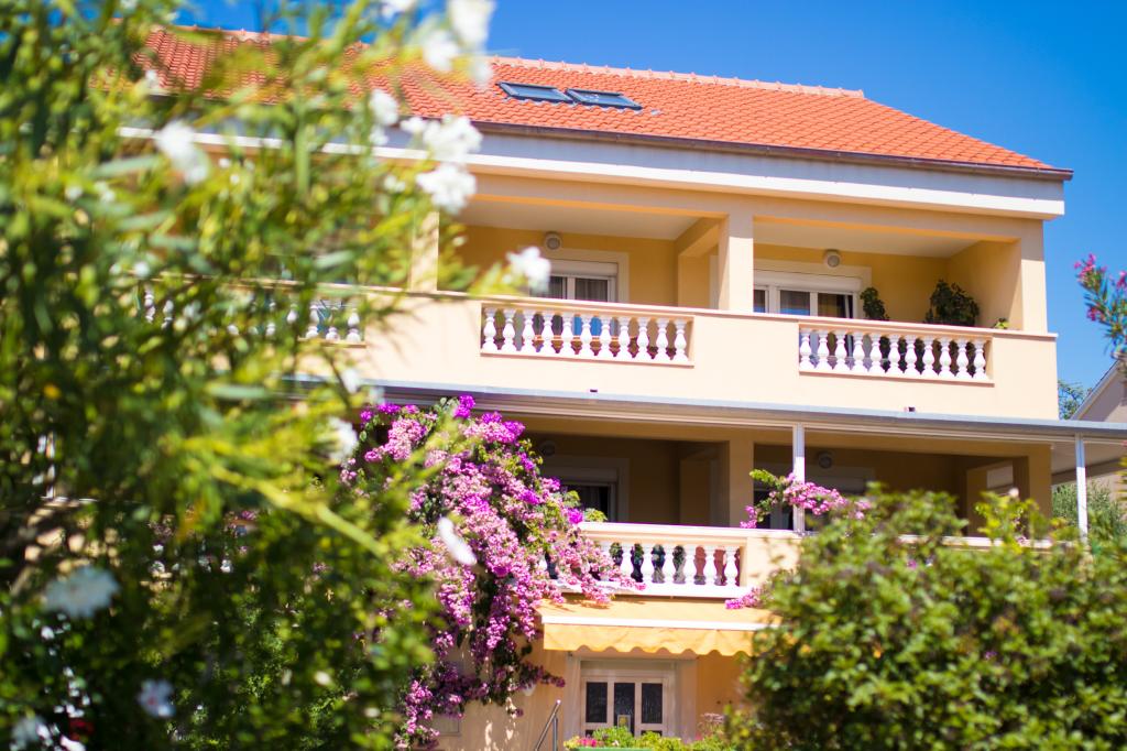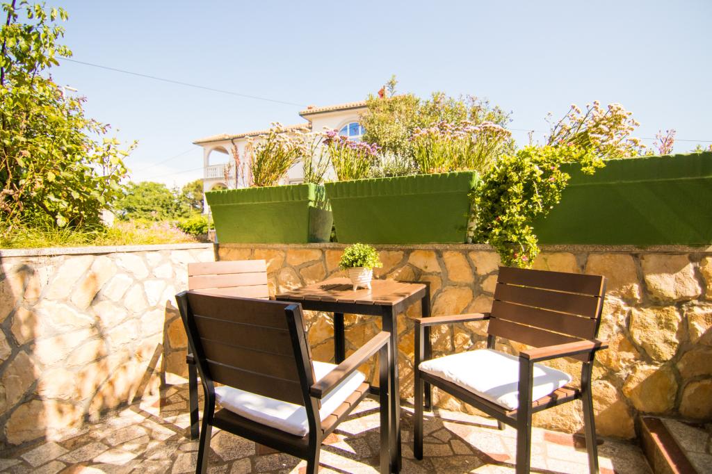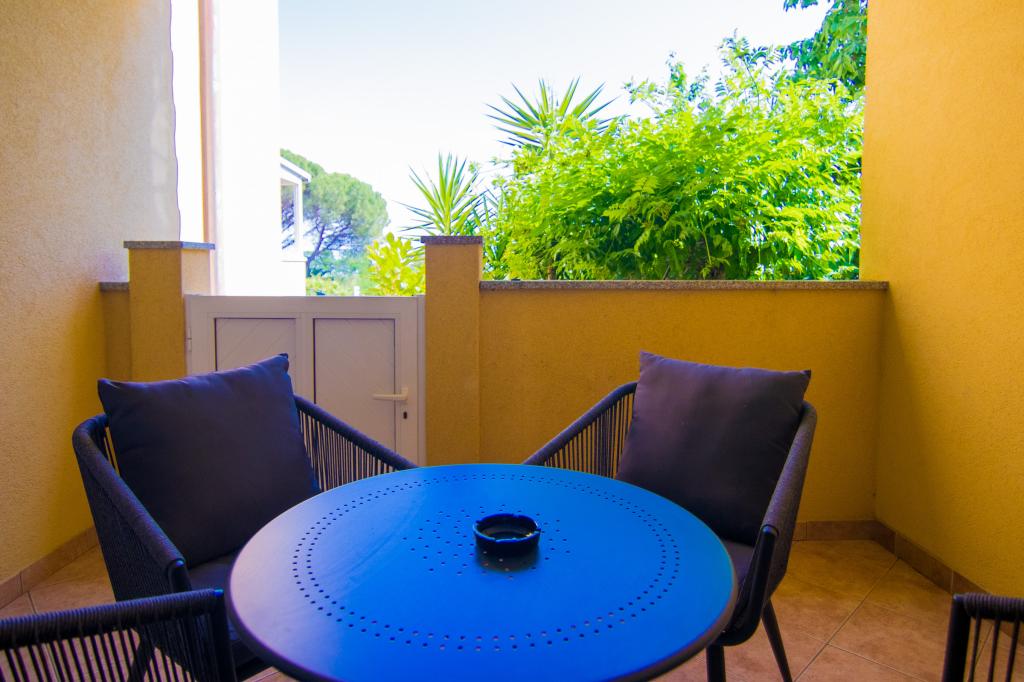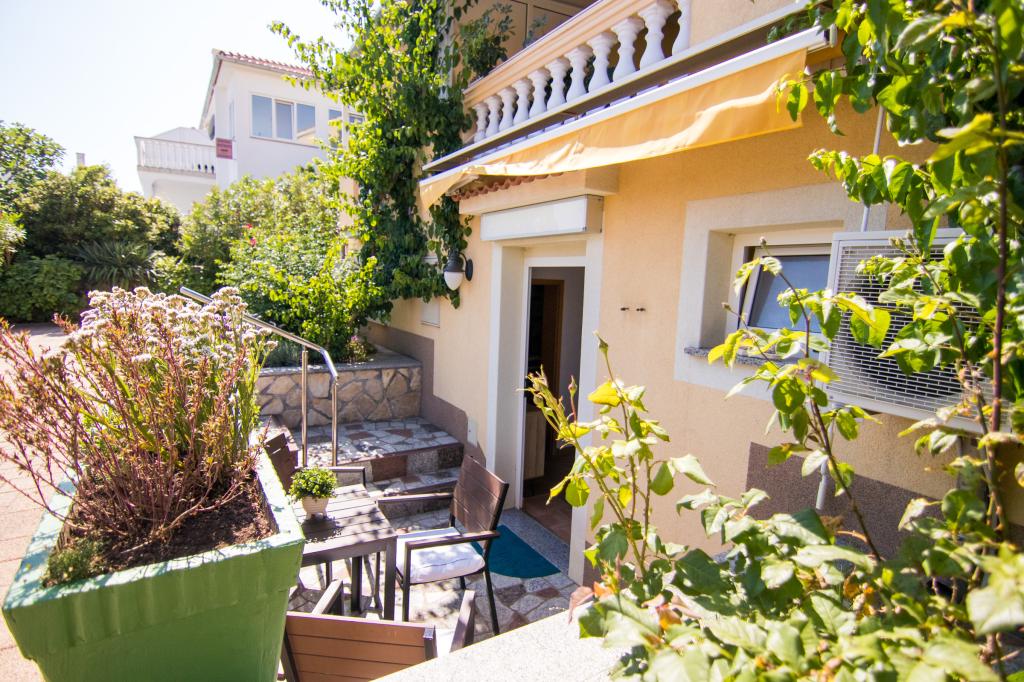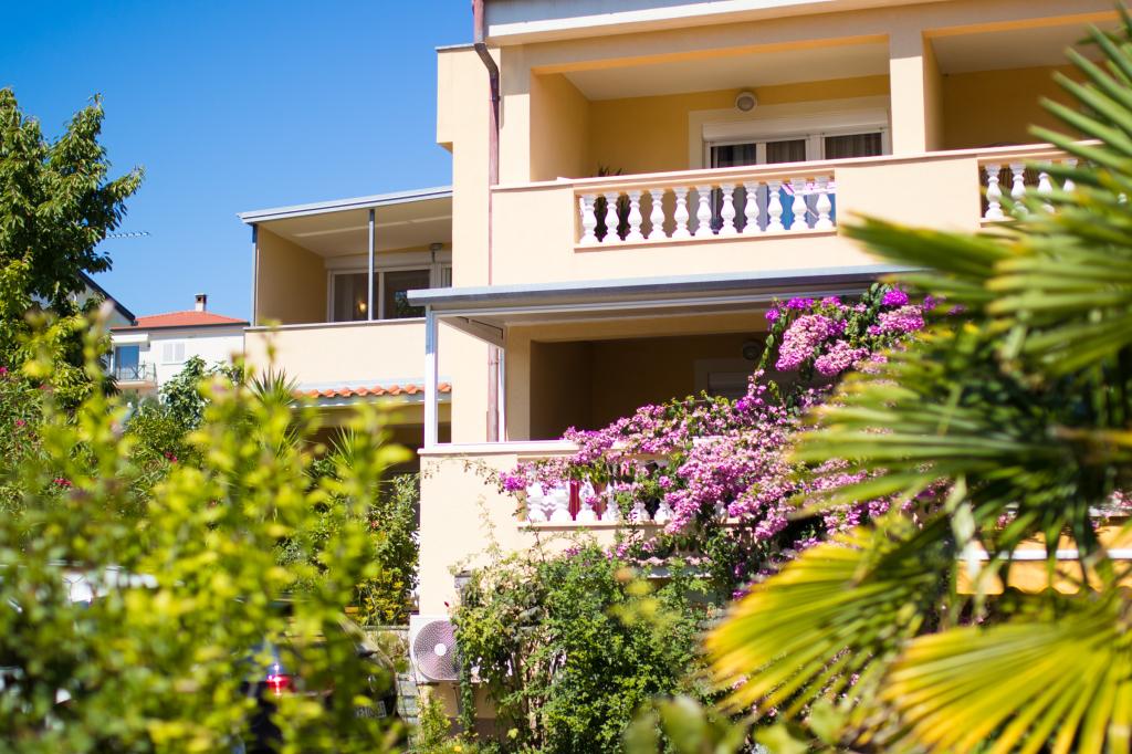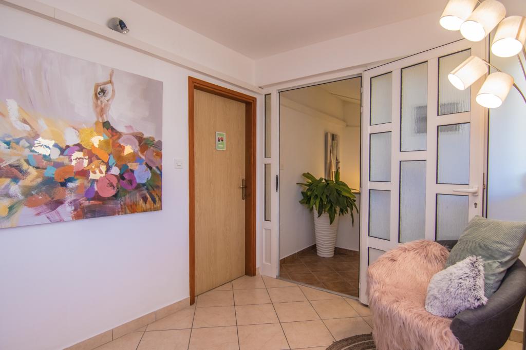 Huset ligger i centrum af byen, kun 90 m fra havet og en smuk promenade med talrige restauranter, caféer og andre faciliteter. Gæsterne kan finde butikker, en bank, et posthus, et apotek og lignende i nærheden af huset. Husets gård er rummelig, hvor der er plads nok til at parkere gæsternes biler. Det er omgivet af middelhavsplanter og blomster. Gæsterne kan også benytte den fælles grill, der ligger bag huset. Alle lejligheder har terrasse eller altan, og nogle lejligheder har endda to terrasser eller to altaner. Kvarteret er roligt og sikkert. Fra nogle lejligheder kan du se havet. Hver enhed har aircondition, satellit-tv, internet og en filterkaffemaskine.