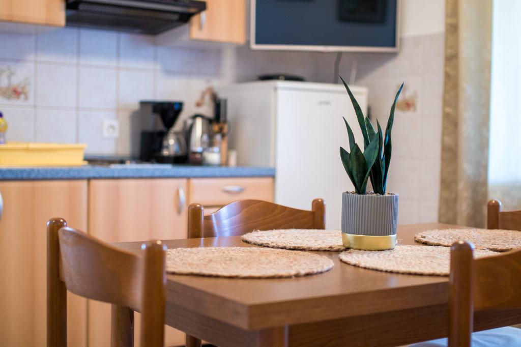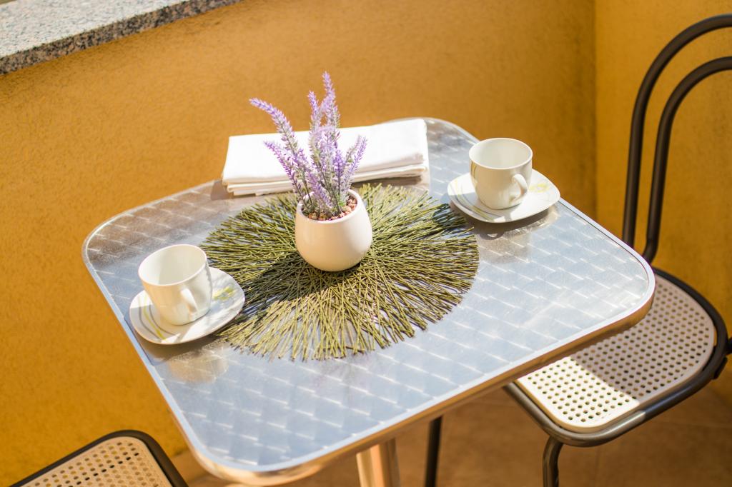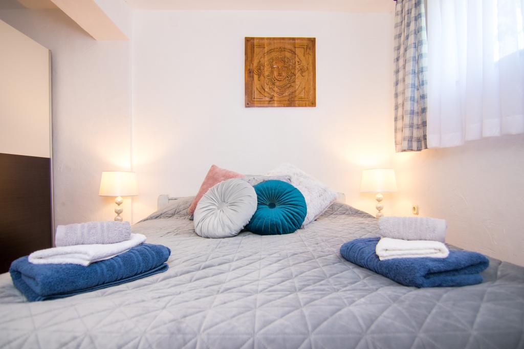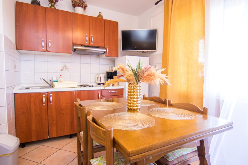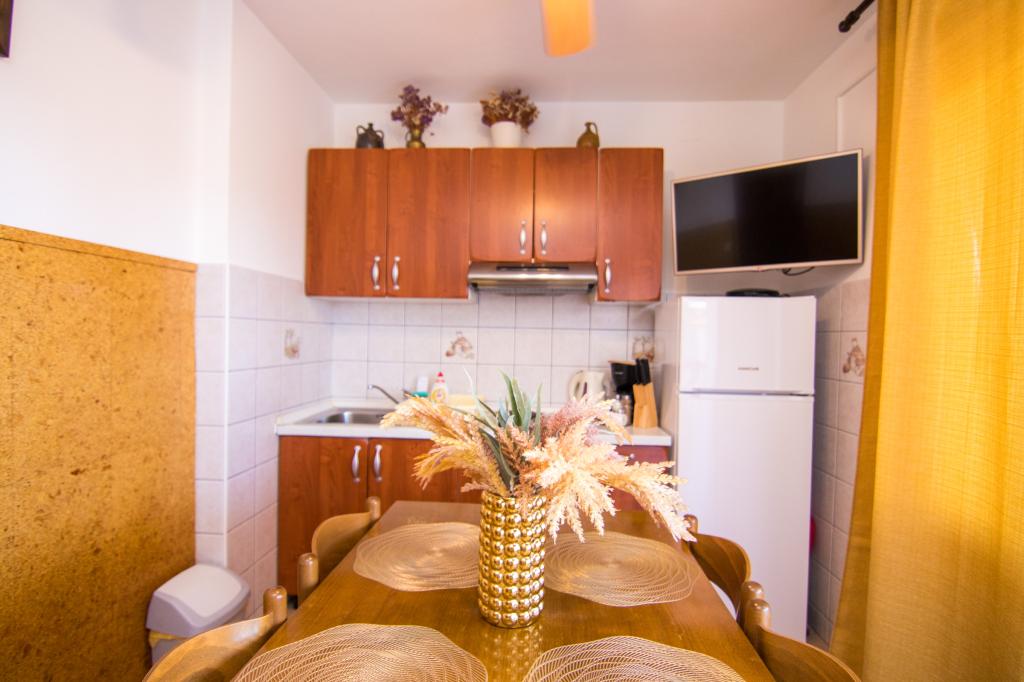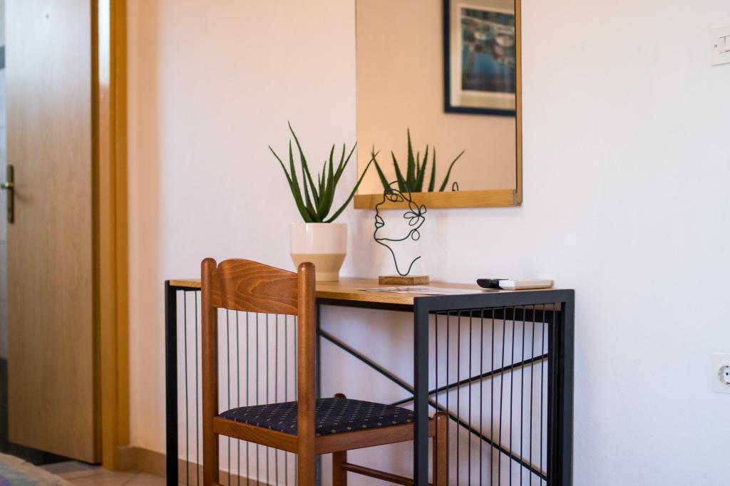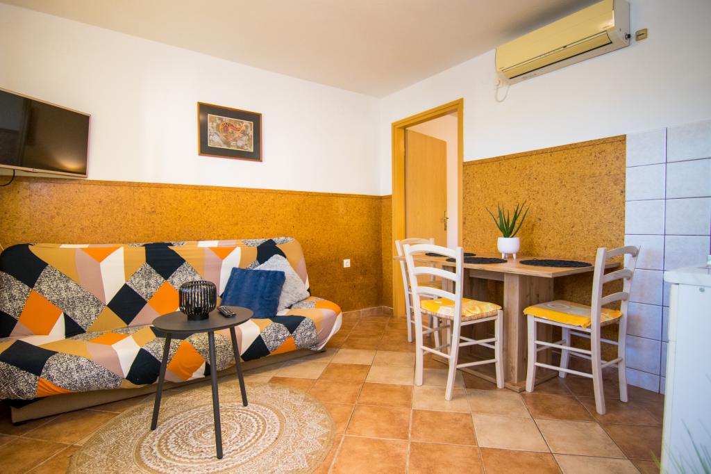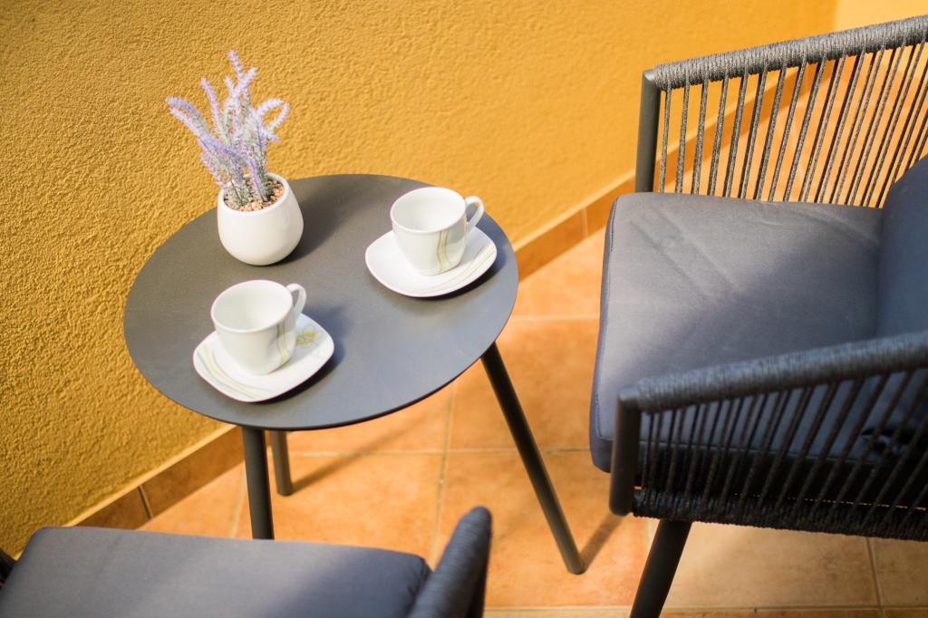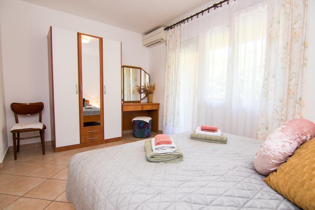 Huset ligger i centrum af byen, kun 90 m fra havet og en smuk promenade med talrige restauranter, caféer og andre faciliteter. Gæsterne kan finde butikker, en bank, et posthus, et apotek og lignende i nærheden af huset. Husets gård er rummelig, hvor der er plads nok til at parkere gæsternes biler. Det er omgivet af middelhavsplanter og blomster. Gæsterne kan også benytte den fælles grill, der ligger bag huset. Alle lejligheder har terrasse eller altan, og nogle lejligheder har endda to terrasser eller to altaner. Kvarteret er roligt og sikkert. Fra nogle lejligheder kan du se havet. Hver enhed har aircondition, satellit-tv, internet og en filterkaffemaskine.
