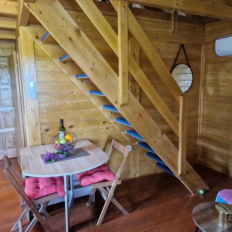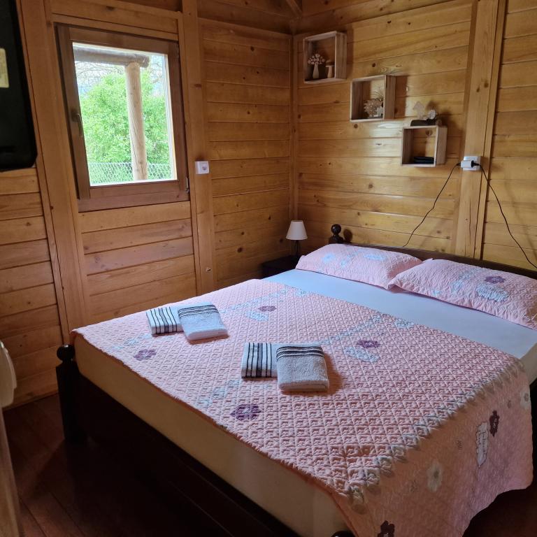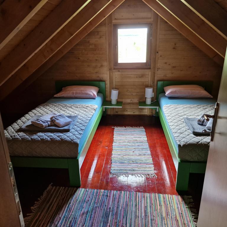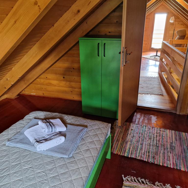 Et træhus til ferie i naturen, beliggende i en lille, tyndt befolket slavisk landsby. Ideel til en flugt fra hverdagens pligter og en sand hvile med fuglesang og det daglige besøg af et forelsket par. Huset består af en stueetage med soveværelse, køkken, stue, badeværelse og stor overdækket terrasse. På første sal er der et åbent galleri med plads til læsning og afslapning med udsigt over søen og et soveværelse med to senge. Huset har også en blandet frugthave med snesevis af træer af forskellige frugter og bær, som gæsterne kan bruge, når der er noget i haven (en mulig mulighed er at plukke dem til eget behov, lave hjemmelavet marmelade af frugter fra økologisk landbrug og tag det som en souvenir). Kilometer af naturstier åbner før gæsten, velegnet til cykling, gåture, udforskning. De omkringliggende attraktioner er let tilgængelige, og huset er et ideelt udgangspunkt for at opdage Slavonien.