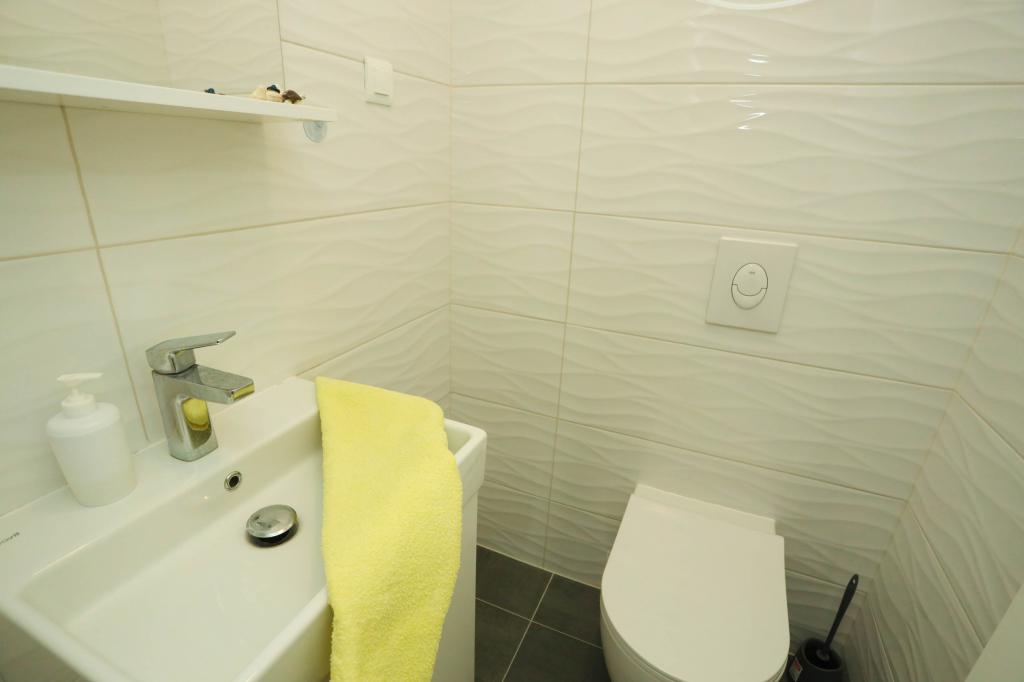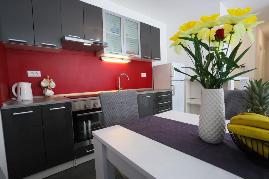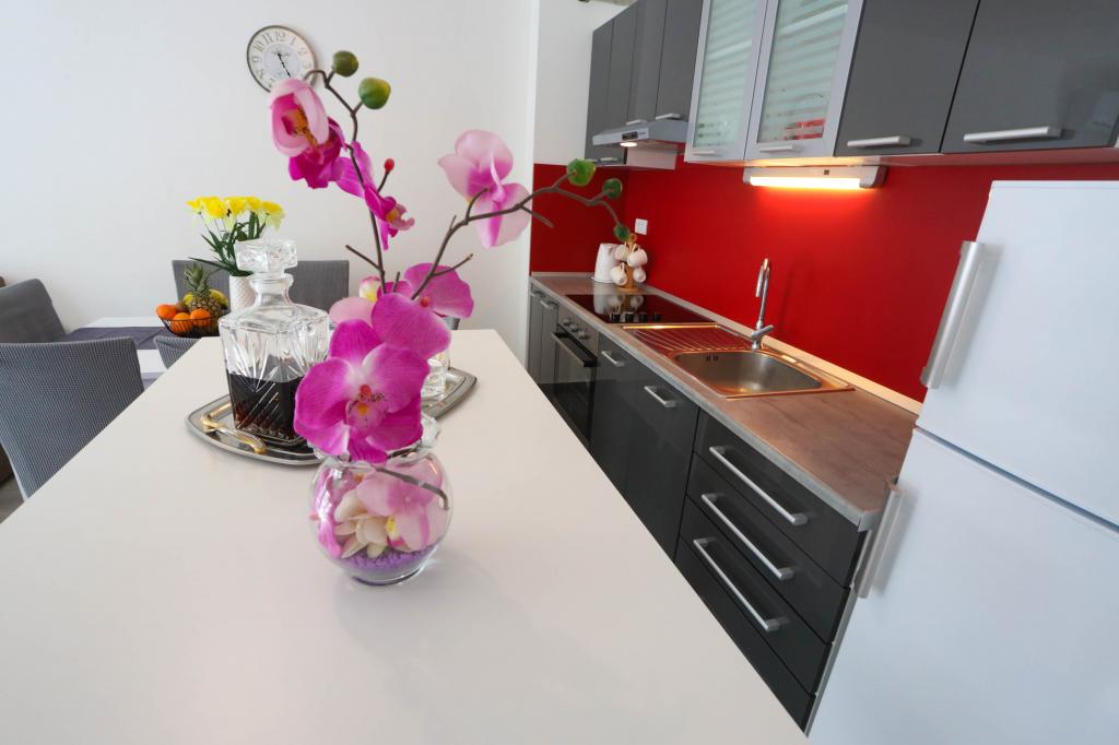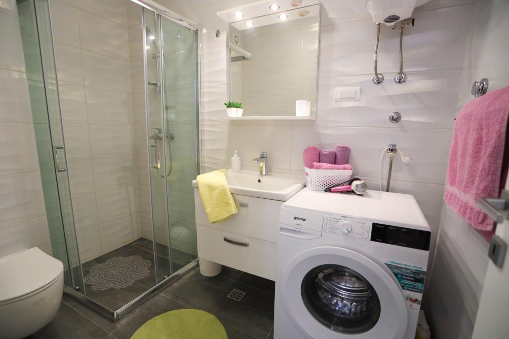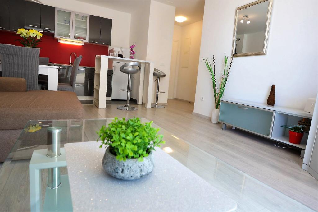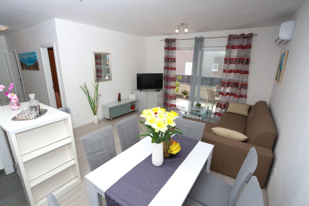 Moderne udstyret lejlighed på første sal i en ny boligbygning med elevator. Lejligheden har alt hvad du behøver for et behageligt ferieophold. Lejlighed Petra består af en spisestue med et udstyret køkken, en stue med en sovesofa, der fungerer som en ekstra seng, et badeværelse og et lille toilet samt to soveværelser. Det ene værelse har en dobbeltseng, og det andet har to senge, der kan adskilles om nødvendigt. Ejendommen ligger 5 minutters gang fra centrum eller den nærmeste strand. I nærheden er der en butik og en sportsplads til rekreation.
