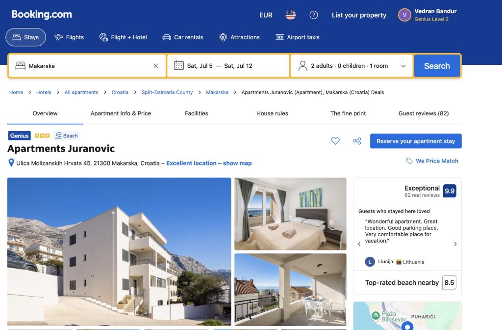 Apartments Juranović ligger i Makarska, blot 250 meter fra Makarska-stranden, og tilbyder indkvartering med havudsigt, gratis WiFi og gratis privat parkering. Samtlige ferieboliger i lejlighedskomplekset har aircondition, opholdsområde, fladskærms-tv, køkken, spiseplads samt eget badeværelse med hårtørrer, bruser og vaskemaskine. Der er også ovn, køleskab, komfur samt kedel. Vores personale står til rådighed for rådgivning og assistance under hele dit ophold.