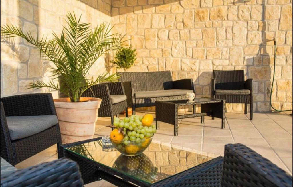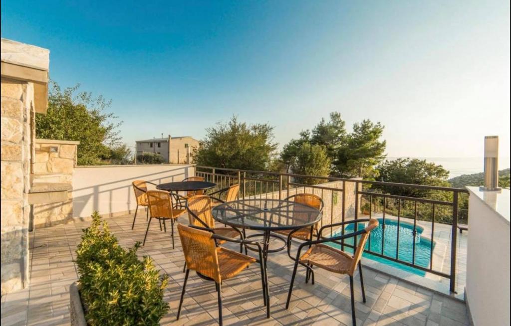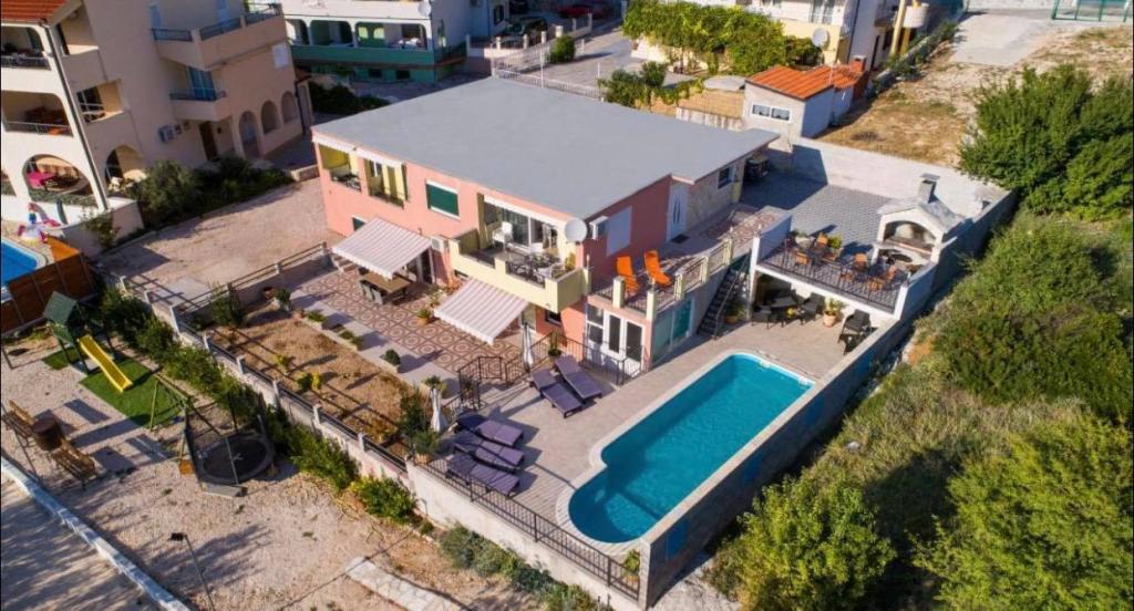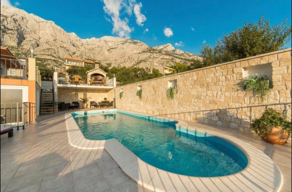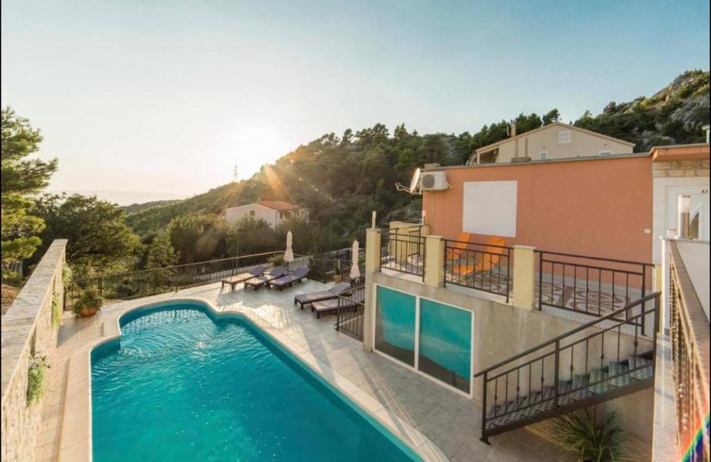 Huset har en swimmingpool og en terrasse med grill