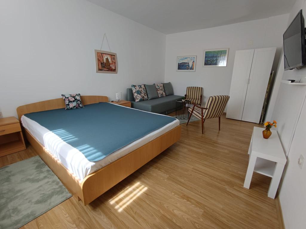 Studielejlighed til maks. 3 personer, består af et værelse med en dobbeltseng og en ekstra seng, et køkken, et badeværelse og en terrasse. Parkering til bilen er placeret i husets gård. Lejligheden er fuldt møbleret. Det tager 5-8 minutter at gå til den nærmeste strand, og i nærheden er der butikker, et marked, et center, restauranter, en busstation... Strandene er hovedsageligt småsten og beton. Rolig beliggenhed.