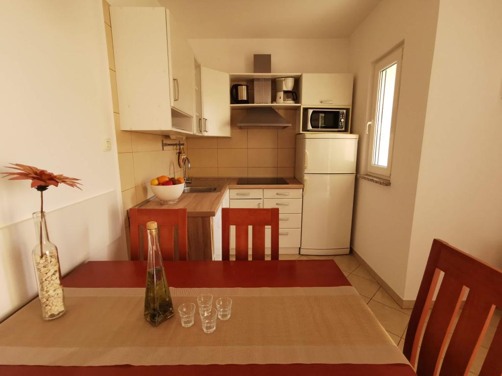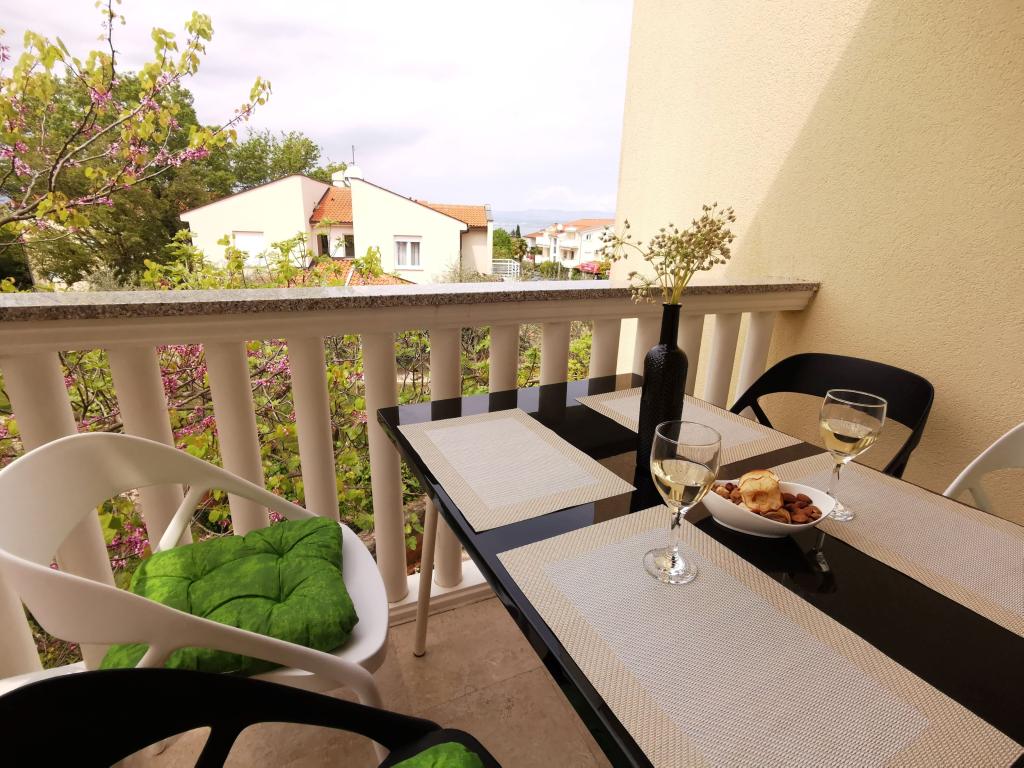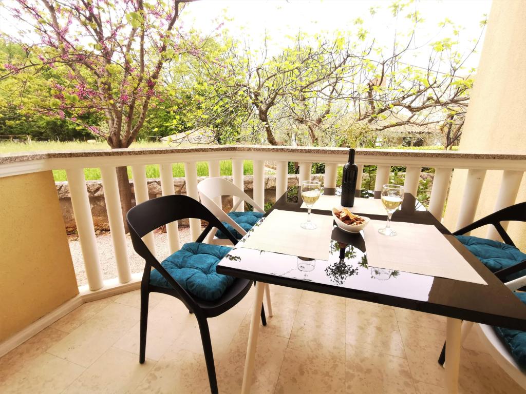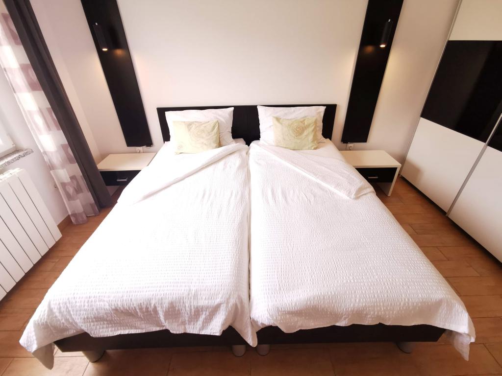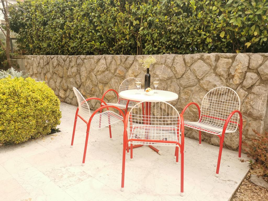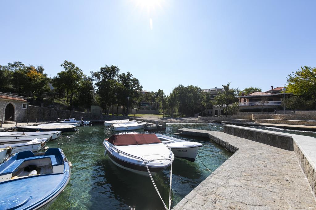 To fuldt møblerede lejligheder med separate indgange og sikrede parkeringspladser i egen lukket gårdhave og naturlig skygge. Hver lejlighed har aircondition og terrasse. Begge har WiFi, satellit-programmer, mikroovn, køleskab med fryser, brødrister, filter kaffemaskine, vandvarmer, hårtørrer, med sengelinned og håndklæder. Alle værelser har myggenet på vinduerne. Det er 10 minutters gang til den nærmeste strand og 40 minutters gang til centrum af Malinska. Lejlighederne er en del af et familiehus i en rolig del af Malinska og er omgivet af grønne områder.