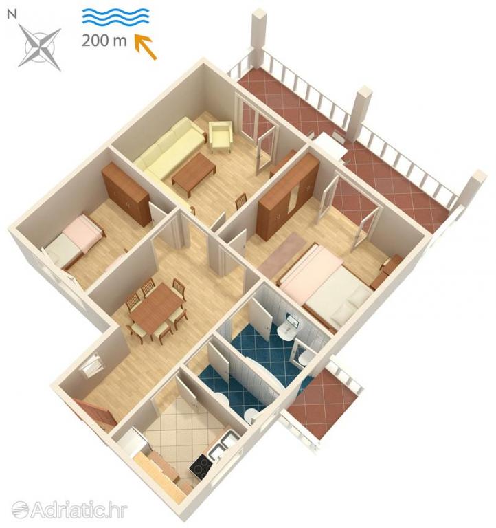 Apartments Karmelić er beliggende i en rolig del af Malinska, i umiddelbar nærhed af havet og en smukt anlagt strand, og kun 10 minutters behagelig gåtur til centrum. I bygningen er der en studielejlighed til 2 personer og en lejlighed til 4-6 til, Kategoriseret med 4*, fuldt udstyrede lejligheder med alt nødvendigt for hvile og nydelse. Værterne bor i nabobygningen og står til din tjeneste med deres venlighed og gæstfrihed, når du ønsker det. For alle lejlighedens gæster er der parkering inden for anlægget og gratis WI-FI, gratis brug af fælles vaskerum og ubegrænset brug af fælles grill i haven. Stranden på hotellet Malin ligger kun 3 minutters gang fra lejligheden, og byder på utallige faciliteter til afslapning og nydelse - lige fra parasoller og liggestole, barer, restauranter til vandsport, og børn nyder især stederne til leg og ubekymret svømning. Mange organiserede udflugter til steder på Krk og de omkringliggende øer, et væld af kulturelle og underholdningsbegivenheder vil gøre din ferie uforglemmelig.