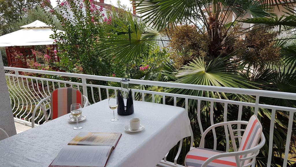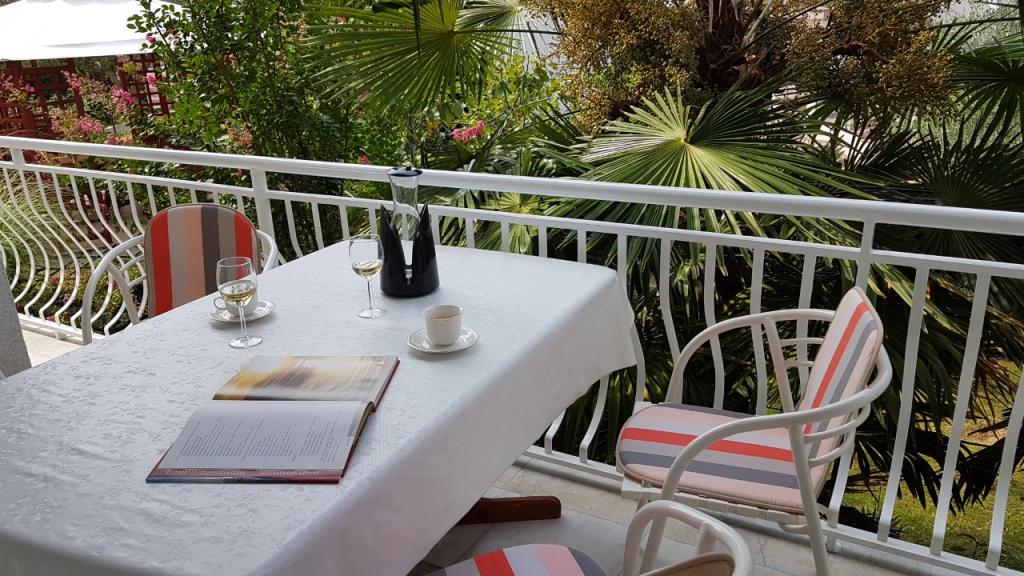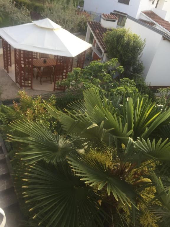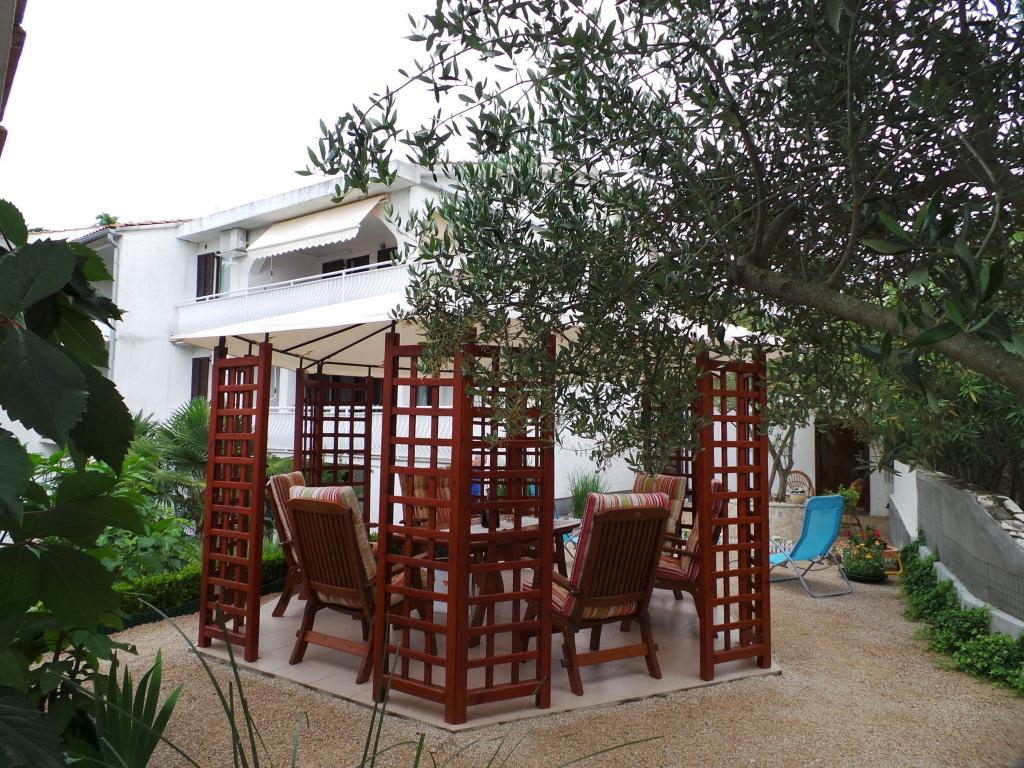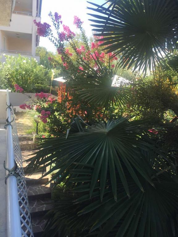 Udsigt over haven og pavillonen, hvor gæsterne om aftenen nyder et romantisk miljø med diskret belysning og blomster med et glas god vin og grillede delikatesser. Duften af lokale fiskespecialiteter kommer fra den nærliggende fiskerestaurant / 200 m fra lejligheden /. Yderligere faciliteter i nærheden: bowling, ridning, forskellige vandsport, cykeludlejning, både, organiserede udflugter, lange og smukke promenader er stedets muligheder.