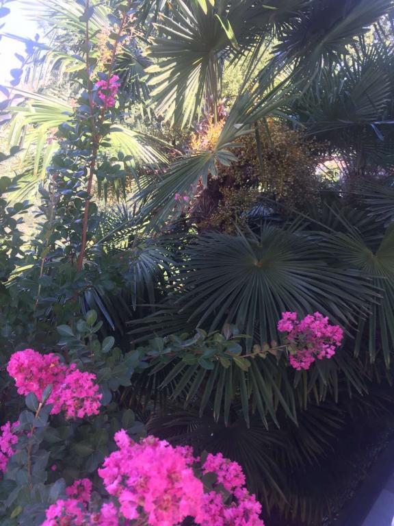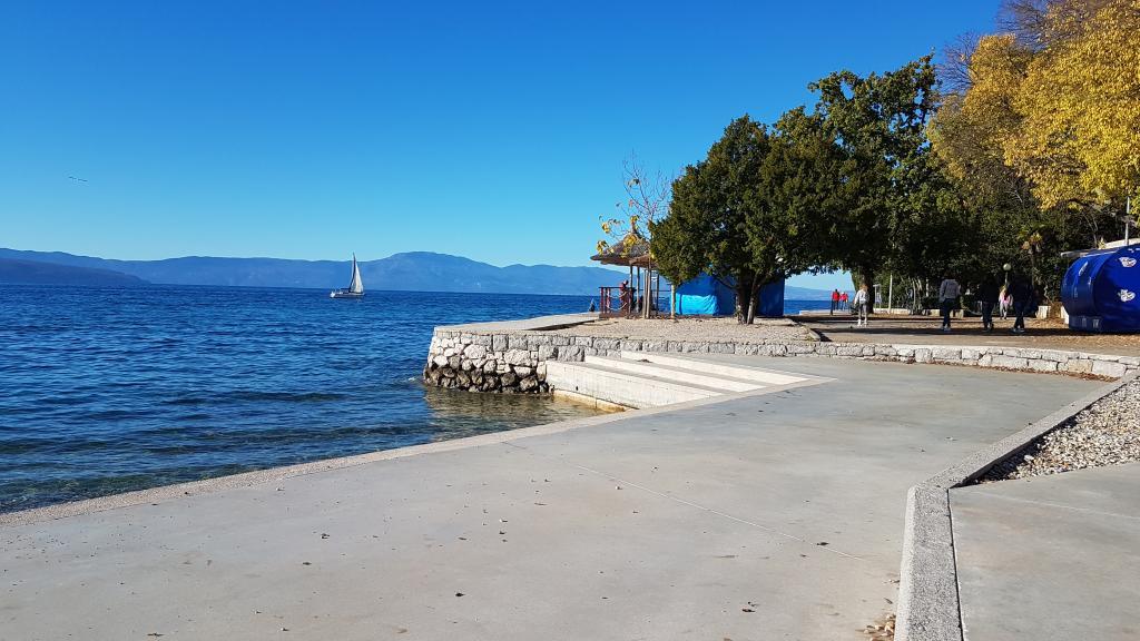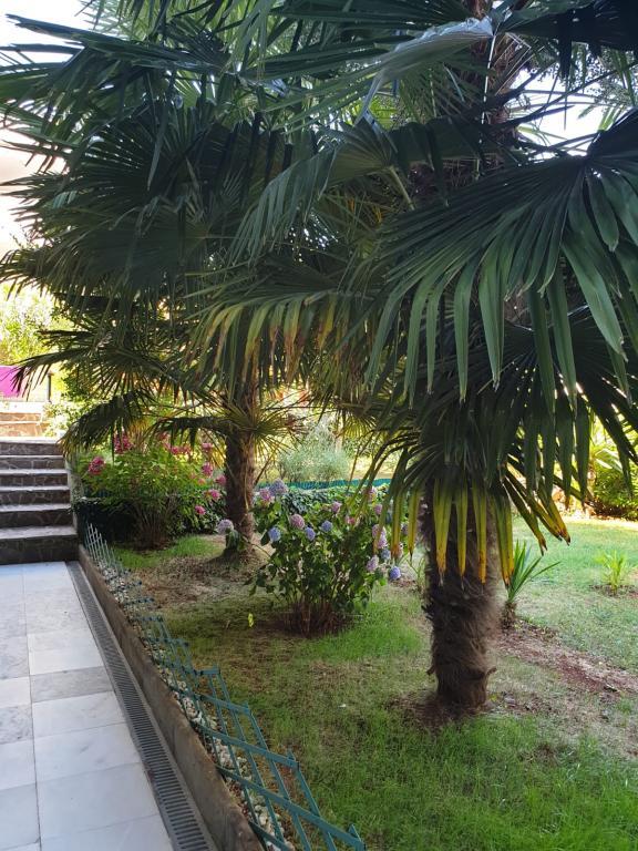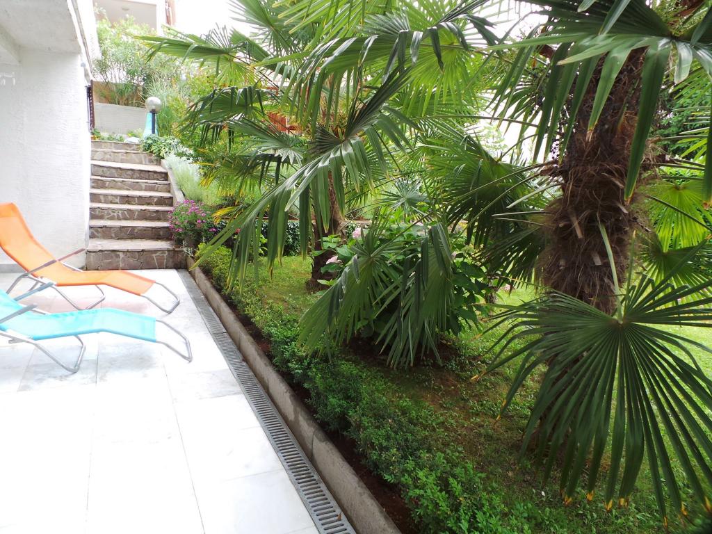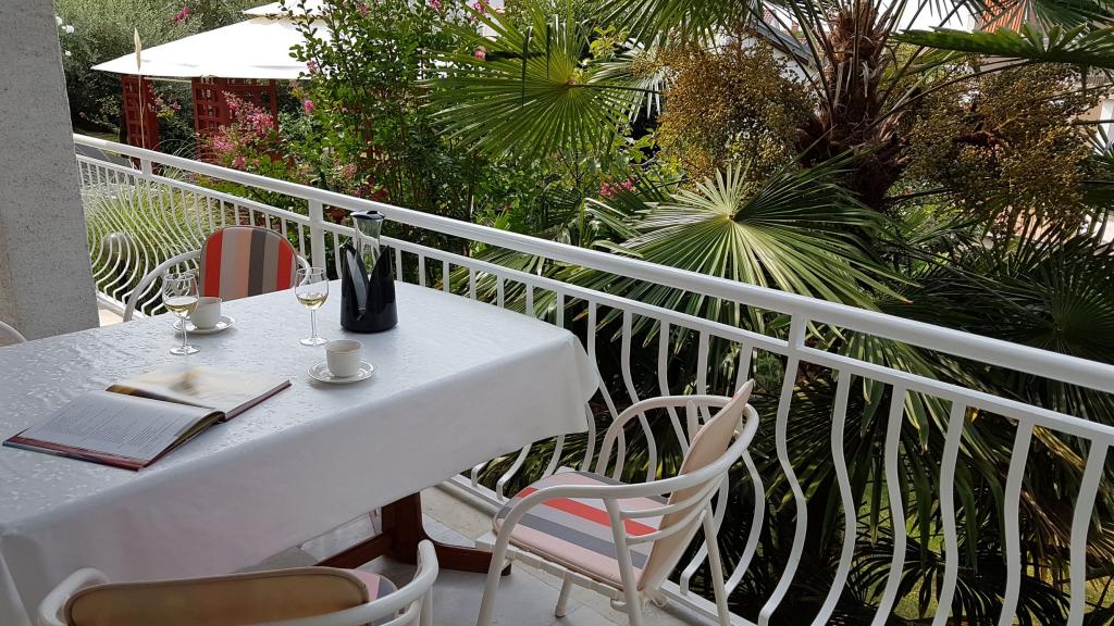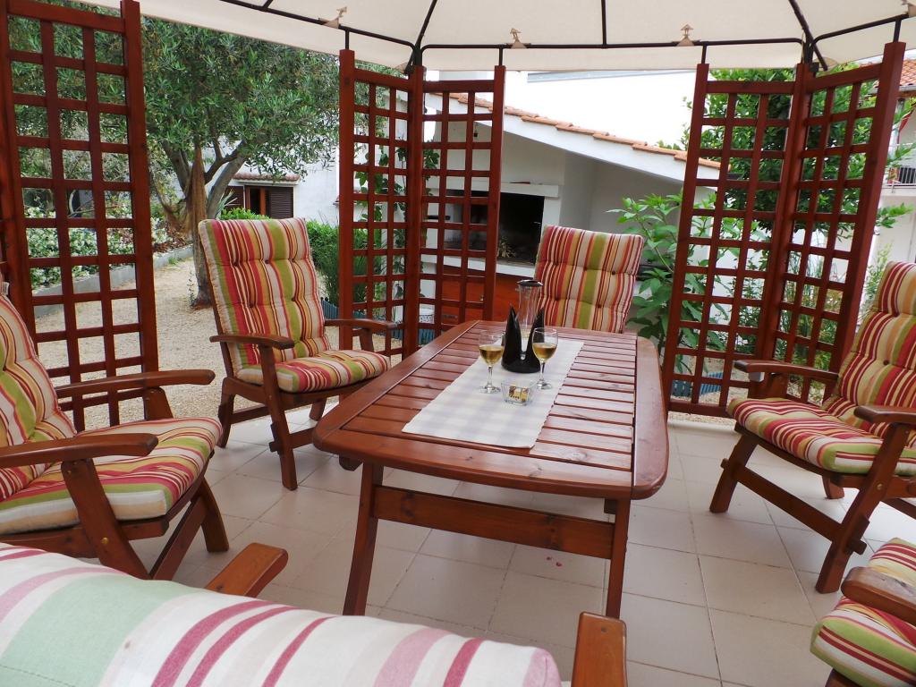 Udsigt over haven og pavillonen, hvor gæsterne om aftenen nyder et romantisk miljø med diskret belysning og blomster med et glas god vin og grillede delikatesser. Duften af lokale fiskespecialiteter kommer fra den nærliggende fiskerestaurant / 200 m fra lejligheden /. Yderligere faciliteter i nærheden: bowling, ridning, forskellige vandsport, cykeludlejning, både, organiserede udflugter, lange og smukke promenader er stedets muligheder.