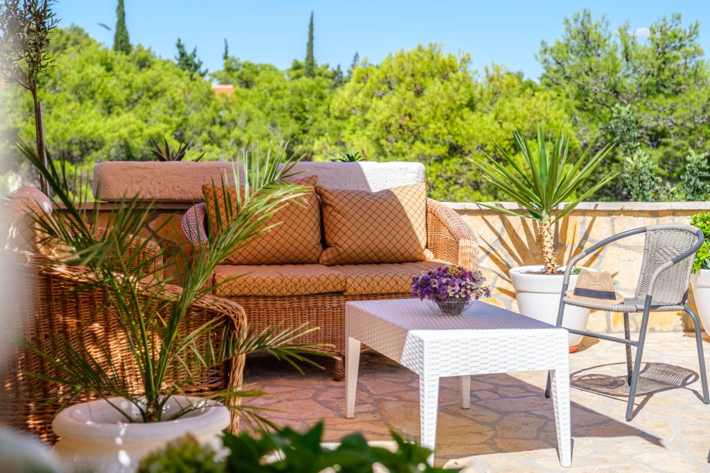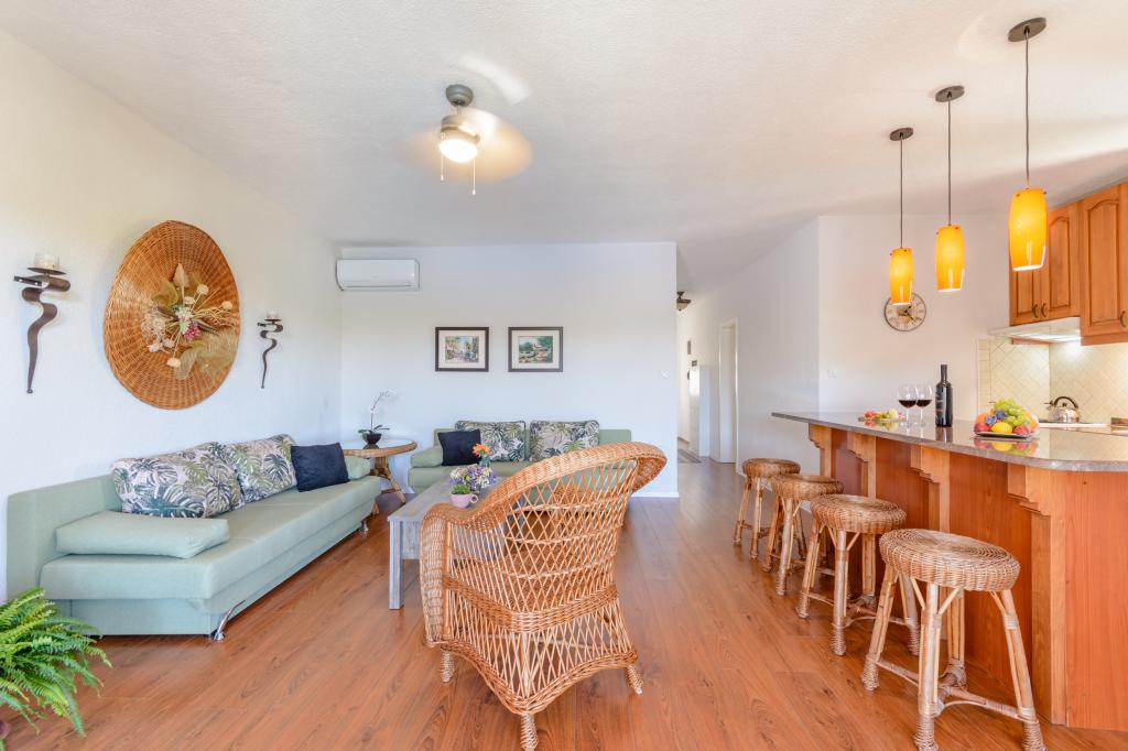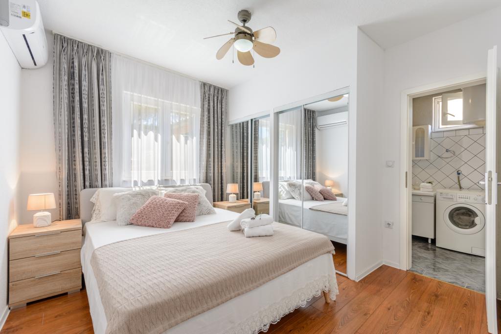 Nye, luksuriøse og moderne udstyrede lejligheder med aircondition, wifi, TV, egen indgang, parkering og smukke private terrasser med havudsigt. Alle vinduer og terrassedøre er beskyttet med myggenet. Lejlighed nr. 1 (4+2 personer) har udover et rummeligt køkken, stue og overdækket terrasse (12m2) 2 soveværelser og 2 badeværelser tilknyttet soveværelserne, hvoraf det ene har vaskemaskine. Lejlighed nr. 2 (2+2 personer) har 1 soveværelse, et badeværelse, køkken, stue og en stor terrasse (30m2), der er delvist overdækket med vinranker. Ud over madrasser af høj kvalitet har lejlighederne luksuriøse lagner (satin) og håndklæder, hårtørrer og strygejern. Køkkenet er udstyret med alt nødvendigt service, glas, køkken- og spiseredskaber, opvaskemaskine, stort køleskab og fryser, komfur med ovn, kaffemaskine, brødrister, mikrobølgeovn og elkedel. Gæsterne kan gratis benytte håndklæder, liggestole og parasoller til stranden samt vaskemaskine og gasgrill.