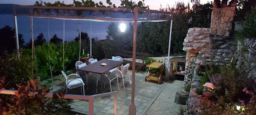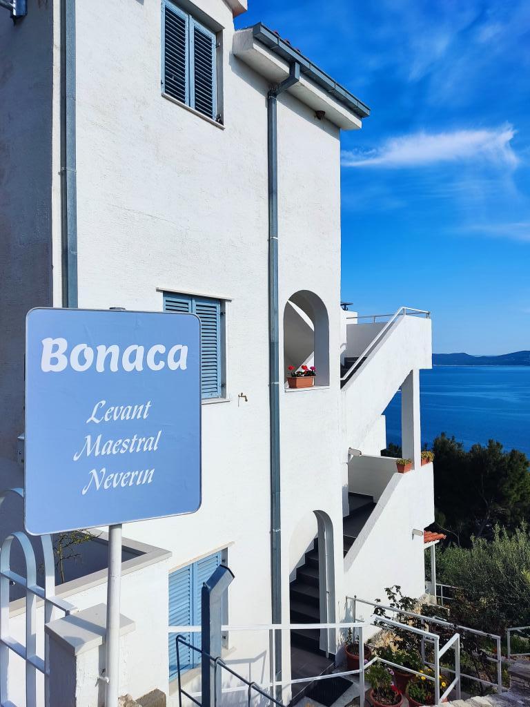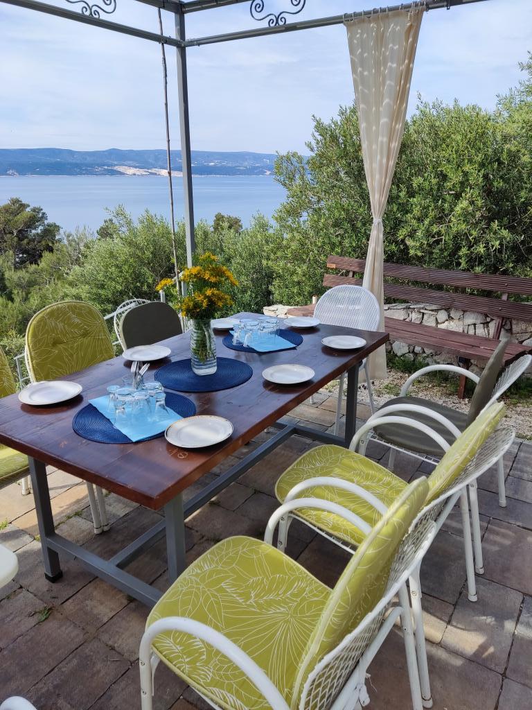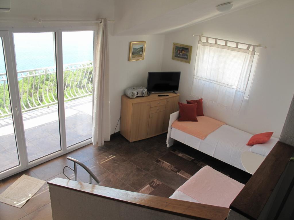 Vi byggede vores hus som et familiehjem, der indeholder 3 rummelige lejligheder, en på hver etage og separate store terrasser. Omkring huset er der et fællesområde med grill og lysthus. Terrasserne tilbyder en smuk udsigt over de nærliggende øer og Pelješac-halvøen. Huset er omgivet af små haver, hvor der vokser hjemmehørende planter som lavendel, rosmarin, lyng og salvie, og alt er omgivet af håndlavede traditionelle stenmure. Der er også flere oliventræer, hvis frugter vi laver olie af, som vi pakker som små souvenirs til vores gæster. Bag huset er der en stor parkeringsplads, der er oplyst om natten, kun for vores gæster. Der er liggestole og gynger til børn i haven. Den smukke sand- og stenstrand (300 m fra huset) kan nås til fods/gennem en tunnel under hovedvejen eller i bil. Der er tre andre lignende strande i umiddelbar nærhed.